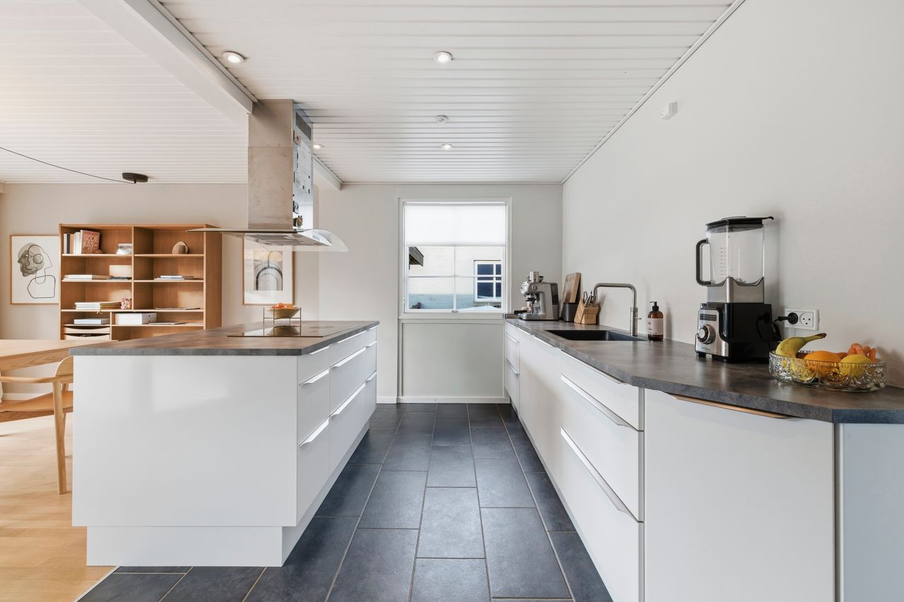 Smuk beige tone i tone, som taget ud af et boligmagasin – et hjem, der straks føles rart at træde ind i. Planløsningen er anderledes og spændende med forskudte niveauer, og både ude og inde møder man detaljer, der er tænkt igennem: nye sprossevinduer som et blikfang, en renoveret underetage som en helt ny afdeling og en ro, der hører strandsiden til – dér hvor duften af sand og vand bliver hængende.