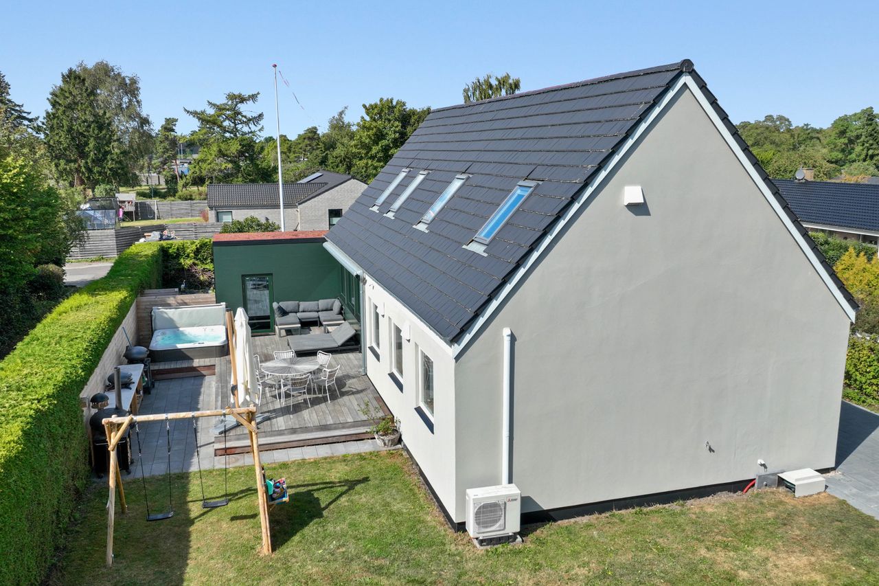 Bag den tætte hæk, hvor verden trækker sig lidt tilbage, ligger en bolig med noget på hjerte. Ikke bare tiptop og nyistandsat/tilbygget – men gennemtænkt, sanselig og fuld af varme. Alt er om- og tilbygget fra 2018 og frem, og resultatet er en nutidig bolig med en moderne, arkitektonisk flot tilbygning med sedumtag. I alt får du 278 etagemeter – heraf 75 kvadratmeter i en isoleret spændende anneksbygning, der står som sin egen lille verden i haven. Et unikt supplement til boligen, der tilfører ekstra lag af både liv og muligheder. Her er plads til de små fødder, de store armbevægelser – og det stille nærvær.