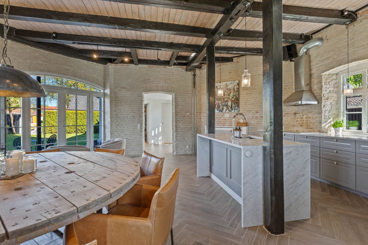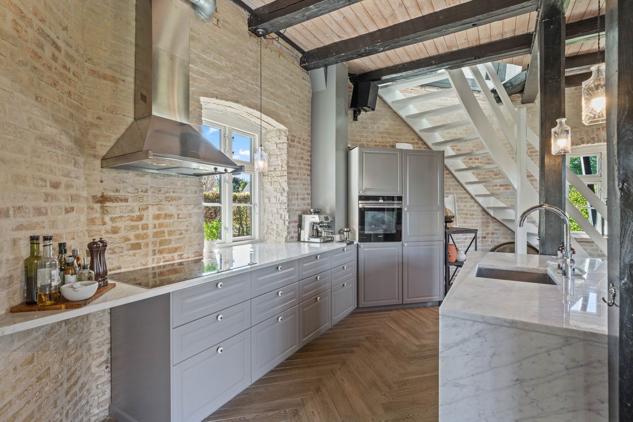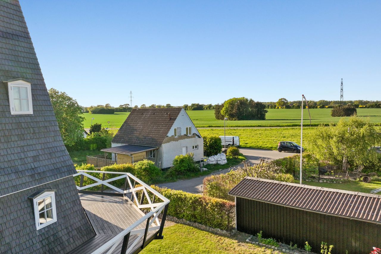 Det siges, at møllens top vejer over fire tons – og alligevel balancerer den yndefuldt over landskabet, som stod den på tåspidser. Indenfor åbenbarer hjemmet sig som noget ganske særligt – nænsomt restaureret i 2019. Rå murstensvægge, synligt træværk og sprossede vinduer skaber en stemning, hvor tid og tilstedeværelse får lov at fylde. Hvert materiale er valgt med omhu, og hver vinkel rummer sin egen stemning. Køkken/alrummet er et ægte samtalekøkken – et rum med sjæl og rummelighed, hvor man både kan samles og trække sig tilbage. Der er plads til et stort spisebord, loungestole med kig til haven og et hverdagsliv i roligt tempo. De grå elementer står smukt mod marmorbordpladen, og de fine porcelænsgreb tilfører et klassisk præg. De dobbelte glasdøre åbner ud til terrassen og trækker dagslyset ind, så inde og ude flyder sammen i ét naturligt åndedrag. Badeværelset er gennemført og æstetisk med sandfarvede fliser, rustik vask og vægge i en blød grøn tone, der skaber ro og varme. På førstesalen venter en hyggelig stue og to værelser – det hele med glasdøre til rundgangen, hvor udsigten åbner sig i alle retninger. Heroppe mærker man virkelig, at man bor hævet over hverdagen, med himlen tættere på og landskabet under sig. Øverst oppe gemmer sig en fredelig forældreafdeling med eget toilet og kig til det gamle stjernehjul under kip – en smuk og poetisk påmindelse om møllens levende historie.