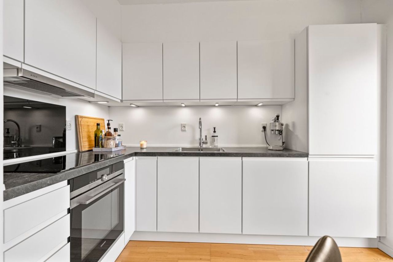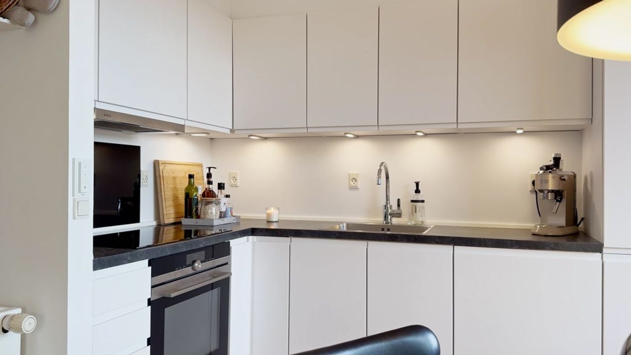 Generøse vinduespartier lader lyset strømme ind og fremhæver den moderne lethed, der præger de 57 velindrettede kvadratmeter. Lejligheden er indbydende og stilfuld med gennemtænkte detaljer – og med en altan, hvor udsigten bliver en del af oplevelsen.