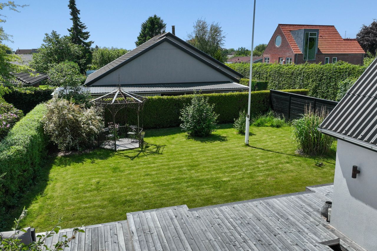 100 kvm. solrige træterrasser omfavner huset og skaber en flydende overgang mellem inde og ude. Her kan du følge solens bane fra morgenkaffen til aftensolen, mens flagstangen vajer i takt med brisen. Havemøbler, grill og loungesofaer finder naturligt sin plads, og på græsset venter den charmerende havepavillon – et lille fristed til en stille stund med en bog eller et køligt glas vin i skyggen. Haven er skabt til leg og boldspil, og i indkørslen er der plads til to biler samt både cykelskur og redskabsskur. Gå en tur til indkøb, eller tag håndklædet over skulderen og spadser til stranden, hvor sandet er blødt og vandet krystalklart. Cykelafstand til Holmagerskolen fuldender den ideelle beliggenhed.