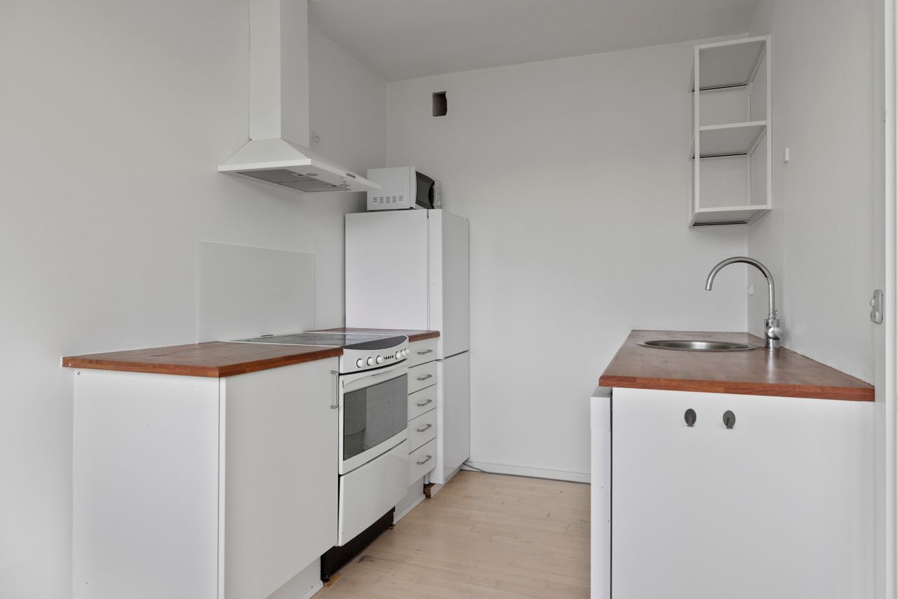 Med en let og smart gipsvæg er lejligheden i dag forvandlet til en “to værelseslejlighed”, hvor du får både soverum og opholdsrum uden at gå på kompromis med helheden. Stuen åbner sig mod lyset med vinduer i hele rummets bredde, mens de nyligt slebne og lakerede trægulve tilføjer et lyst og ensartet udtryk til hele lejligheden. Spisekøkkenet er enkelt og velfungerende med hvide elementer og mørk bordplade, og ved vinduet er der plads til en og rummer uden problemer et spisebord, hvor du kan nyde udsigten til de grønne fællesarealer. Badeværelset er pænt og funktionelt med hvide vægfliser, mørkt klinkegulv og en separat bruseniche – præcis som det skal være i et hjem, hvor hver kvadratmeter arbejder med.