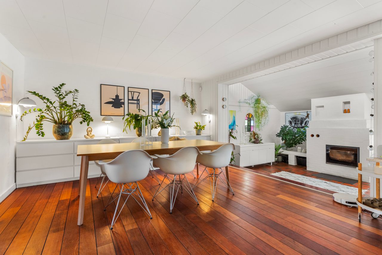 Familielivet finder gode rammer i boligen, der er indrettet i ét plan- i alt 280 etagemeter, heraf 124 m² høj og anvendelig kælder. Stueplanet rummer fire værelser med plads til søvn, leg og lektier. Badeværelset er holdt i lyse fliser, og spisekøkkenet danner rammen om hverdagens måltider. Stuen er åben og opdelt i spise- og opholdsafdeling med få trin ned til pejsestuen, hvor varmen og udsigten til haven følger med. Kælderen har egen indgang, badeværelse og køkken samt flere disponible rum – oplagt til kontor, kreativt brug eller en selvstændig teenageafdeling. Boligen er senest moderniseret i slutningen af 1980’erne og giver et solidt udgangspunkt for en nutidig opdatering.