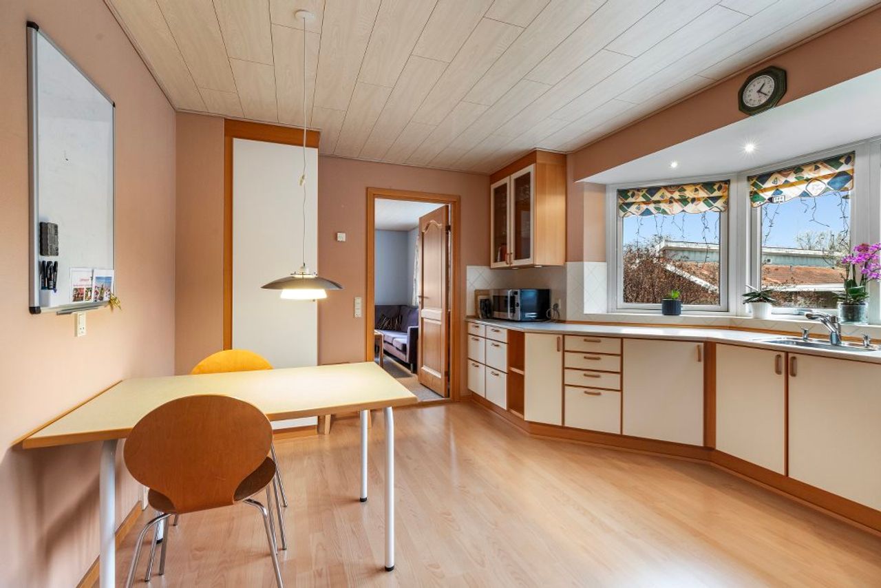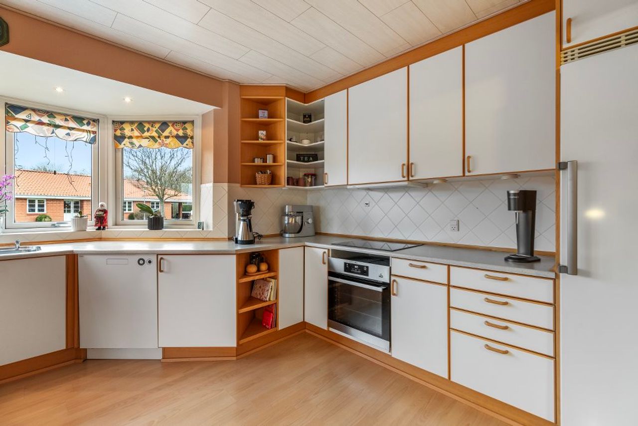 Inde i huset favner pladsen hele familien med en gennemtænkt fordeling, der både giver rum til fællesskab og privatliv. Gulvvarmen breder sig blidt gennem hele stueetagen og samarbejder med genvex-anlægget om at skabe et behageligt og balanceret indeklima, hvor komforten mærkes i hvert eneste skridt. Det dejlige spisekøkken, hvor karnapvinduet lader lyset strømme ind, danner en naturlig ramme om hverdagens måltider og samtaler. I den store stue og spisestue åbner dobbelte glasdøre til terrassen og trækker naturen med indenfor – en invitation til at nyde årstidernes skiften i fulde drag. Stueetagens to store værelser er oplagte til gæster, hjemmekontor eller de mindste familiemedlemmer, mens førstesalen rummer fire gode værelser og endnu en stue/alrum med fransk altan, hvor udsigten til haven og det grønne nærområde kan nydes i ro og mag. To badeværelser – begge med hvide fliser, det ene med muret bruseniche og det andet med badekar – sørger for, at hverdagen glider ubesværet og komfortabelt.