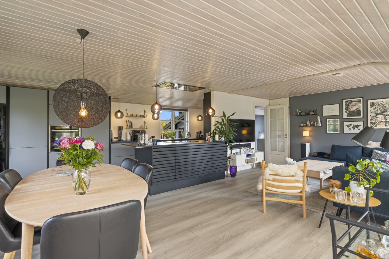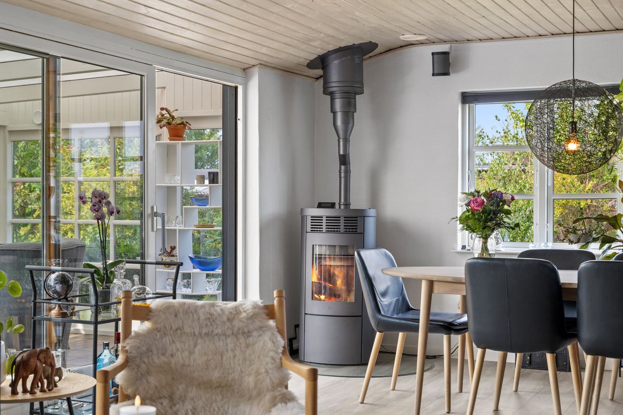 Boligen er lys og indbydende med lyse gulve, trælofter og en rolig atmosfære. Opholdsrummet samler hjemmet i et åbent flow med plads til både hverdag og gæster. Invita-køkkenet er husets hjerte – stilrent og veludstyret med bordkomfur, quooker, vinkøleskab og køkkenø. Pilleovnen skaber varme, mens udestuen giver udsigt til det grønne. Soveværelset er roligt og rart, og badeværelset fremstår lyst og klassisk.