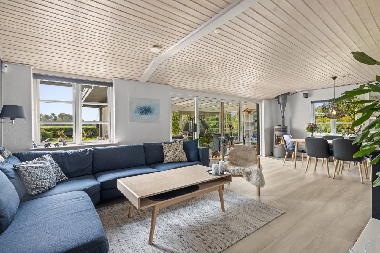 Haven indbyder til både liv og ro. Den store, nyanlagte fliseterrasse fanger solen dagen igennem og giver plads til krukker, loungemøbler og lange sommeraftener. Græsset er grønt, flaget vajer, og bag hækken breder marklandskabet sig frit. Udestuen med klinkegulv og skydedør forlænger sæsonerne og åbner hjemmet mod haven. Et hyggeligt anneks fungerer som gæsteværelse, og carporten samt udhuset giver god plads til det praktiske.