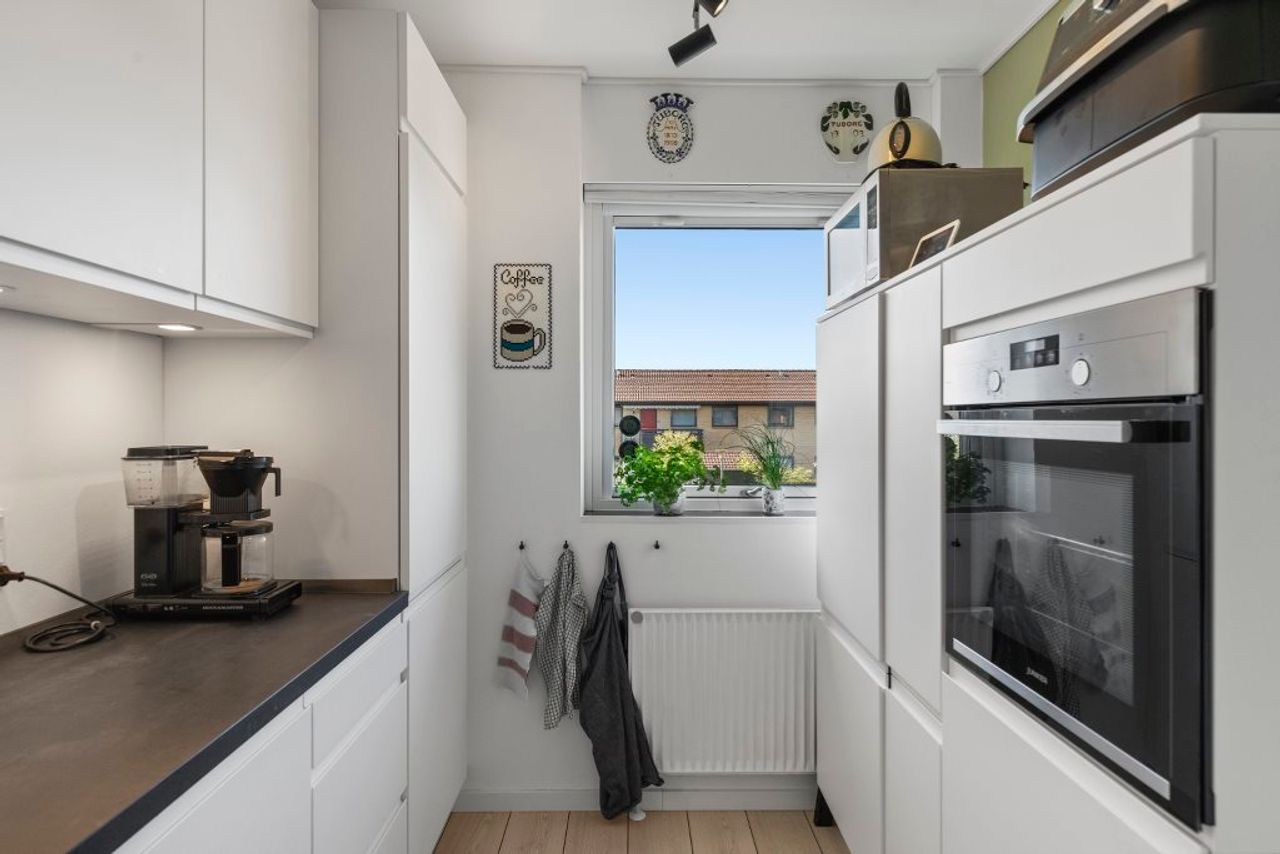 Lejligheden åbner sig med en indbydende opholdsstue, hvor der er plads til både lange samtaler og stille stunder. Gulv-til-loft vinduer lader dagens lys strømme ind og trækker altanen med helt ind i rummet, så ude og inde smelter sammen i et naturligt flow. Et hvidt og nærmest nyt Vordingborg-køkken fra 2022 – enkelt, tidløst og indbydende, som det står der med rene linjer og roligt udtryk, klar til duften af kaffe, aftensmad og alt det midt imellem. Badeværelset har en enkel og funktionel indretning med plads til vaskemaskinen, og i de tre værelser er der rum til både ro, leg og fordybelse – en lejlighed, hvor livet får lov at folde sig ud.