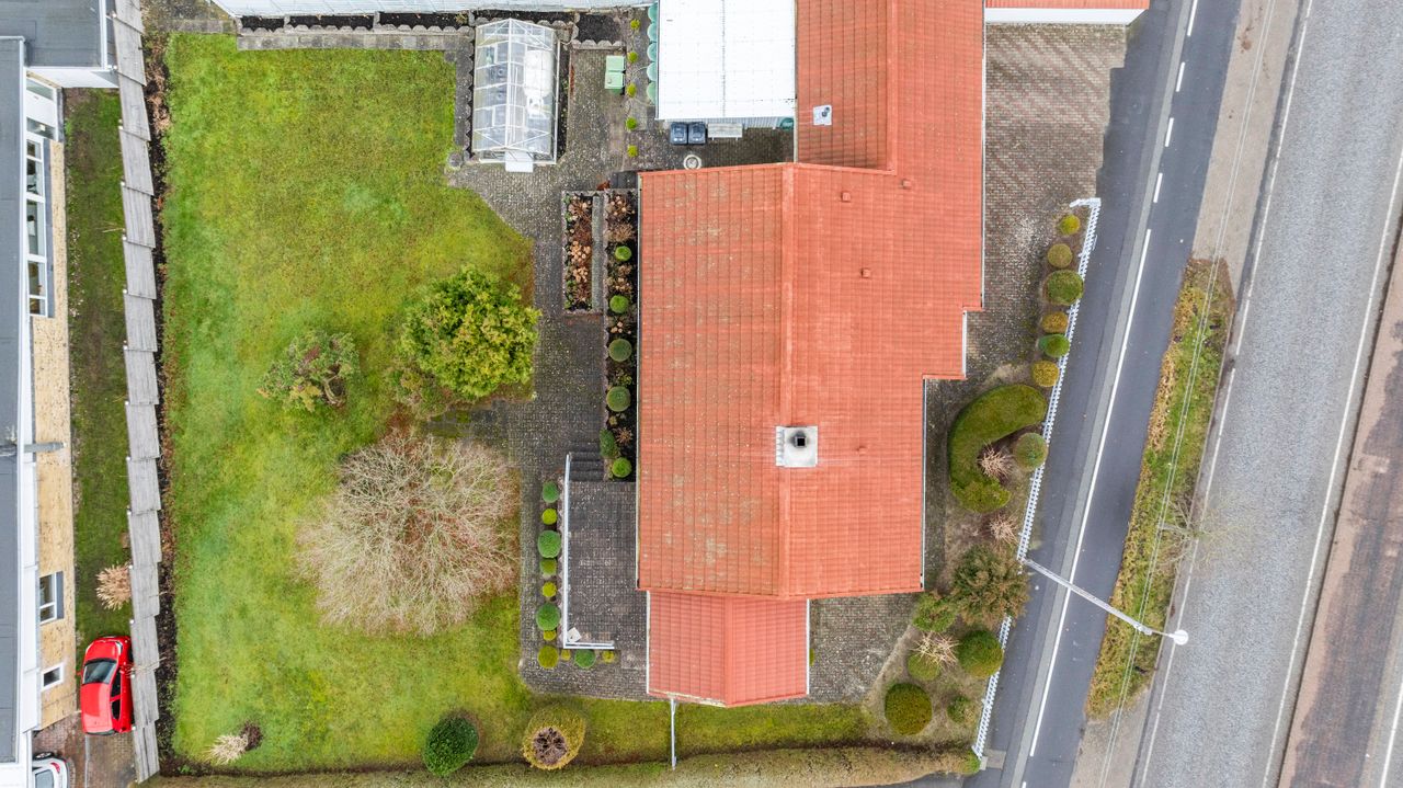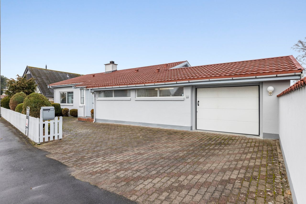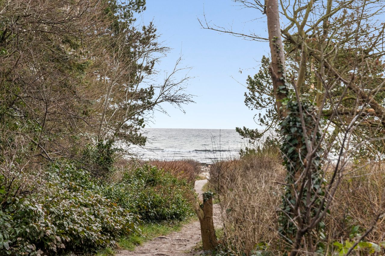 Haven er en velholdt oase - den let kuperede grund skaber naturlige niveauer og en smuk dynamik i uderummet. Den store fliseterrasse strækker sig ud i solen, omgivet af velplejet beplantning, mens udestuen under husets tag forlænger årstiderne. Fra flere steder i haven og huset fanger blikket et lille glimt af havet, mens terrassen også åbner op for et kig til det naturskønne eng og sø område. Den integrerede garage ligger praktisk under husets tag og har direkte adgang til bryggerset – en funktionel løsning, der gør hverdagen lettere. Beliggenheden gør det nemt at lade dagene starte med en morgendukkert. Træk i badekåben, list over strandvejen og mærk sandet under fødderne, mens bølgerne kalder på en frisk start.