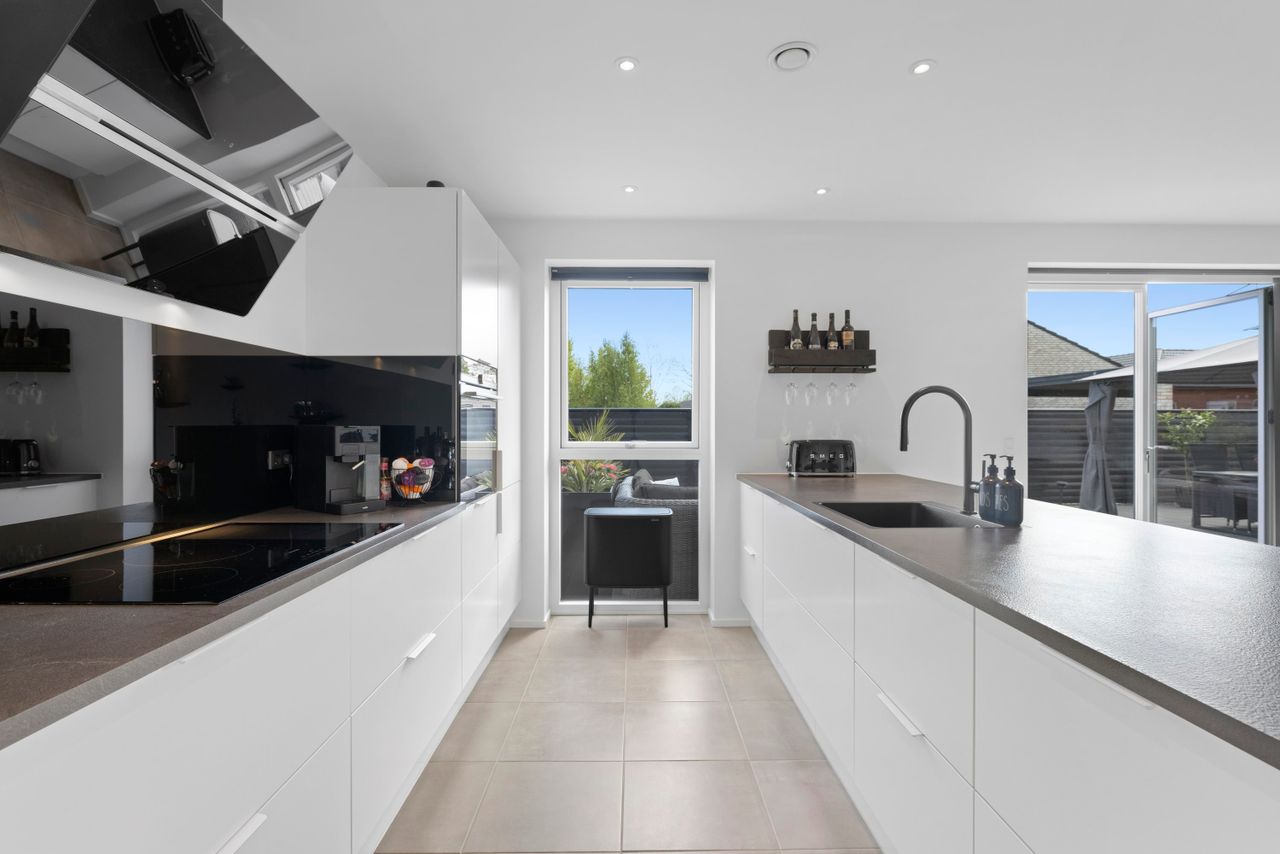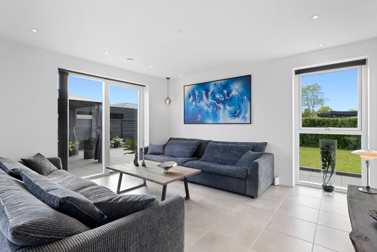En eksklusiv bolig med et helt særligt flow. Du mødes af en rolig entré med trælameller og indhak til bænken – en diskret detalje, der sætter tonen. Forældreafdelingen har loftshøje vinduer med udsigt til markerne direkte fra sengen, walk-in-closet og eget badeværelse med hvide Svane-elementer, sorte armaturer og rainshower. De tre børneværelser har samme udsigt, og endnu et walk-in og luksusbad i samme stil. Børnene vil elske de store, lyse rum – og forældrene vil elske roen, der følger med. Midt i huset breder det store alrum sig – med lækkert hvidt Svanekøkken i samtalestil, sort armatur og god plads til langbordet. Her samles hjemmet i lyset fra de dobbelte glasdøre i begge sider og flyder naturligt over i sofaafdelingen i den anden ende. Her er plads til både hverdag og gæster, liv og ro.Og under det hele arbejder de tekniske løsninger stille i baggrunden: solceller på taget, BWT-blødgøringsanlæg og Genvex ventilationsanlæg sikrer et sundt og behageligt indeklima – og selvfølgelig er der gulvvarme i hele huset.