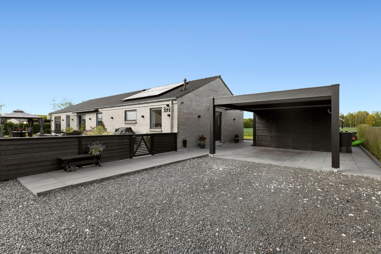 Det er præcis sådan, man forestiller sig det: et skarpt arkitektonisk længehus med alt det rigtige. Eurodan fra 2021, opført med kvalitet og detaljer, der får det hele til at føles som nyt – som om hjemmet er klippet direkte ud af et boligmagasin. Og her ligger det, roligt og eksklusivt, med åbne marker og udsigt, du aldrig bliver træt af.
