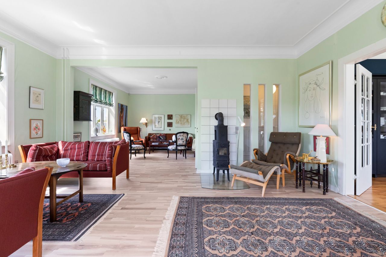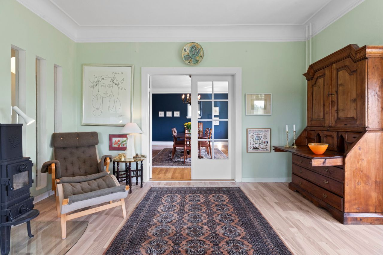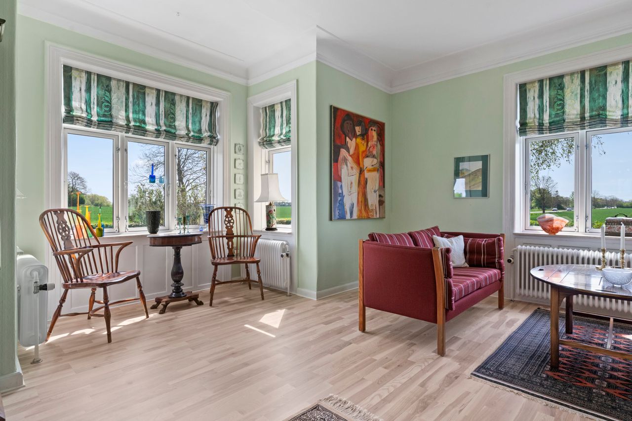 Ad den smukke trappe og gennem den massive hoveddør med lysindfald fra de fine glasfelter træder du ind i en bolig, hvor herskabeligheden mærkes fra første øjeblik. Hallens sort-hvide ternede gulv og den svungne trappe byder velkommen med både format og finesse, mens de store dannebrogsvinduer rammer udsigten til de grønne marker som levende malerier. De tre stuer en suite bindes sammen af dobbeltdøre fra spisestuen, hvor elegante radiatorskjulere og stuk skaber en særlig stemning omkring langbordet. I karnappen danser lyset blidt ind – et oplagt sted til ro, læsning eller samtale. Brændeovnen tilføjer varme og nærvær i opholdsstuen, og det snedkerlavede køkken rummer både hverdagsmad, lektier og lange samtaler ved spisebordet. Et gæstetoilet fuldender stueplan, mens kælderen tilbyder god plads til både vin og vasketøj. På førstesalen fortsætter fortællingen med et soveværelse (i dag indrettet til en ekstra stue), hvor morgensolen når helt ind på puden og døren åbner til altanen. Dertil to store værelser – det ene med walk-in – og et badeværelse med dobbelte vaske og muret bruseniche.