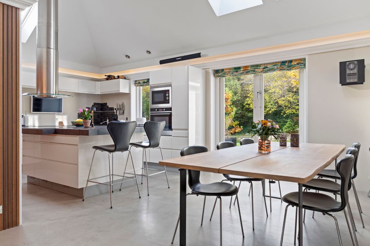 Her er så mange smukke og unikke detaljer: de gennemgående kvalitetsgulve, de særligt udvalgte fliser, nicherne, det indbygget lys alle steder, stilen er bare så fin. Det enestående, virkelig store leverum samler det hele – køkken, alrum og stue i en bevægelse helhed. I Køkken/alrummet løfter loftet sig til kip og ovenlysvinduerne lader lyset falde blødt ned. Det hvide, grebsfrie køkken med flot massiv mørk bordplade og en stor køkkenø, vær med under madlavning fra højstolene. Middage med snak og latter kommer af sig selv, når det store spisebord får lov at være samlingspunktet. De store vinduespartier og udgangen mod terrassen inviterer haven ind, og dagslyset bevæger sig over gulvene i løbet af dagen. Dejlig stue, hvor zonerne fordeler sig naturligt: den murede pejs med bænk til roen, sofahjørnet med tv og den indbyggede reol, og glaskarnappen, hvor lyset bliver blødere om aftenen. Alt hænger sammen uden at miste sin egen plads. Forældreafdelingen er som en suite for sig. Soveværelset har direkte adgang til badeværelset, der er skabt til langsomme morgener og aftener. Hjørnebadekaret indbyder til ro og varme, brusenichen bag glas giver et klart og enkelt udtryk, og de dobbelte håndvaske får hverdagen til at glide. Den store værelsesafdeling rummer tre gode værelser – rum til søvn, leg og lektier, og til at lukke døren, når der er brug for det. Hertil et badeværelse og et gæstetoilet, så funktion og rytme følger familien naturligt. En trappe fører op til et ekstra værelse (ikke godkendt) under taget – lille, hyggeligt og perfekt til fordybelse eller leg.