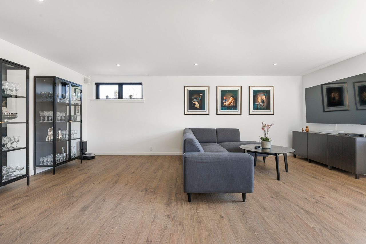 Alt står snorlige fra gulv til loft og varmen under fødderne – og stilen sender tankerne mod hotelstemning og New Yorker vibes, hvor både stil og kærlighed til detaljen løfter hverdagen. Det nye samtalekøkken i smuk grå nuance har en fritstående køkken-ø og med plads til høj stole – her mødes samtaler og madlavning helt naturligt. En dekorativ akustik lamelvæg markerer spiseområdet med langbord, mens skydedøren åbner mod terrassen og trækker lyset helt ind. I vinklen ligger stuen med det store hjørnevindue – her kan du synke ned i sofaen og lade dagens tempo falde blødt til ro. I stueplan finder du også et godt værelse samt et stilrent gæstetoilet. Forældresoveværelset har privat adgang til walk-in-closet og et badeværelse med fritstående badekar, dobbelte håndvaske og stor bruseniche med rainshower – en suite med hotelstemning. Virkelig god og anvendelig underetage/kælder føjer en ekstra dimension til boligen. Tre disponible rum og endnu et nyt hvidt gæstetoilet suppleres af et imponerende multirum med plads til det hele – fest, træning, hobby eller teenageliv.