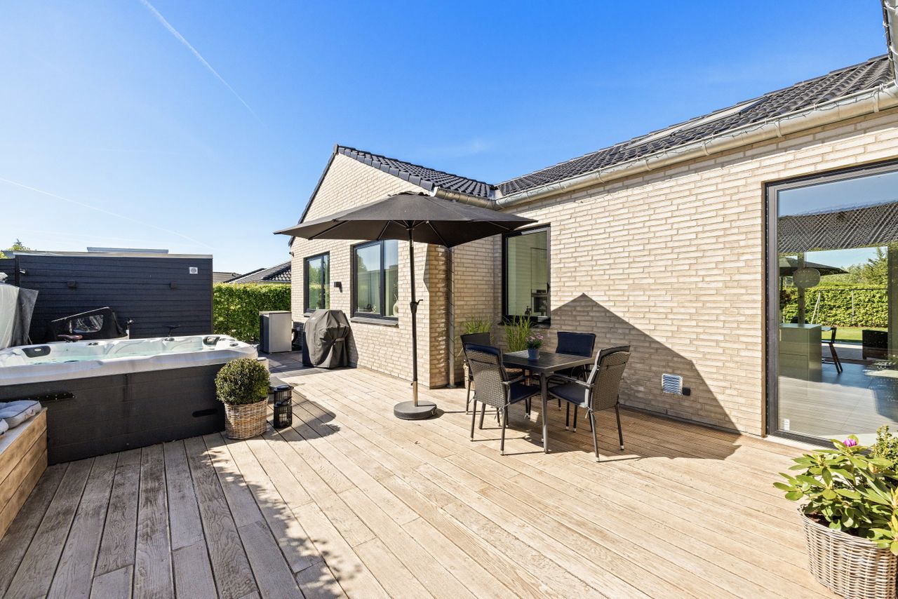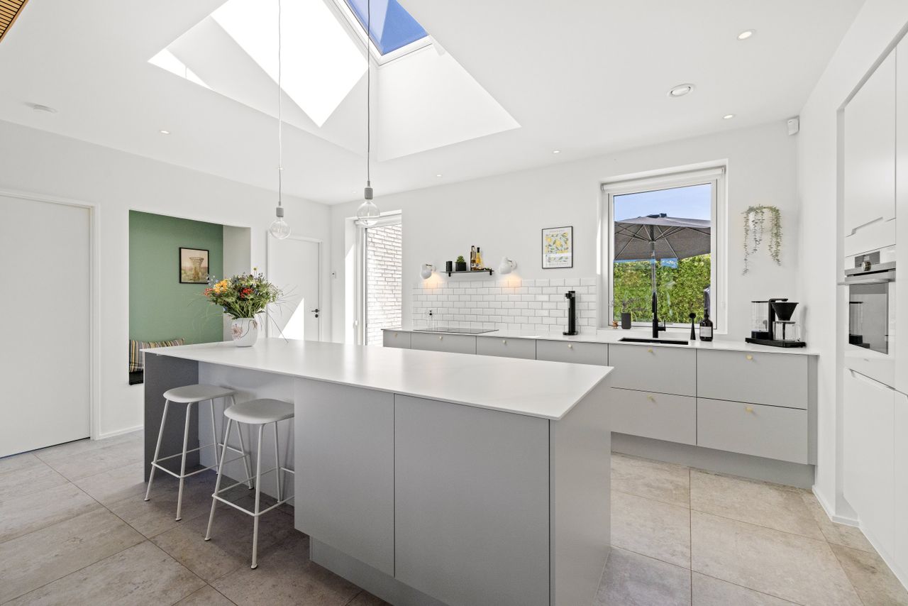 Et hav af lys strømmer ind gennem de store vinduespartier og lader rummene folde sig ud med en sjælden fornemmelse af åbenhed og luft. Ovenlyset over køkkenøen kaster en blid glød over det store samtalekøkken og alrummet, hvor madlavning og måltider får plads til at trække ud og samle jer om hverdagen. Det grå HTH-køkken er nøje udvalgt med fokus på både æstetik og funktion, og køkkenøen med høje stole bliver hurtigt det naturlige samlingspunkt. Stuen – et lyst og roligt opholdsrum med store vinduespartier og direkte udgang til den vestvendte terrasse. En oplagt ramme om afslapning, fællesskab og rolige aftener. Planløsningen skaber tydeligt adskilte afdelinger – helt perfekt til både små og store. Forældresuiten rummer et soveværelse med adgang til terrassen, et rummeligt walk-in-closet og eget badeværelse med fritstående badekar og elegant glasbruseniche – en fredelig og velindrettet afdeling, hvor velvære har førsteprioritet. Hertil kommer endnu et værelse i forlængelse. I modsatte ende af huset ligger tre store værelser samt endnu et badeværelse. Et gæstetoilet fuldender indretningen. Alt er nænsomt udvalgt og skabt til et liv i balance.