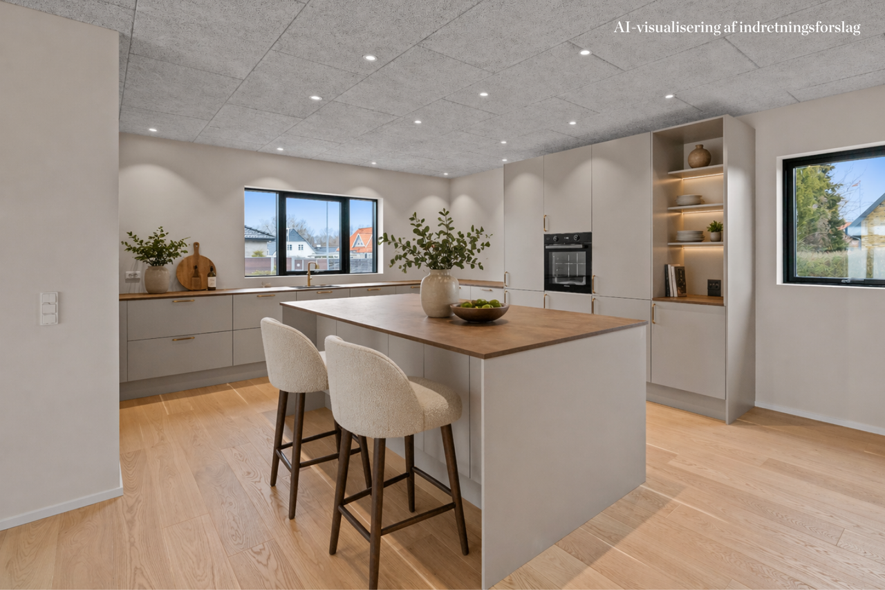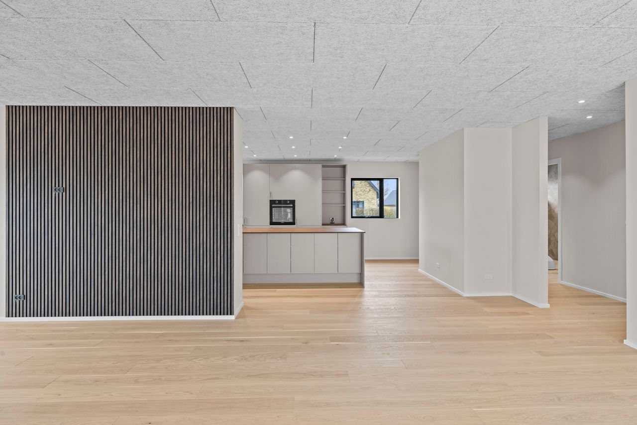 Behagelige gulvvarme breder sig gennem eksklusive egetræsplankegulve og smukke stengulve. 2 luksuriøse badeværelser med smukkeste flodsten, rainshower og sorte Grohe-armaturer – en wauw oplevelse. 4 store værelser giver plads til leg, søvn, lektier og fordybelse. Forældreafdelingen er skabt som en suite med eget lækkert walk-in-closet og direkte adgang til badeværelset. Det integrerede udhus er holdt i præcis samme stil som boligen og bliver en oplagt afdeling til kontor, hobby, teens eller au pair. Et stort unikt rum med køkken, alrum og stue i ét, hvor det beige samtalekøkken med stor fritstående ø samler både mennesker og måltider. Her kan højstolene trækkes frem, samtalerne flyde, og lyset strømme ind gennem de store lodrette vinduer over spisebord og sofahjørne.