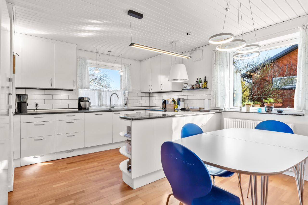 Huset er indrettet med plads til familieliv i mange tempi. De 5 værelser giver rum til både børn, gæster og hjemmearbejde, og på førstesalen ligger 4 af dem side om side med en dejlig stue, der kan samle de større børn om deres egen afdeling. Heroppe findes også et badeværelse samt 2 altaner som åbner sig mod lyset – én fra stuen og én fra soveværelset – begge med udsigt over markerne, hvor horisonten næsten bliver en del af indretningen. I stueplan ligger det hvide HTH-køkken/alrum som hjemmets naturlige samlingspunkt med spiseplads til hverdagens måltider. Hertil kommer gæstetoilet, badeværelse, et værelse og 2 stuer, så der er plads til både middagsselskaber, tv-aftener og de stille stunder midt imellem.