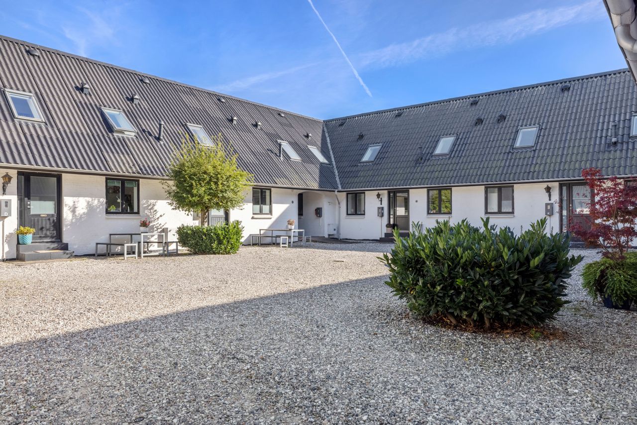 På jorden fra den gamle Stensbjerggård, hvor hestevogne siden 1870’erne har trillet ind gennem gårdspladsen, ligger i dag en bebyggelse med en helt særlig sjæl. Opført som en firelænget gård, omgivet af den fineste gamle have med idyllisk sø, gamle smukke træer og parklignende fællesarealer, står 13 rækkehuse side om side. Udtrykket her er moderne, gennemrenoveret og stilrent – men stadig med en atmosfære, der gør stedet helt særligt.