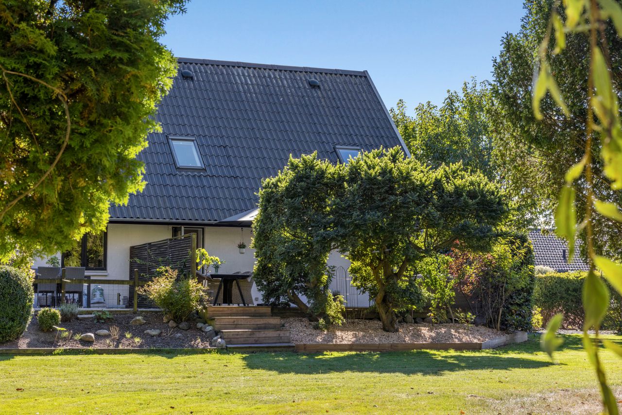 Allerede når du træder ind, mærker du husets lethed, som straks følges af en åbenhed, der inviterer dig længere ind. De 130 kvadratmeter er godt indrettet og fremstår som nye, med en stil, der er både enkel og indbydende. Køkken/alrummet står skarpt og så flot. - hvid højglans og med plads til langbordet, hvor samtaler, grin og middage kan folde sig ud. Med et greb i terrassedøren fortsætter livet ubesværet ud i haven, hvor solen og sommeren venter i grønne omgivelser. Stuen indbyder til ro med sofahjørne og tv – et naturligt samlingspunkt, når dagen stilner af. De flotte enkle linjer blødes op af træpanel detaljer, der giver rummet både varme og personlighed. På førstesalen mødes du af skråvinduer, der åbner mod himlen og lader stjernerne kigge ind. Her er tre gode værelser – og mulighed for et fjerde, hvis behovet opstår. Badeværelset er skabt til velvære med muret bruseniche, rainshower og flot bordmonteret håndvask.