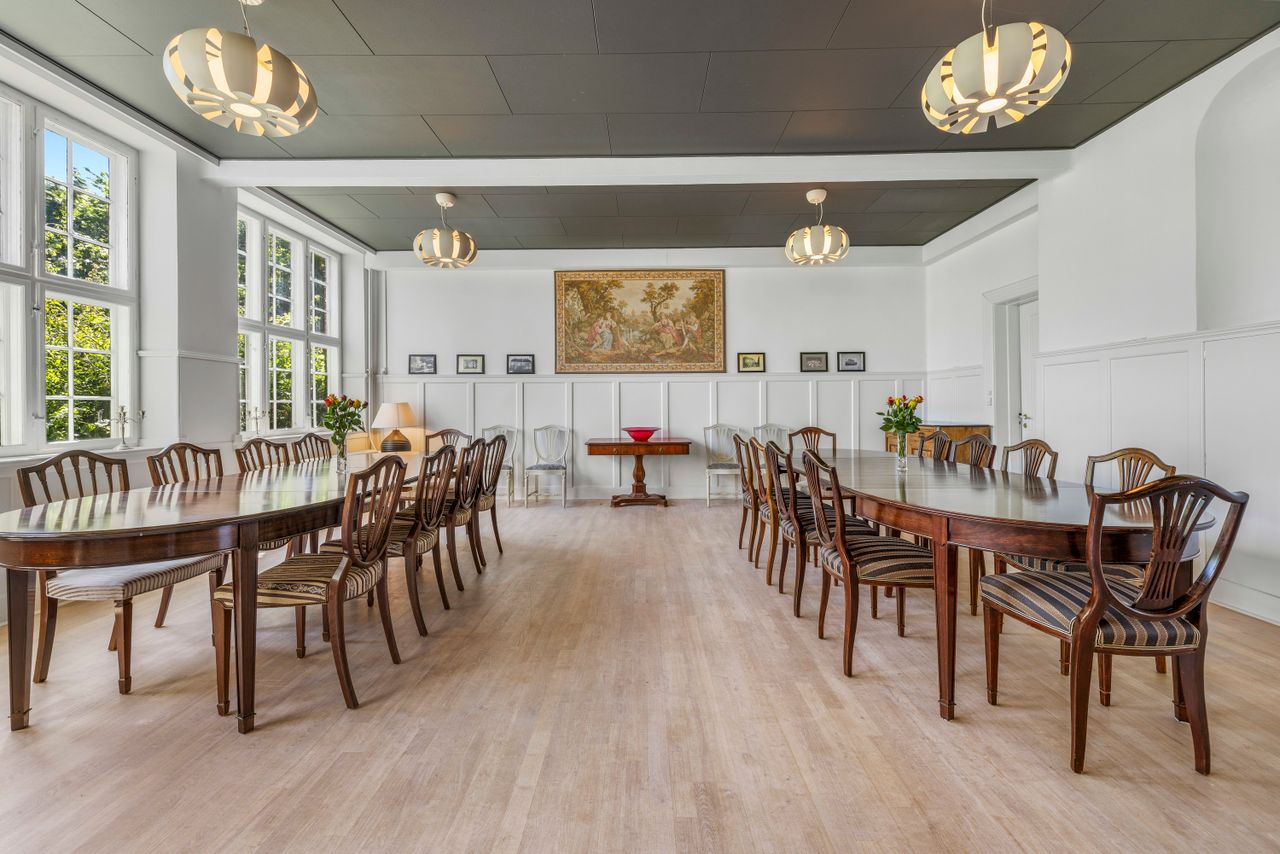 Indvendigt folder den herskabelige stemning sig fuldt ud med højt til loftet, paneler, store stuer og en imponerende hall med bred trappe til førstesalen. Køkken og opholdsrum hænger naturligt sammen, og huset rummer mange værelser, flere badeværelser og gæstetoiletter – alt smagfuldt indrettet med respekt for det oprindelige.