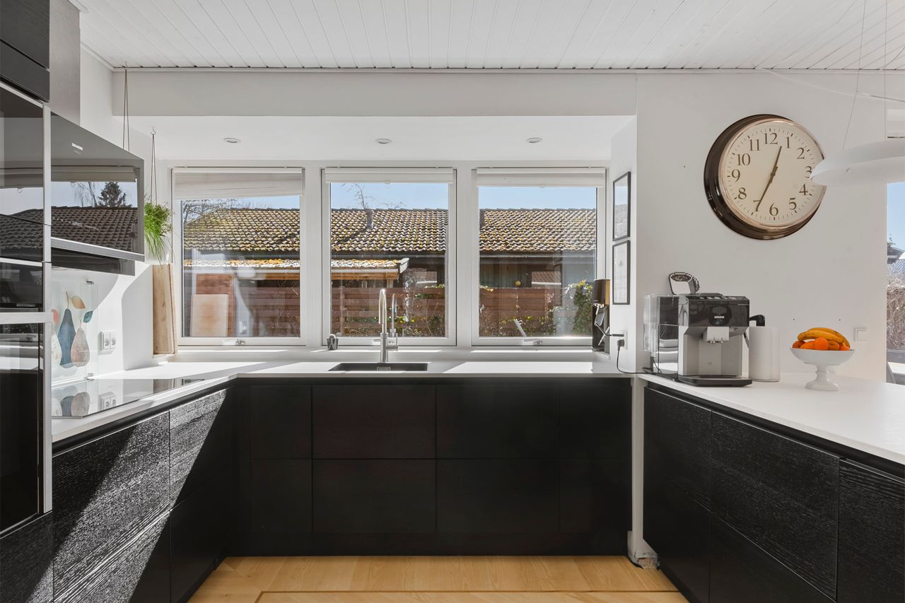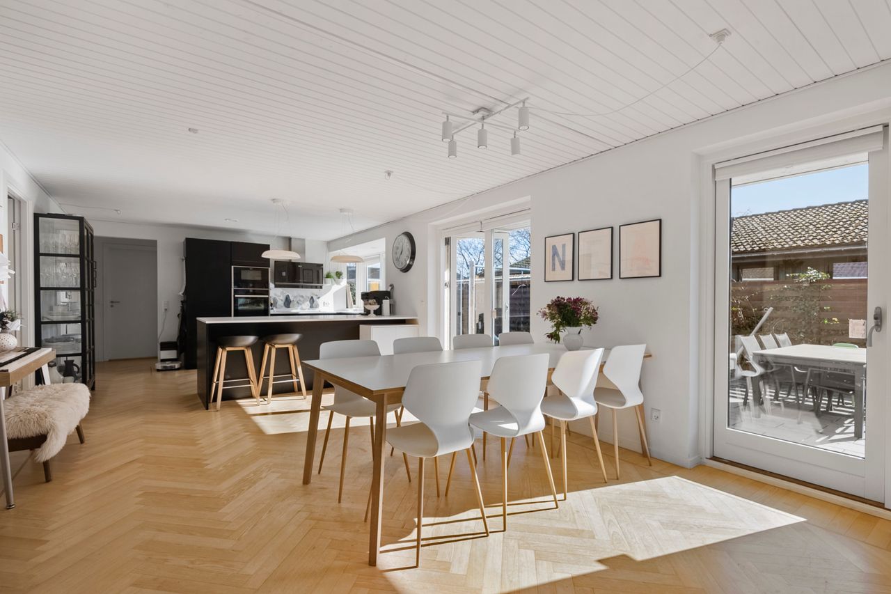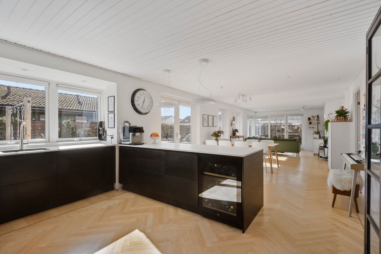 Varmen breder sig under alle gulvene, mens lyset falder blødt ind fra alle sider. Det store åbne køkken/alrum/stueområde samler hjemmet på fineste vis med smukt sildebensgulv, store vinduespartier og udgange til haven. Her er plads til et dejligt spisebord, hvor hverdagen og de lange måltider med stearinlys og vin i glasset kan folde sig ud, mens sofahjørnet får sin egen rolige stemning ved det store glasparti og lyset, der strømmer ind dagen lang. Det nyere (2019) Invita køkken står flot i en mørk tone med en lys bordplade. Vinkøleskabet sørger for den perfekte temperatur, Quookeren for vandet og der er plads til højstole, så morgenkaffen kan nydes eller lektierne ordens mens maden bliver tilberedt. Forældresoveværelset har udgang til terrassen, så døren kan stå på klem og lukke morgenbrisen ind, og hertil kommer eget hvidt flisebadeværelse. Dertil får I 3 gode værelser og endnu et badeværelse, så her er plads til både børneliv, hjemmearbejde og overnattende gæster.