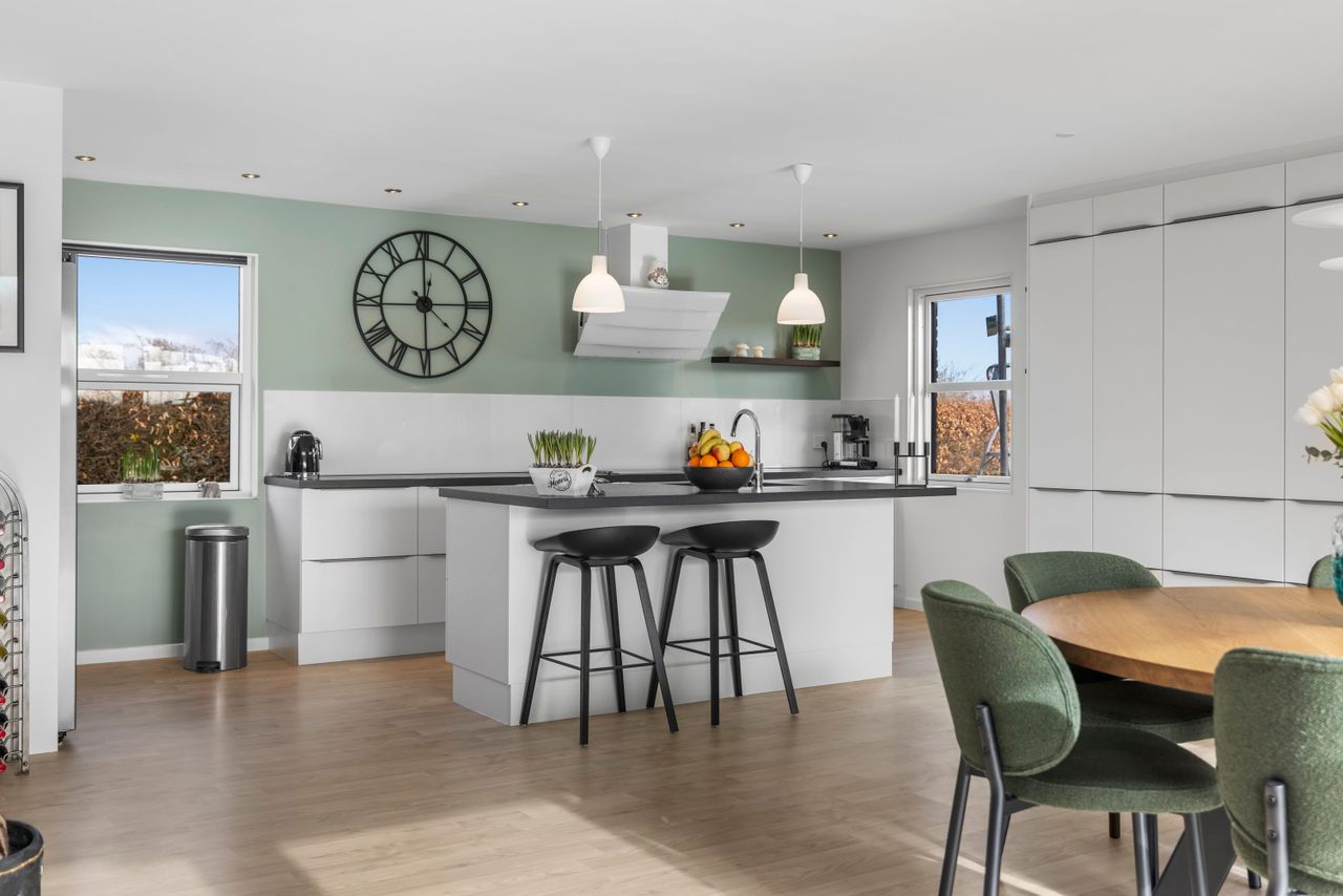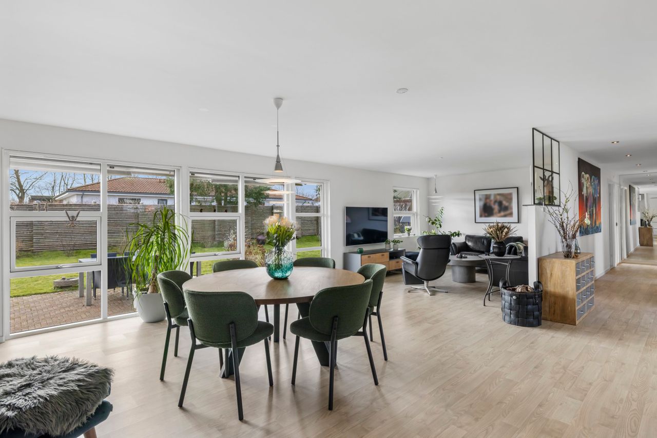 Huset er gennemistandsat fra gulve og lofter til døre, vinduer, køkken og badeværelse. Selv facaden fremstår skarp og harmonisk – et moderne og indbydende hjem, hvor børnefamilier hurtigt vil føle sig hjemme. Vinduespartier på tre sider – heraf ét fra gulv til loft – lader lyset strømme frit og giver det store alrum en let og åben stemning. Her mødes stue, spisestue og samtalekøkken i en indretning, der kalder på fællesskab og hverdagsliv. Det hvide køkken fra Aubo står smukt med mørk bordplade, fritstående køkkenø og plads til højstole, hvor både morgenmad og lektielæsning nemt finder sin plads. Et køleskab med isterningsmaskine tilføjer et lille strejf af luksus til de varme dage. I stuen giver væggen med newyorker-vindue mod entréen et moderne løft, som smukt spiller sammen med boligens nordiske stil. Badeværelset fremstår lækkert og opdateret med rainshower og glasvæg, mens de tre værelser skaber trygge rammer for både små og store familiemedlemmer. Det ene værelse har direkte udgang til terrassen – perfekt til at lade døren stå på klem og invitere morgensolen ind.