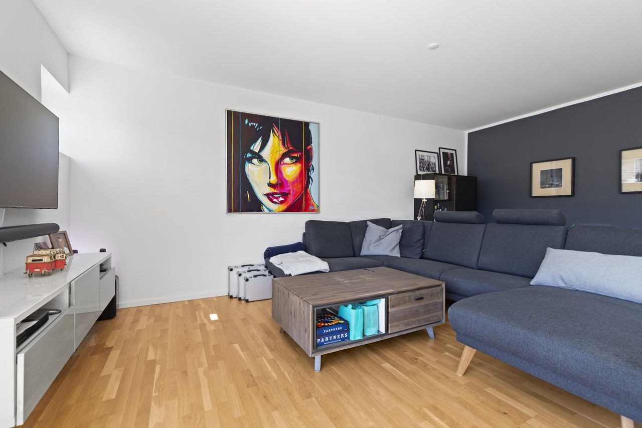 På førstesalen venter to værelser med faste skabe – det ene med fransk altan og udsigt til himlen. Reposen er møblerbar og ideel til hjemmearbejdsplads, læsehjørne eller bare et stille sted til fordybelse. Lyset strømmer ind gennem det store vinduesparti, og en terrassedør fører dig direkte ud på den enestående tagterrasse. Hvidt fint badeværelset med bruseniche og fin rummelighed.