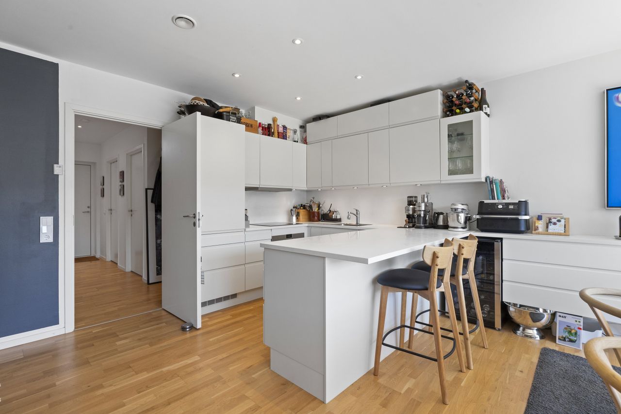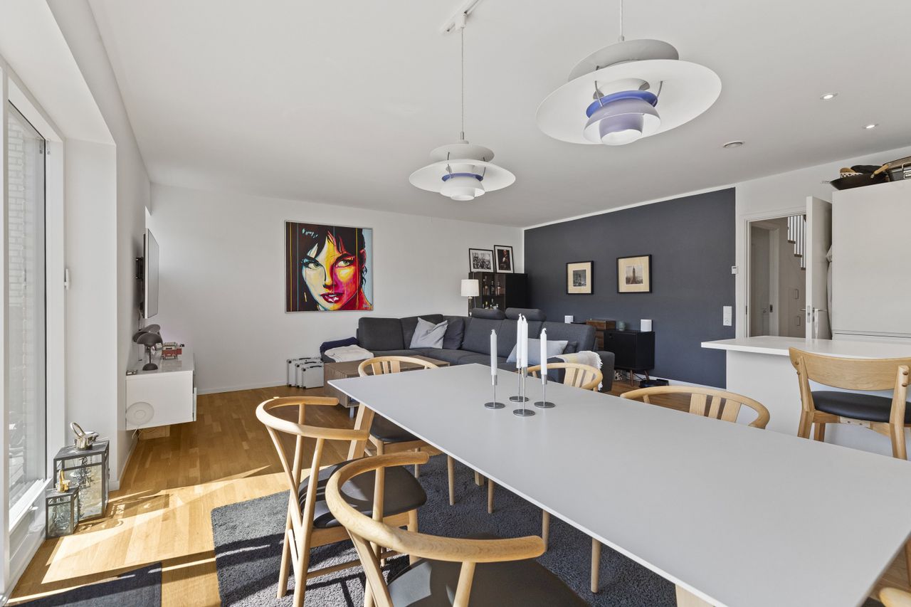 Boligen folder sig ud i to fulde plan – hver etage med sit eget udtryk, men forbundet af samme enkle stil. Under det hele sørger fjernvarme og gulvvarme i alle rum for en behagelig temperatur – uanset årstid. Stueplanen er præget af samtalekøkken, spisestue og stue i ét åbent skønt leverum. Det hvide HTH-køkken står stilrent og indbydende – med plads til højstole, så samtalen kan flyde, mens maden gøres klar. Langbordet finder sin naturlige plads i forlængelse af køkkenet, og i den modsatte ende venter sofaen, hvor roen får lov at brede sig. Et rum, der flyder i én bevægelse – med lys, luft og liv i hver eneste meter. Et værelse til gæster, kontor eller det, du har brug for lige nu. Gæstetoilettet står hvidt og det samme gør bryggerset.