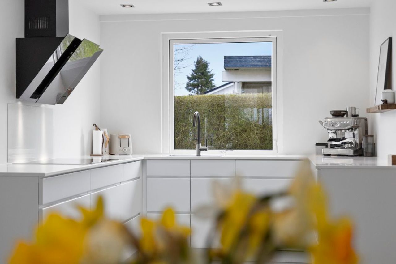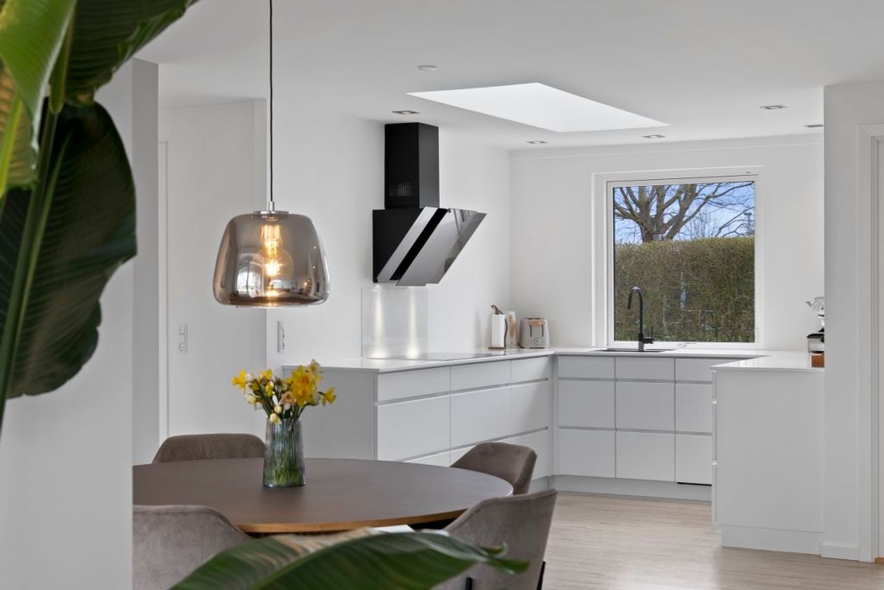 Der er noget særligt over hjem, hvor lyset vælter ind fra oven. Og her, hvor ovenlysene åbner boligen mod himlen, træder du ind i en villa med gennemført nordisk stil og en lethed, der mærkes i både hjerte og rum. Alt er nænsomt renoveret, alt er velholdt – og fra det grebsfrie, hvide køkken til de store vinduespartier er stemningen lys, rolig og indbydende.