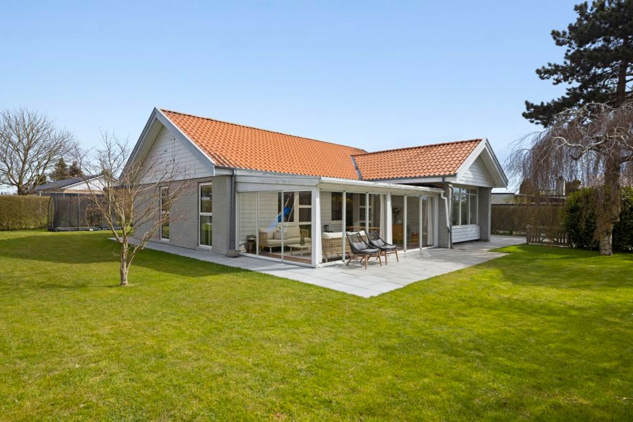 Hvide lofter og pæne gulve går igen i hele huset, hvor planløsningen er lys, let og gennemtænkt. Energioptimeret med hulmursisolering, efterisolerede vægge og luft-til-vand varmepumpe – alt står klar til det gode hverdagsliv. Garagen på 19 kvm. er smukt inddraget som forældreafdeling (ikke godkendt til beboelse) med ovenlys og dobbeltdøre i glas ud til terrassen. Åbn og mærk morgenbrisen, mens du står i soveværelset med skabsvægge på to sider – nærmest et walk-in i sig selv. To børneværelser rummer både leg og søvn, det ene med udgang til udestuen og begge med vinduer fra gulv til loft. Badeværelset er indrettet i ren nordisk stil – grå fliser, rainshower og varme under fødderne. I det store, åbne opholdsområde flyder køkken, spiseplads og stue naturligt sammen. Et nyere, hvidt køkken med god bordplads og masser af skabe åbner sig mod resten af rummet, hvor et stort vinduesparti og ovenlys inviterer lyset ind – og lader både sol og måne følge dig fra sofaen.