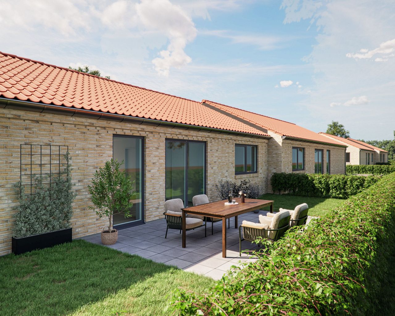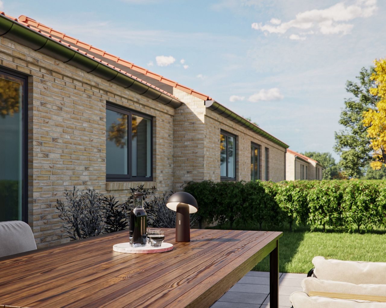 De smukke, lyse mursten og saddeltaget med røde teglsten i 25 graders hældning - en æstetisk detalje, der tilpasser sig landsbyens krav og fuldender husenes harmoniske fremtoning. De grå/sorte vinduer med hvide rammer indvendigt tilføjer et eksklusivt præg, der fuldender boligerne med stil og balance. Inde i de 120 kvm venter et gennemtænkt hjem i ét plan. Køkken/alrum og stue flyder sammen i et lyst og åbent rum med direkte udgang til haven – et indbydende område til både hverdagsliv og hyggelige stunder. Svanekøkkenet er en elegant løsning, der passer perfekt til boligens eksklusive udtryk. De to badeværelser er smart placeret – ét ved soveværelset og det andet i værelsesafdelingen, der kan rumme alt fra børneværelser til kontor eller gæsteværelse. Et praktisk bryggers og moderne energiløsninger som gulvvarme og en energieffektiv varmepumpe sikrer en komfortabel og funktionel hverdag.