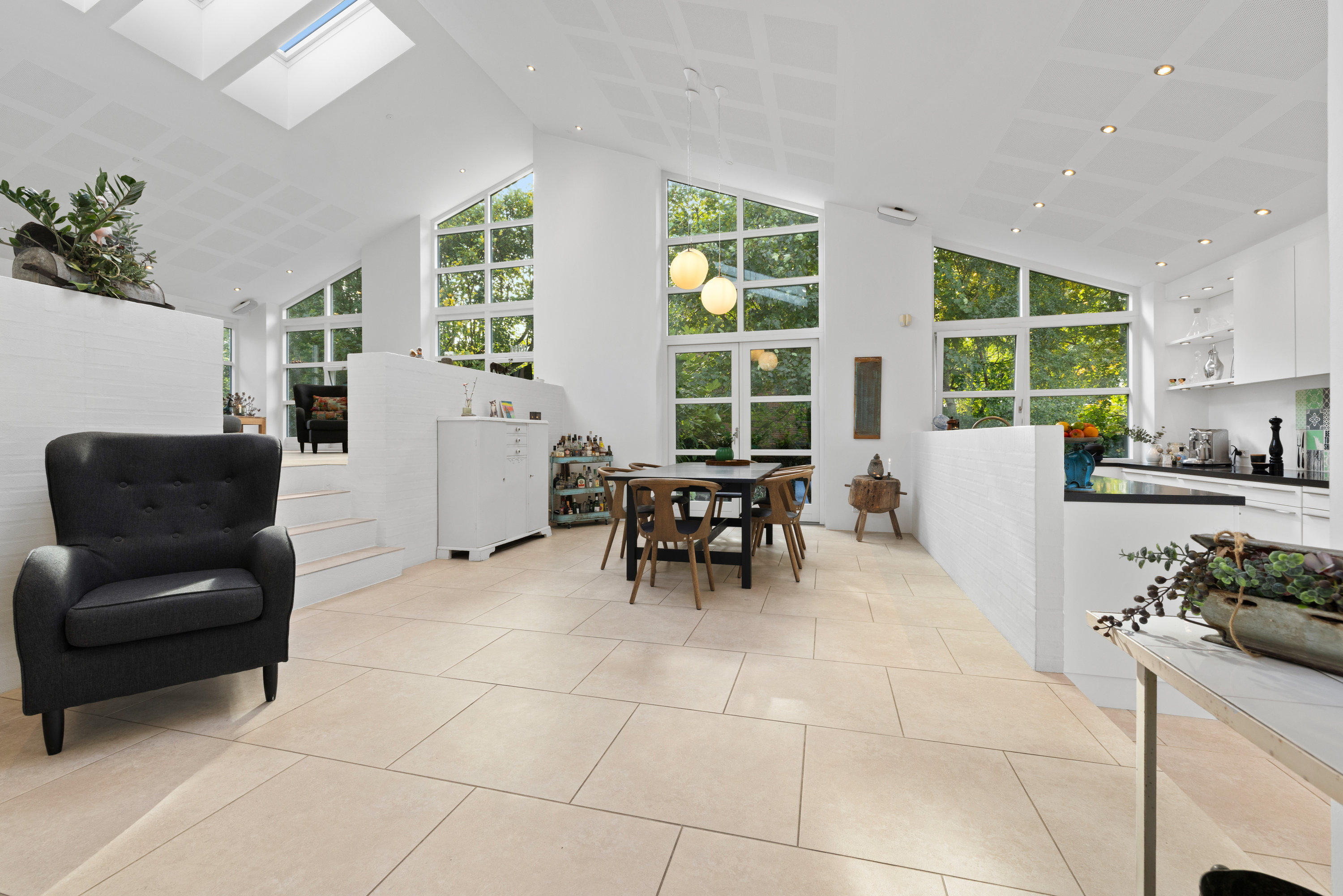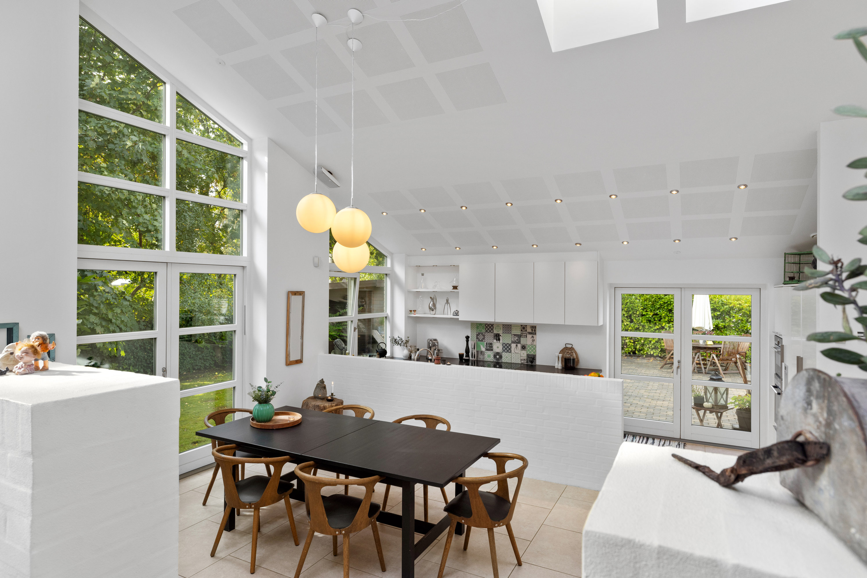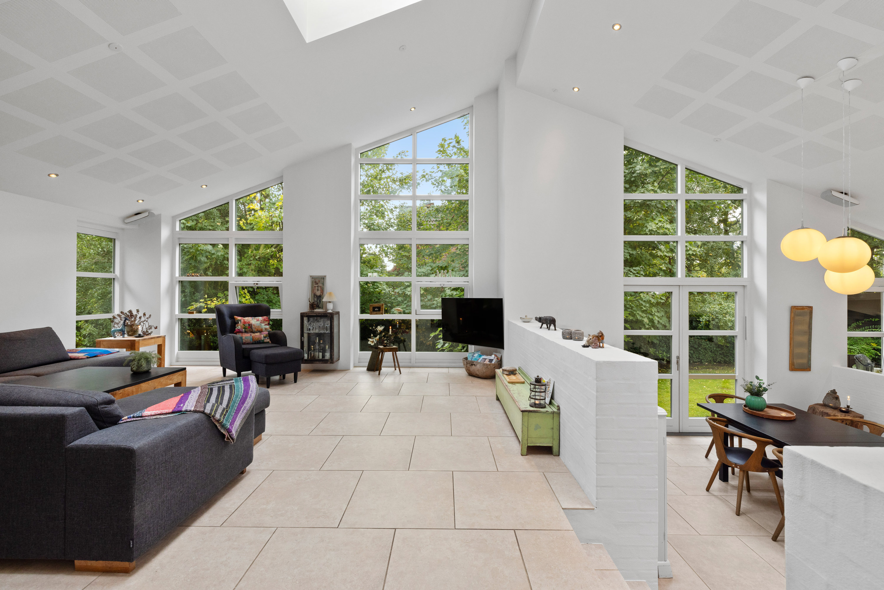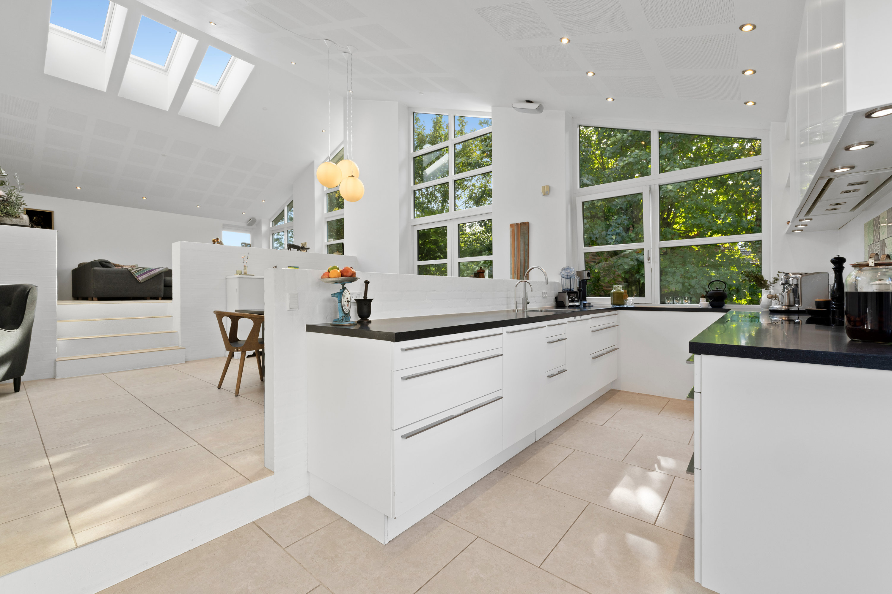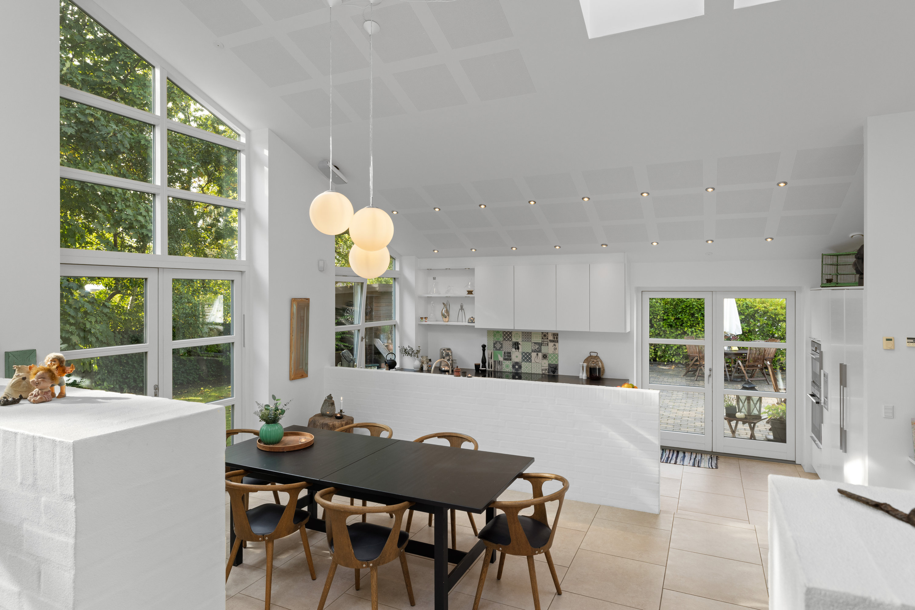 De lyse mursten spejler stranden - zinkinddækninger og hvide lavenergivinduer vidner om et tidløst og veludført byggeri, hvor kvaliteten står lysende klar. Indenfor mærkes det samme arkitektoniske overskud. Sandfarvede klinker med gulvvarme flyder gennem alle boligens rum. Lofter til kip med ovenlys trækker dagslyset helt ned i det store leverum, hvor køkken, alrum og spisestue mødes i ét sammenhængende rum med en ro, der mærkes. Multiform-køkkenet står i hvidt med mørk bordplade og virkelig fine unikke fliser ved komfuret – et køkken skabt til madglæde og kulinarisk overskud. En halvmur markerer overgangen til spiseområdet, hvor langbordet samler familie og gæster, og fra begge sider er der udgang til haven og terrassen, så lyset og luften altid er tæt på. Et par trin fører op til stuen, hvor lofterne fortsætter mod kip, og hvor vinduerne trækker blikket ud mod trækronerne. Der er god plads til både nærvær og familiehygge, og lyset bliver en del af stemningen og roen finder sin plads. Forældreafdelingen byder på soveværelse med garderobe og adgang til et luksusbadeværelse i sandfarvede nuancer, med Vola-armaturer, badekar og bruseniche – et lille stykke wellness i hverdagen. To værelser skaber plads til ro, søvn og fordybelse, og et fint gæstetoilet fuldender etagen. Underetagen/kælderen åbner sig som et ekstra plan med 3 store, lyse rum og en rummelighed, der mærkes. Her er plads til teenagernes univers, gæsteafdeling, hjemmekontor eller et stille rum til fordybelse. Et badeværelse i samme stil som ovenpå fuldender etagen, mens bryggerset med egen indgang gør hverdagen praktisk og let.