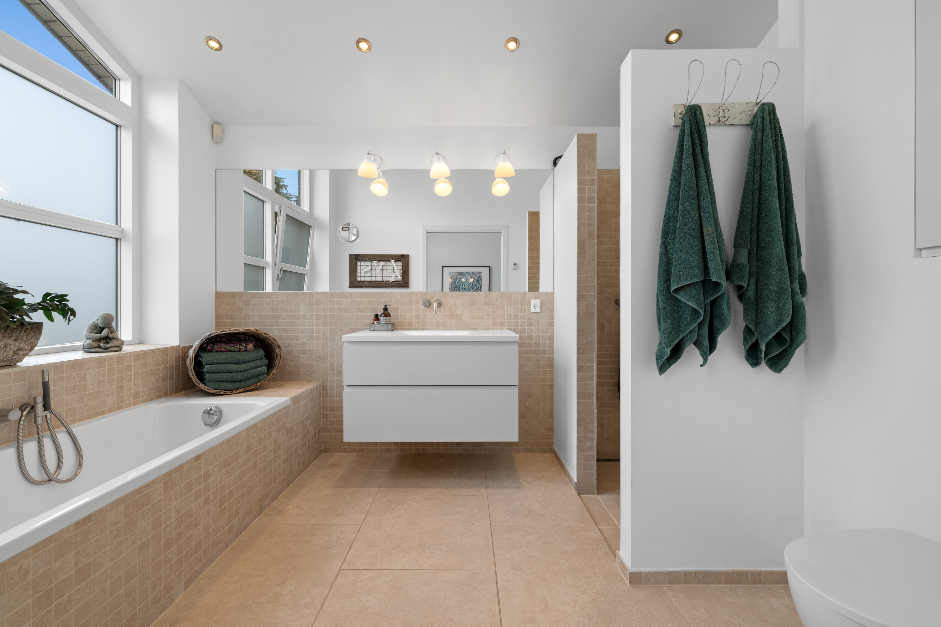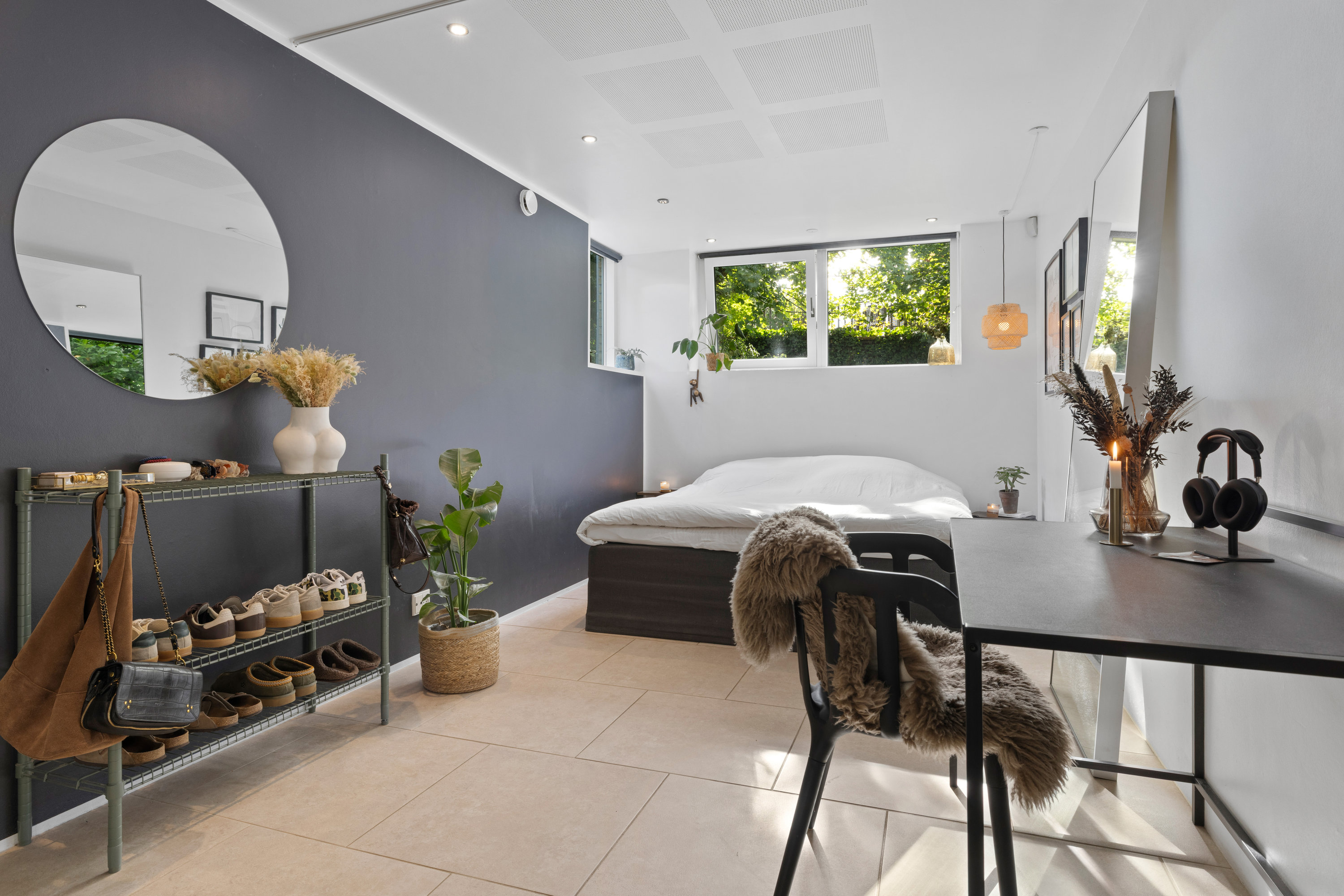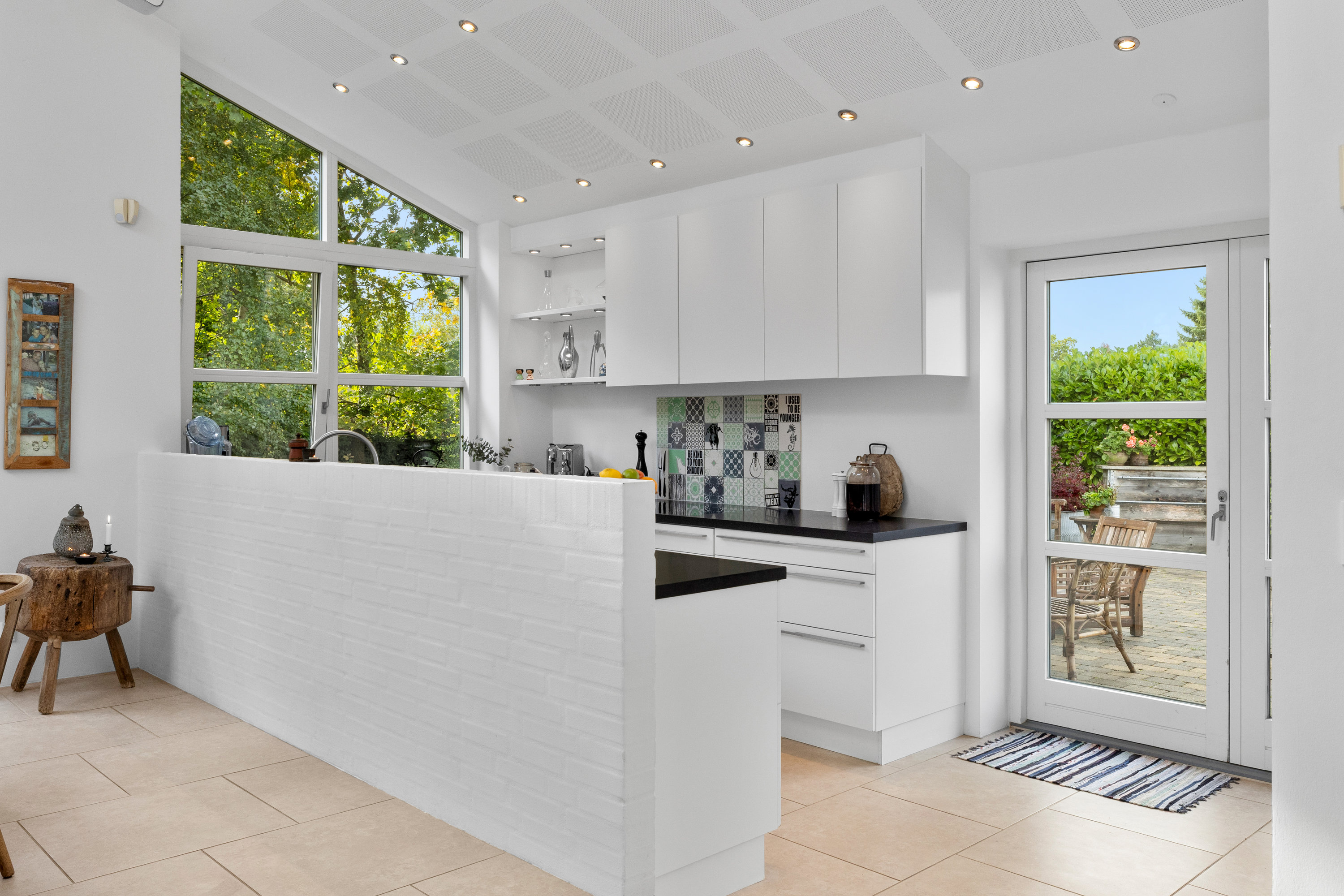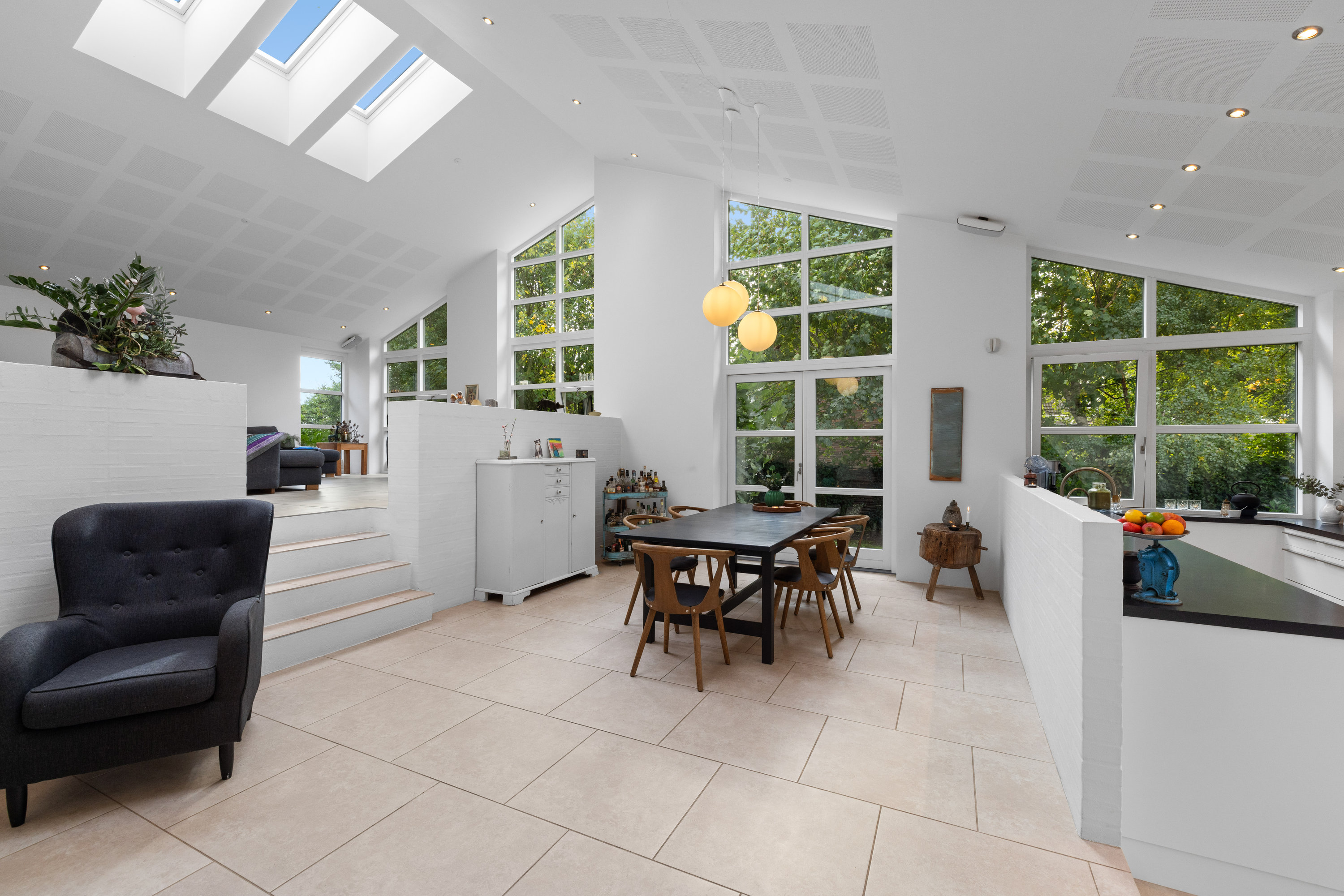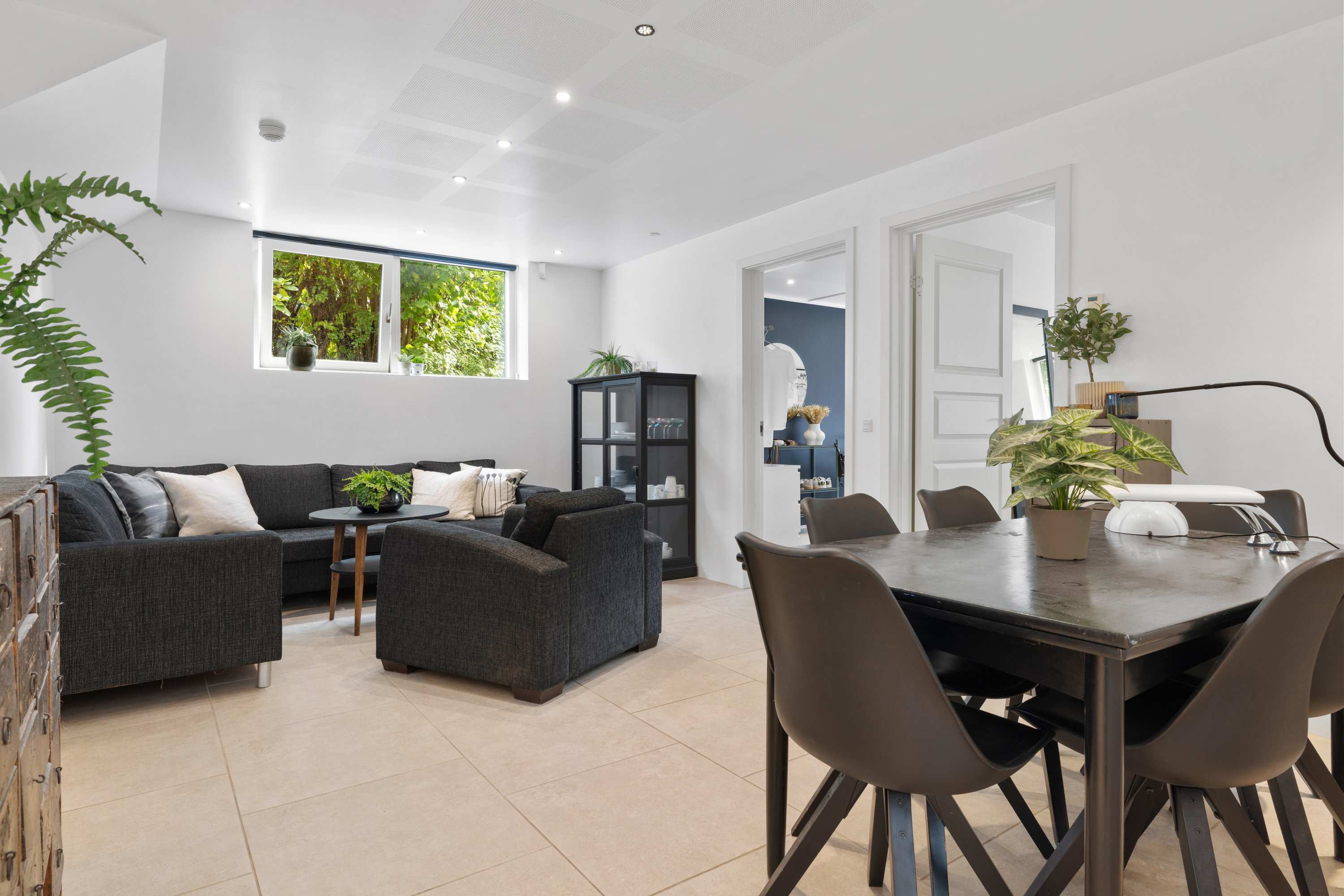 De lyse mursten spejler stranden - zinkinddækninger og hvide lavenergivinduer vidner om et tidløst og veludført byggeri, hvor kvaliteten står lysende klar. Indenfor mærkes det samme arkitektoniske overskud. Sandfarvede klinker med gulvvarme flyder gennem alle boligens rum. Lofter til kip med ovenlys trækker dagslyset helt ned i det store leverum, hvor køkken, alrum og spisestue mødes i ét sammenhængende rum med en ro, der mærkes. Multiform-køkkenet står i hvidt med mørk bordplade og virkelig fine unikke fliser ved komfuret – et køkken skabt til madglæde og kulinarisk overskud. En halvmur markerer overgangen til spiseområdet, hvor langbordet samler familie og gæster, og fra begge sider er der udgang til haven og terrassen, så lyset og luften altid er tæt på. Et par trin fører op til stuen, hvor lofterne fortsætter mod kip, og hvor vinduerne trækker blikket ud mod trækronerne. Der er god plads til både nærvær og familiehygge, og lyset bliver en del af stemningen og roen finder sin plads. Forældreafdelingen byder på soveværelse med garderobe og adgang til et luksusbadeværelse i sandfarvede nuancer, med Vola-armaturer, badekar og bruseniche – et lille stykke wellness i hverdagen. To værelser skaber plads til ro, søvn og fordybelse, og et fint gæstetoilet fuldender etagen. Underetagen/kælderen åbner sig som et ekstra plan med 3 store, lyse rum og en rummelighed, der mærkes. Her er plads til teenagernes univers, gæsteafdeling, hjemmekontor eller et stille rum til fordybelse. Et badeværelse i samme stil som ovenpå fuldender etagen, mens bryggerset med egen indgang gør hverdagen praktisk og let.