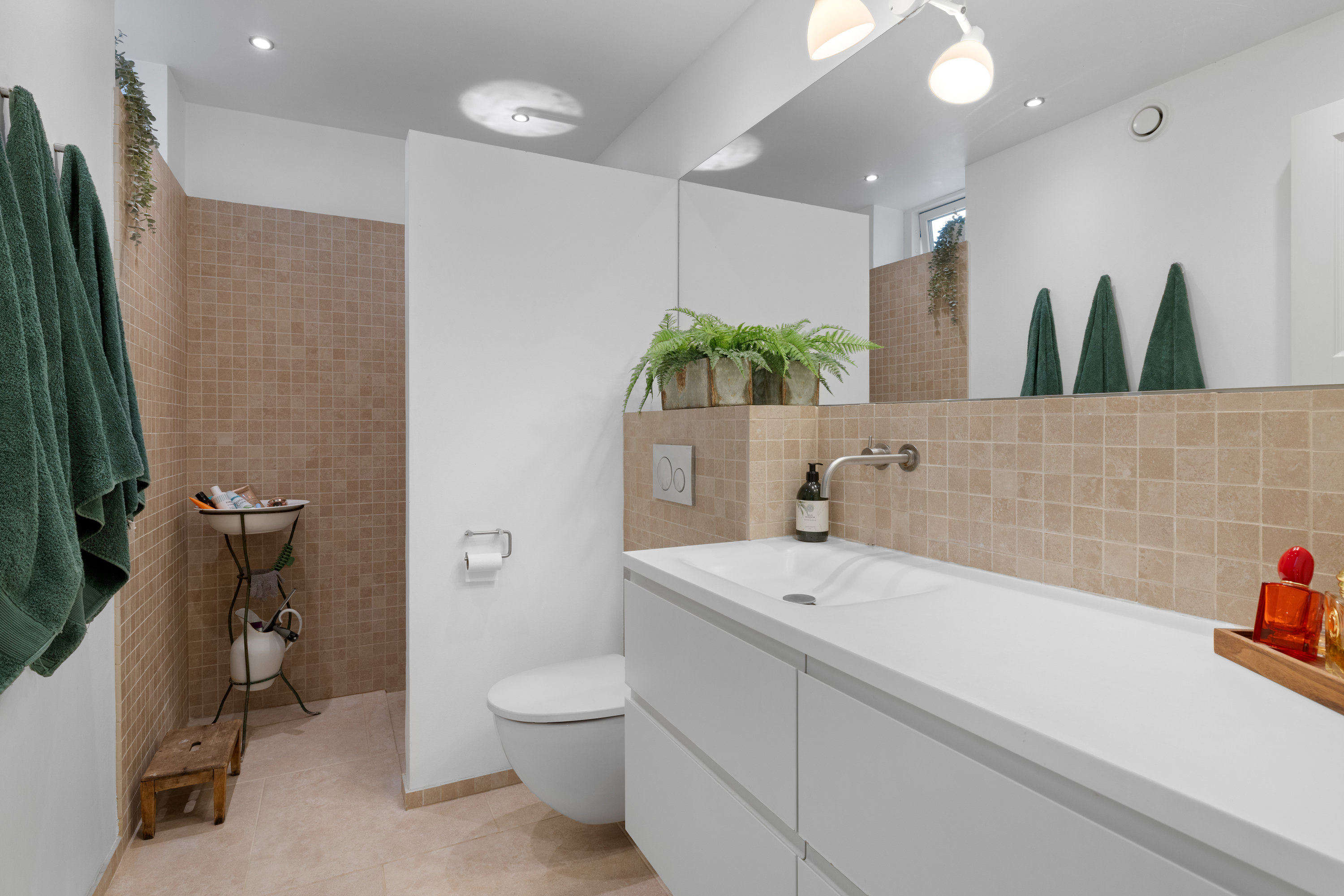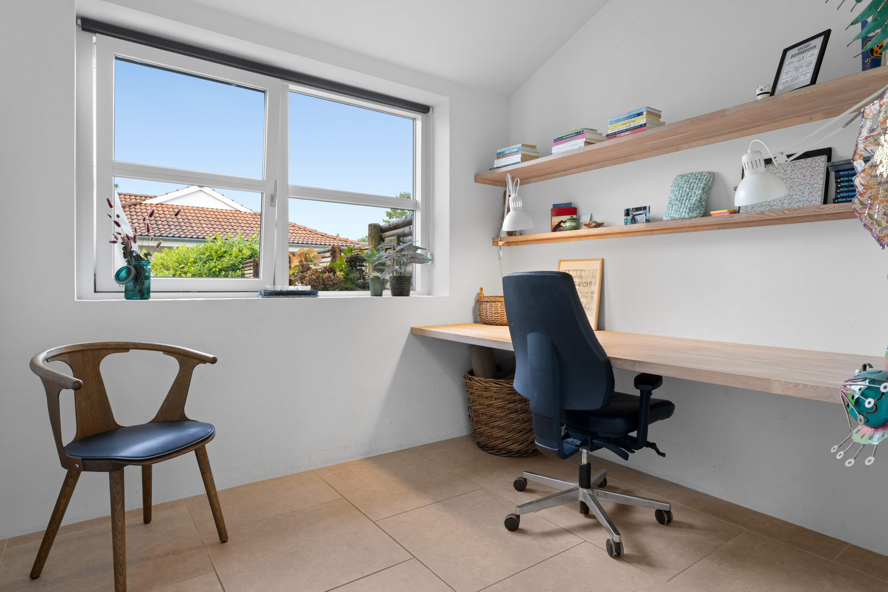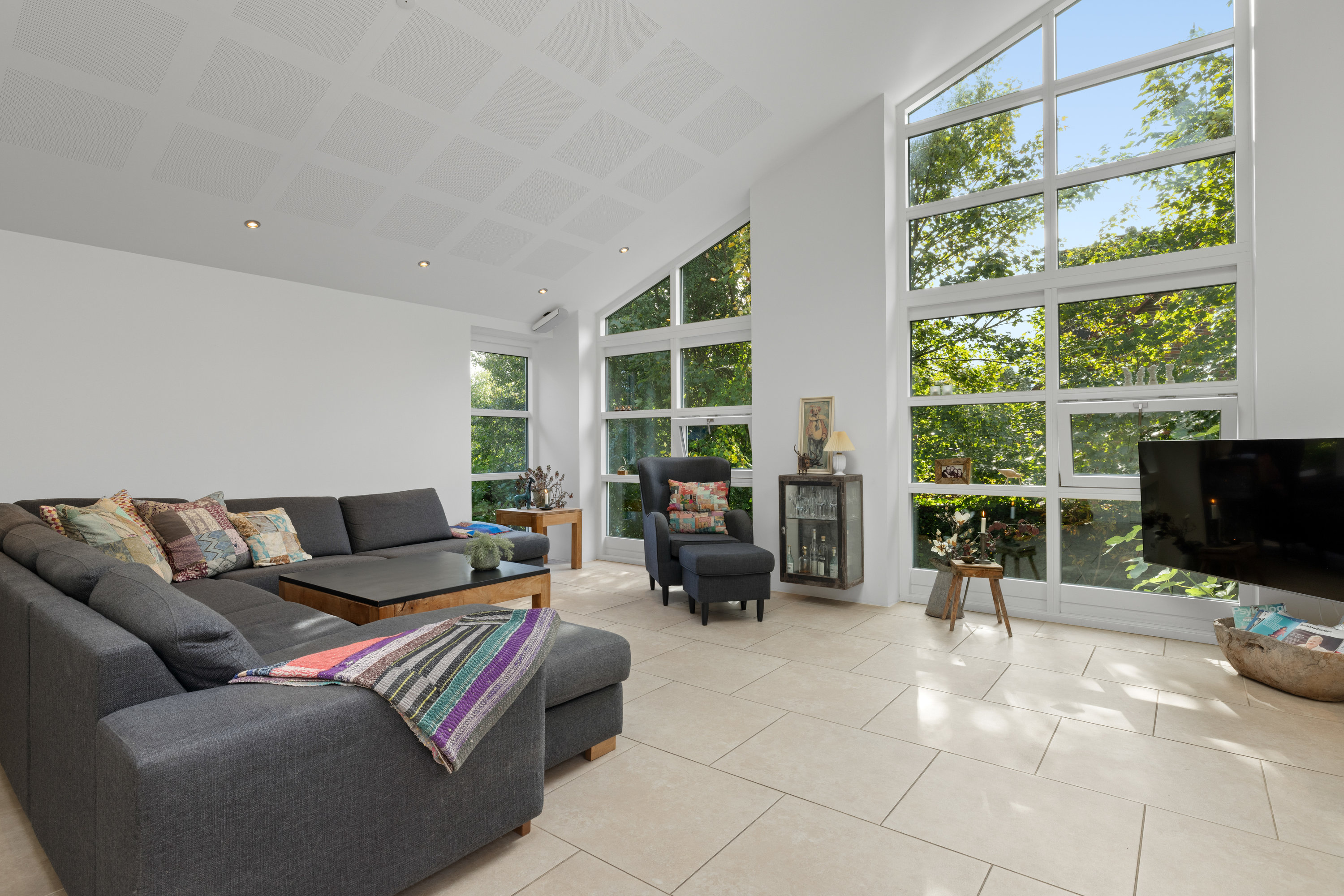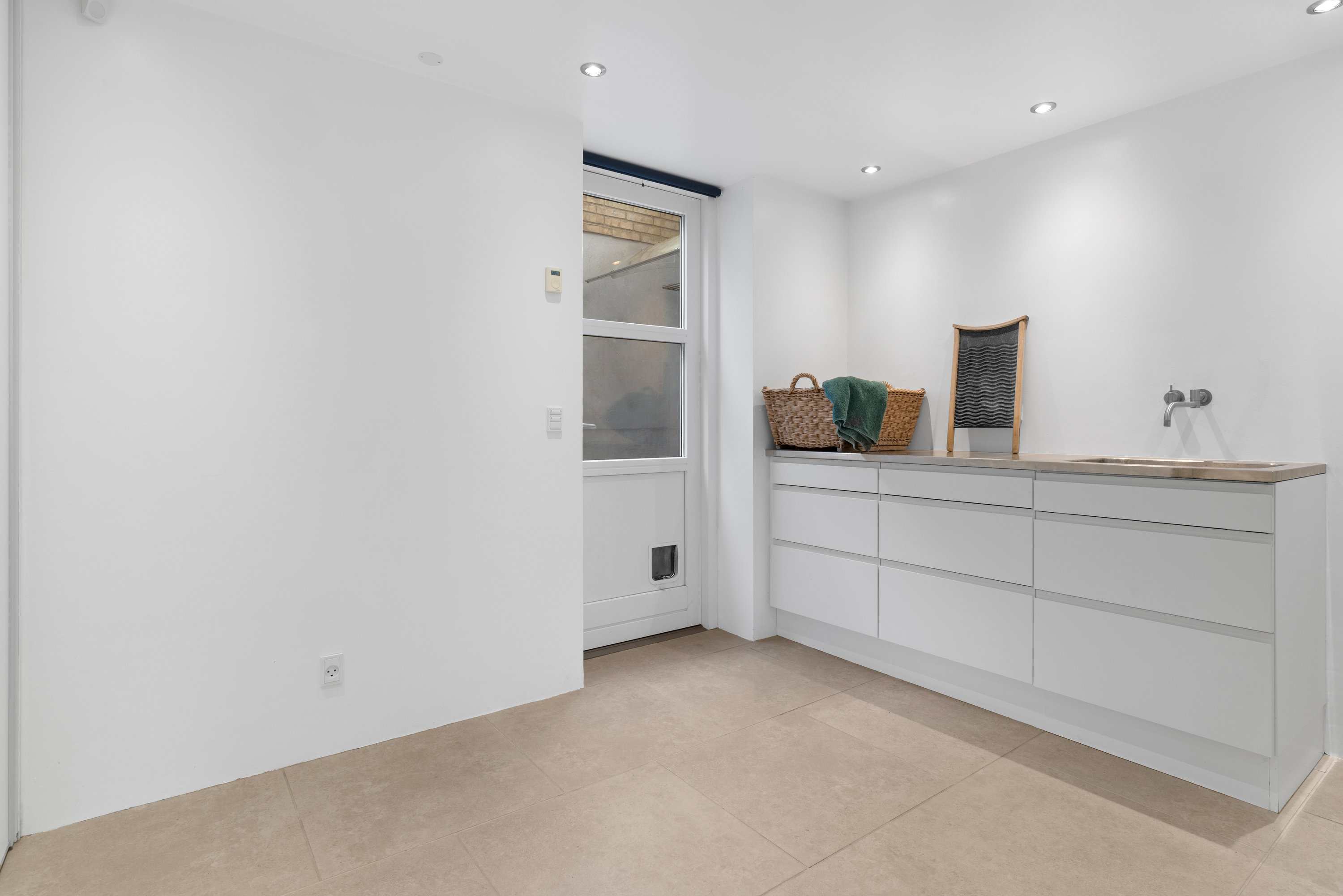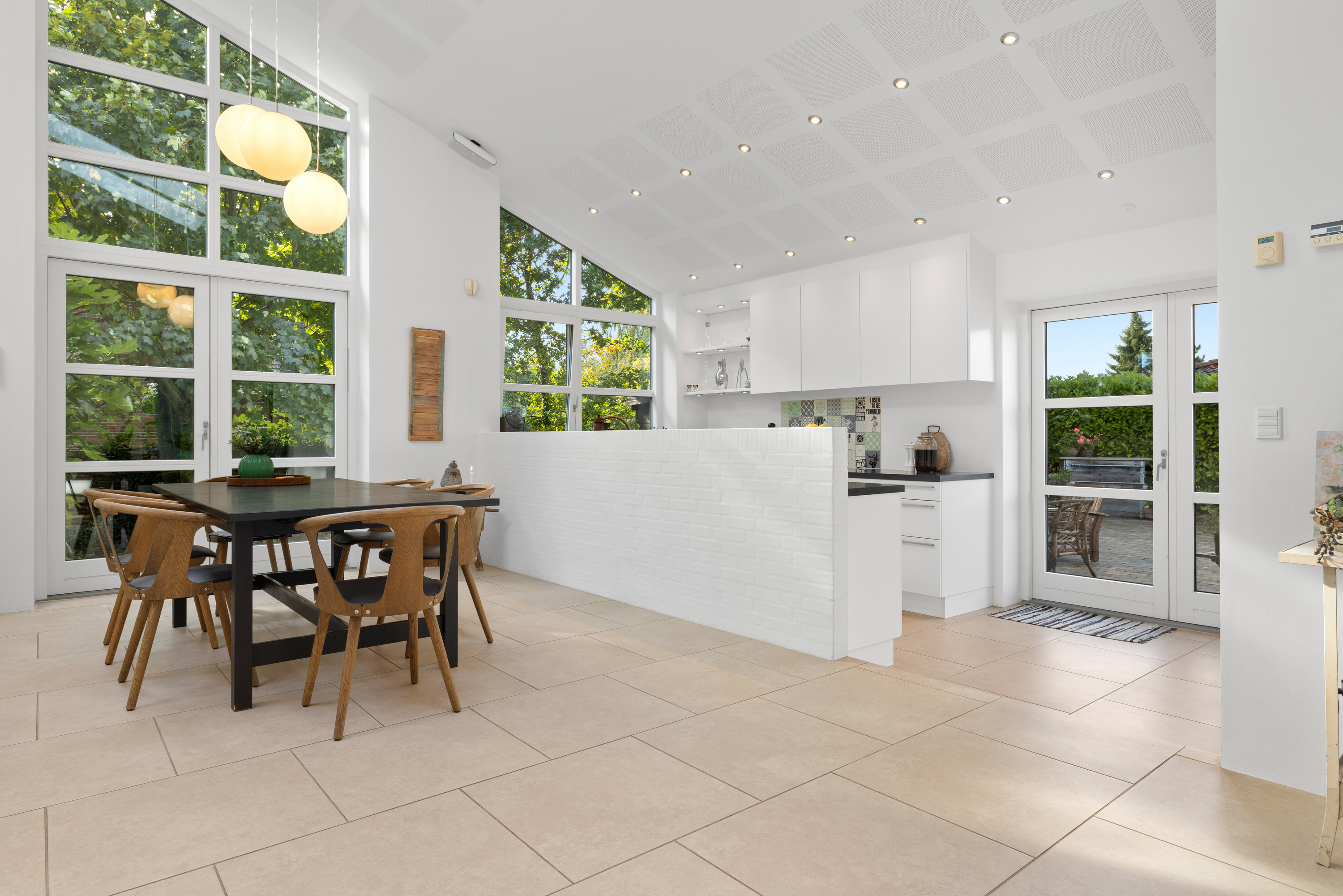 De lyse mursten spejler stranden - zinkinddækninger og hvide lavenergivinduer vidner om et tidløst og veludført byggeri, hvor kvaliteten står lysende klar. Indenfor mærkes det samme arkitektoniske overskud. Sandfarvede klinker med gulvvarme flyder gennem alle boligens rum. Lofter til kip med ovenlys trækker dagslyset helt ned i det store leverum, hvor køkken, alrum og spisestue mødes i ét sammenhængende rum med en ro, der mærkes. Multiform-køkkenet står i hvidt med mørk bordplade og virkelig fine unikke fliser ved komfuret – et køkken skabt til madglæde og kulinarisk overskud. En halvmur markerer overgangen til spiseområdet, hvor langbordet samler familie og gæster, og fra begge sider er der udgang til haven og terrassen, så lyset og luften altid er tæt på. Et par trin fører op til stuen, hvor lofterne fortsætter mod kip, og hvor vinduerne trækker blikket ud mod trækronerne. Der er god plads til både nærvær og familiehygge, og lyset bliver en del af stemningen og roen finder sin plads. Forældreafdelingen byder på soveværelse med garderobe og adgang til et luksusbadeværelse i sandfarvede nuancer, med Vola-armaturer, badekar og bruseniche – et lille stykke wellness i hverdagen. To værelser skaber plads til ro, søvn og fordybelse, og et fint gæstetoilet fuldender etagen. Underetagen/kælderen åbner sig som et ekstra plan med 3 store, lyse rum og en rummelighed, der mærkes. Her er plads til teenagernes univers, gæsteafdeling, hjemmekontor eller et stille rum til fordybelse. Et badeværelse i samme stil som ovenpå fuldender etagen, mens bryggerset med egen indgang gør hverdagen praktisk og let.
