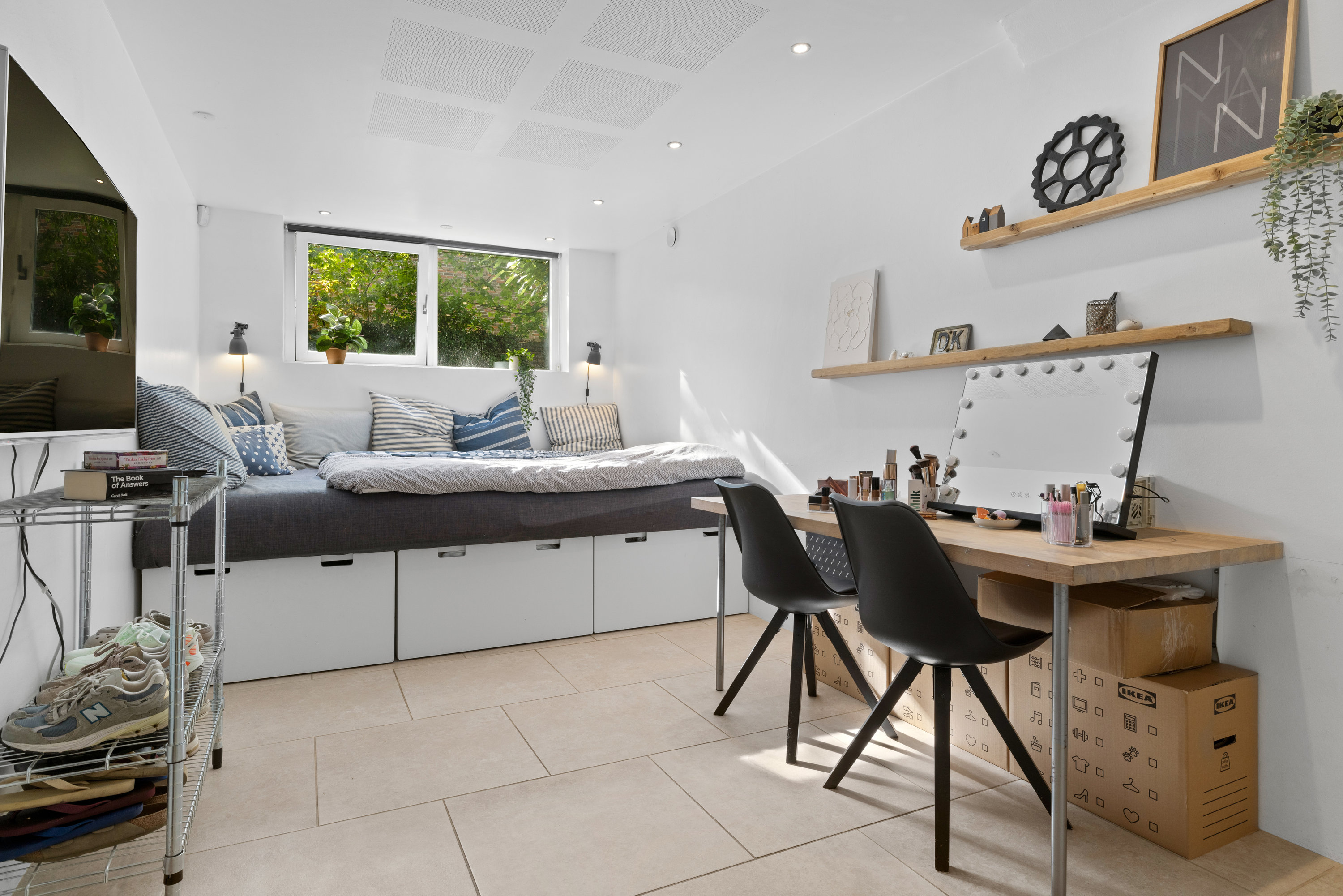 Kvarteret omkring Gl. Køgevej har sin egen fortælling – fra dengang kysten var præget af små sommerhuse og badehoteller til nutidens rolige villakvarter, hvor natur og nærhed stadig sætter tonen. Trylleskoven ligger en kort gåtur herfra, og stranden med sit fine sand og klare vand kalder på både morgendukkerter og aftenture langs vandet. Grunden er anlagt med ro og privatliv for øje. Det store terrassemiljø vender mod sydvest, afgrænset af hegn på den ene side og en fin væg med små vinduer til haven, hvor græsset breder sig under høje træer. Et intimt uderum til morgenkaffen i solens første stråler, til de lange middage under åben himmel og til de stille aftener, hvor dagen får lov at runde af i ro. Et isoleret udhus samt god parkering foran huset fuldender helheden.