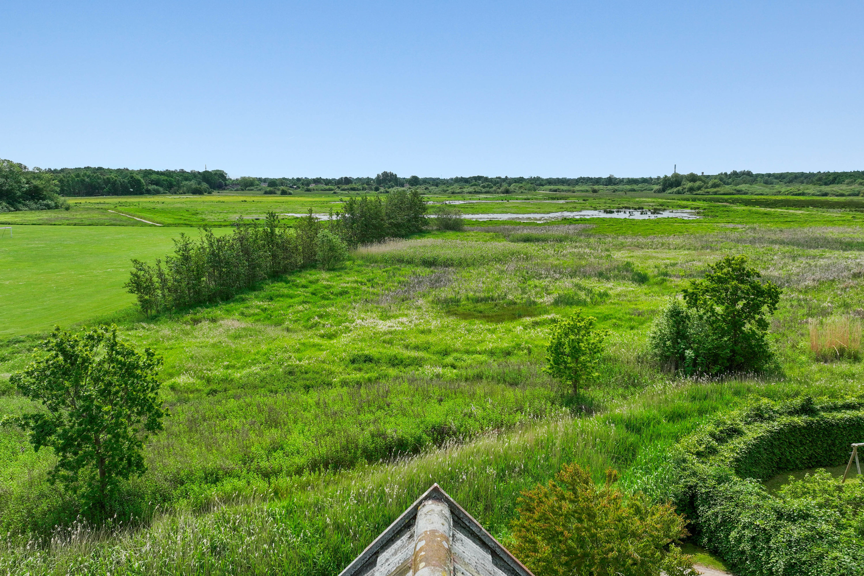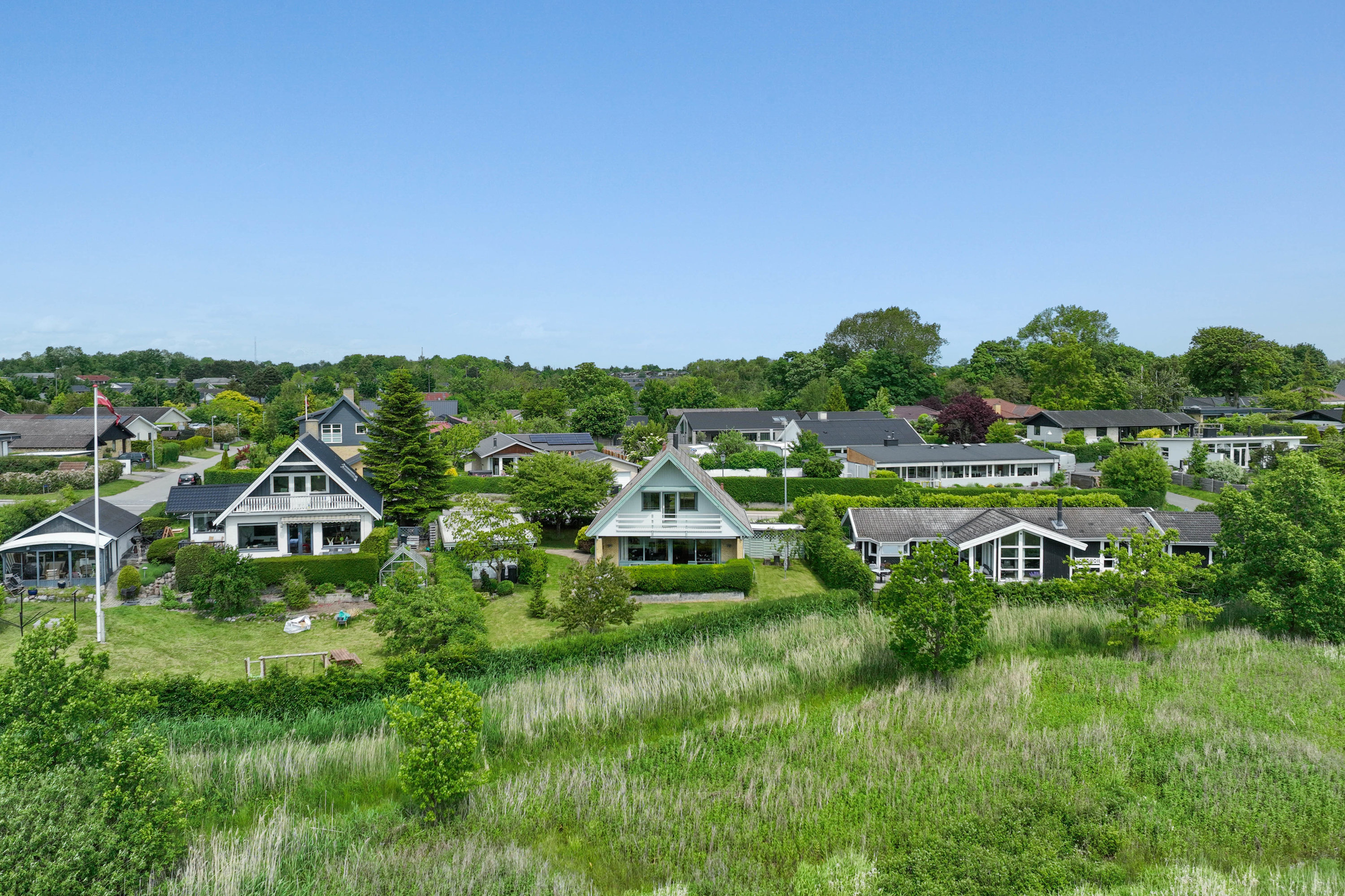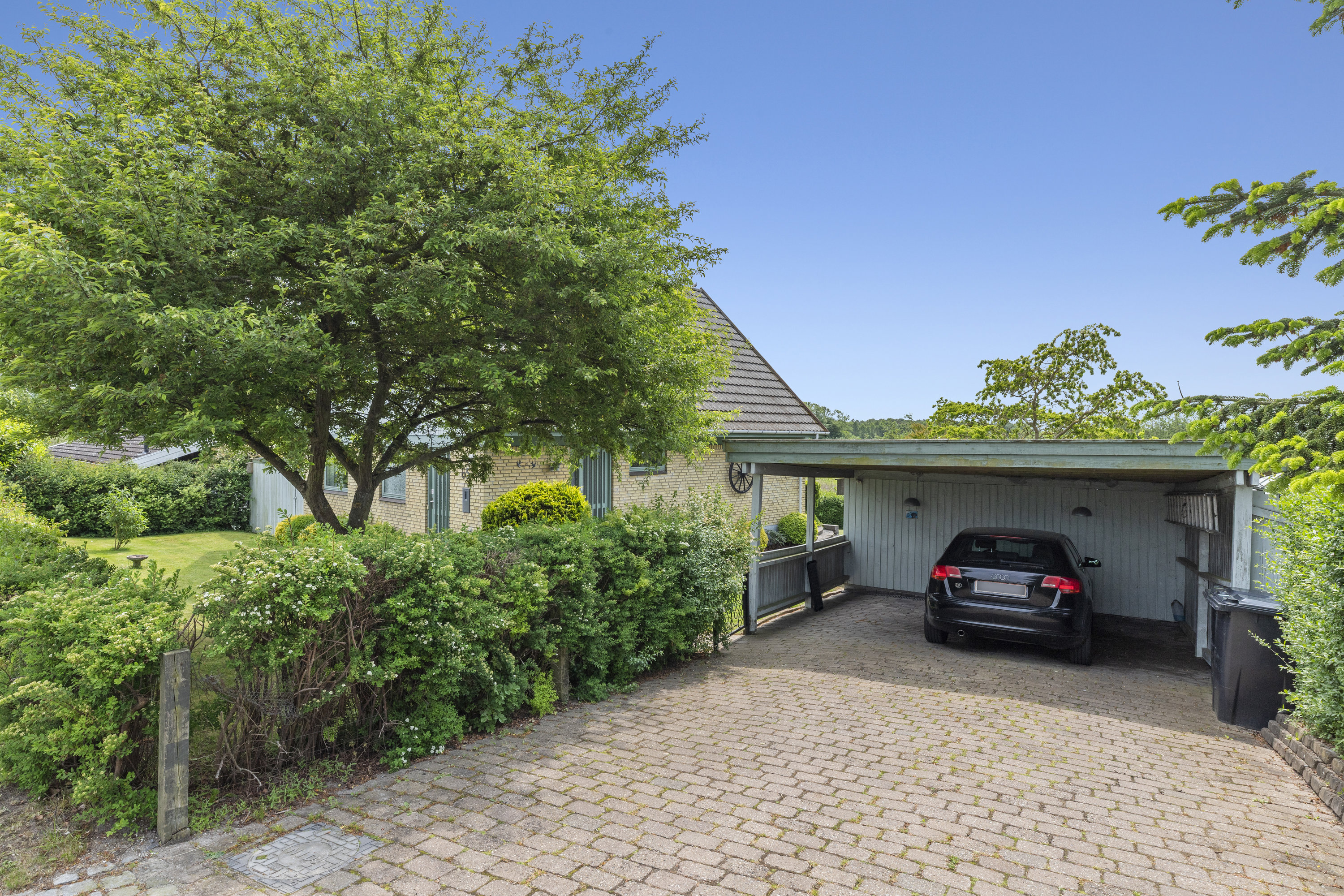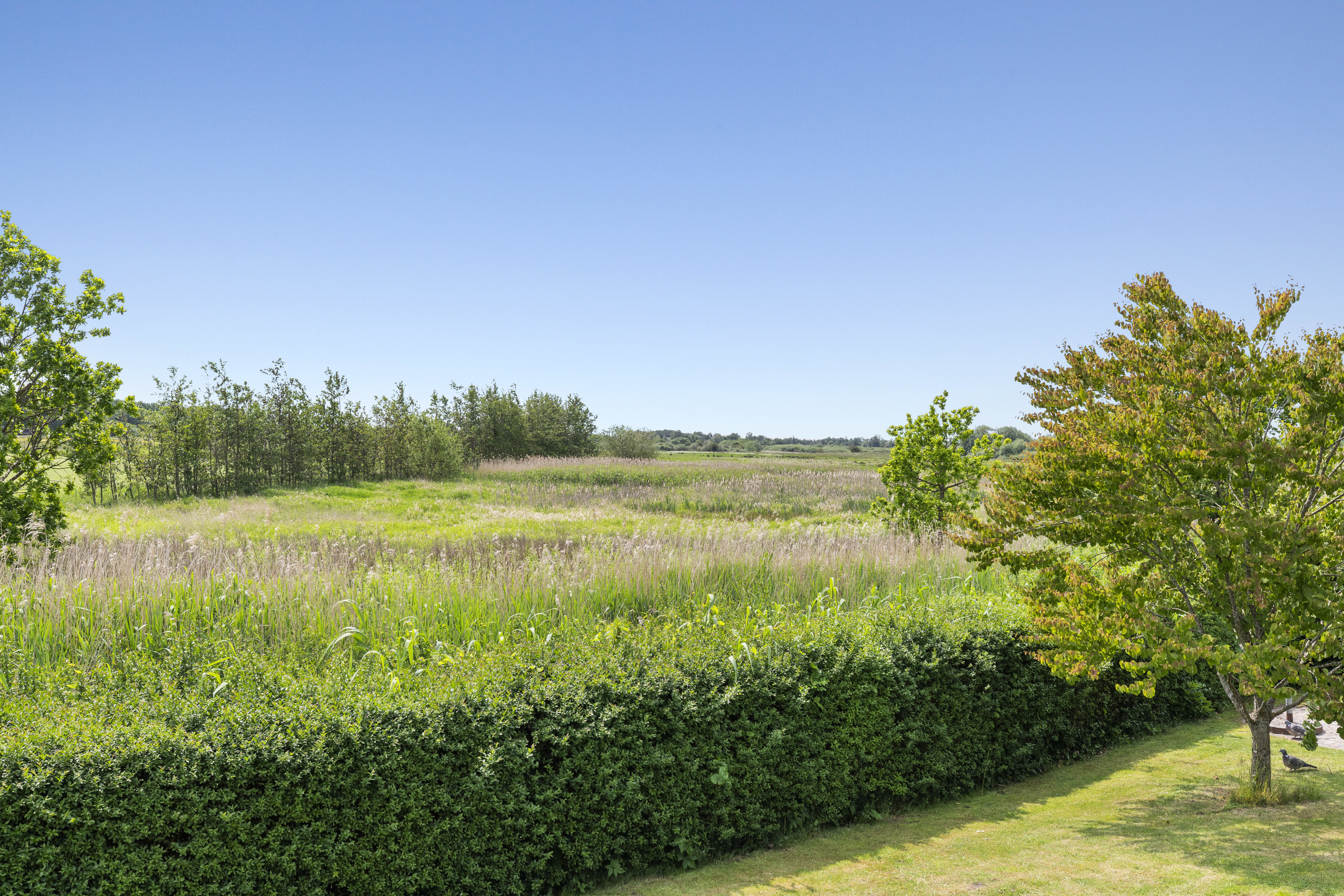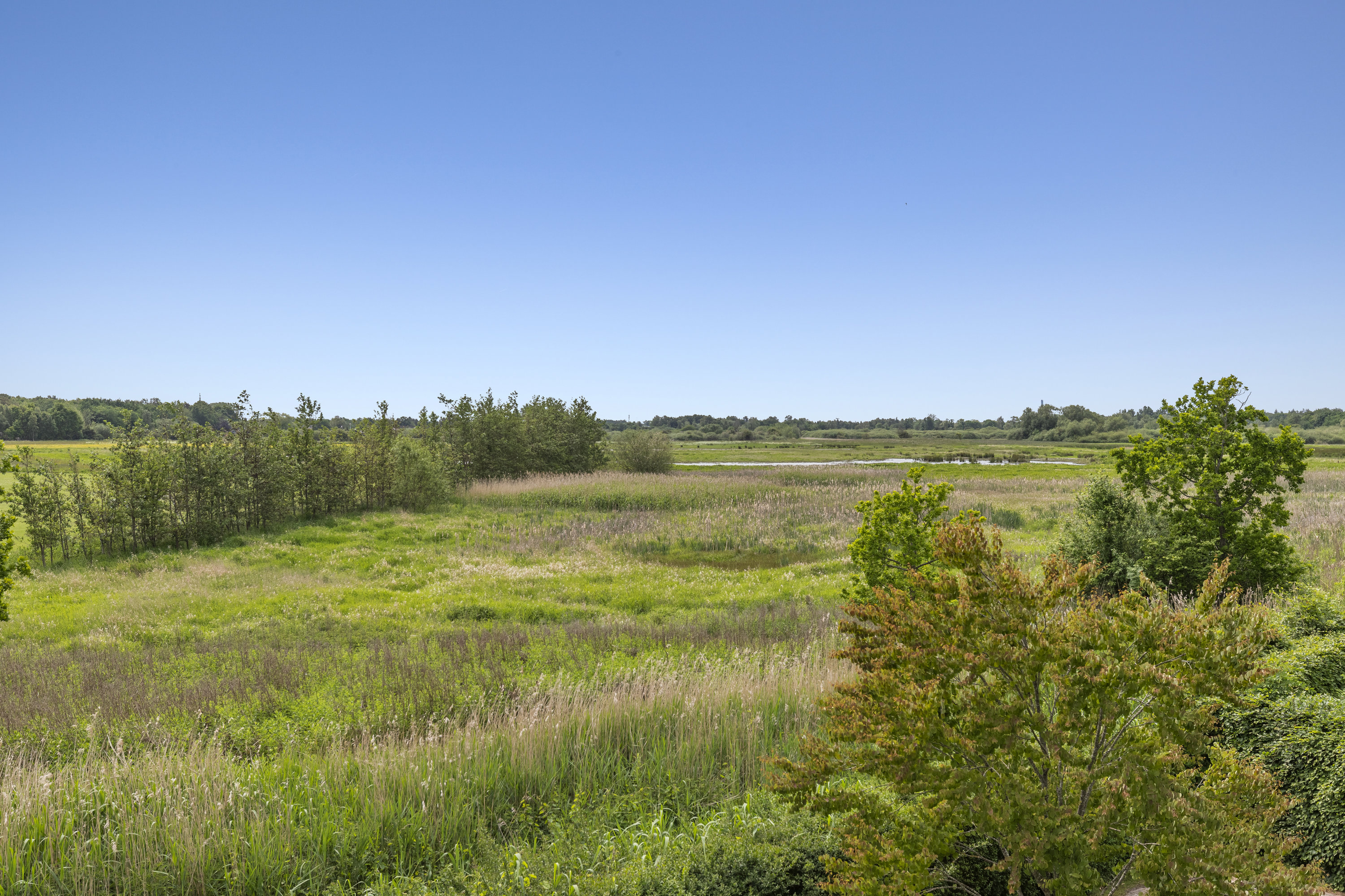 Bag huset åbner landskabet sig mod mosen – et fredet naturområde med enge, siv og vandløb, hvor fuglene trækker spor over himlen, og hvor rådyret indimellem står stille i morgensolen. Her er naturen altid nær, foranderlig og betagende året rundt. Fliseterrassen ligger lunt og solrigt, med markise til skygge på varme dage – og perfekt plads til havemøbler og sommerens lange dage - nyd et glas kold hvidvin og duften af grill, mens solen går ned. Græsplænen foran er oplagt til bold, leg og barfodede skridt, Hele haven føles som en naturlig forlængelse af det åbne landskab. Dobbelt carport og udhus fuldender det praktiske, og omkring dig venter et nabolag med varme relationer og ro – tæt på skole, indkøb, station og stranden, hvor badebroer og bølger lokker hele sommeren. Fra havelågen kan du gå direkte ud i naturen og tage stierne rundt – til fods eller i løbesko. Stranden, badebroen og det klare vand ligger få minutter væk på cykel, og Strandskolen nås på fire minutter i sadlen. Indkøb og tog ligger også tæt på – og hele området emmer af overskuelighed og nærhed.