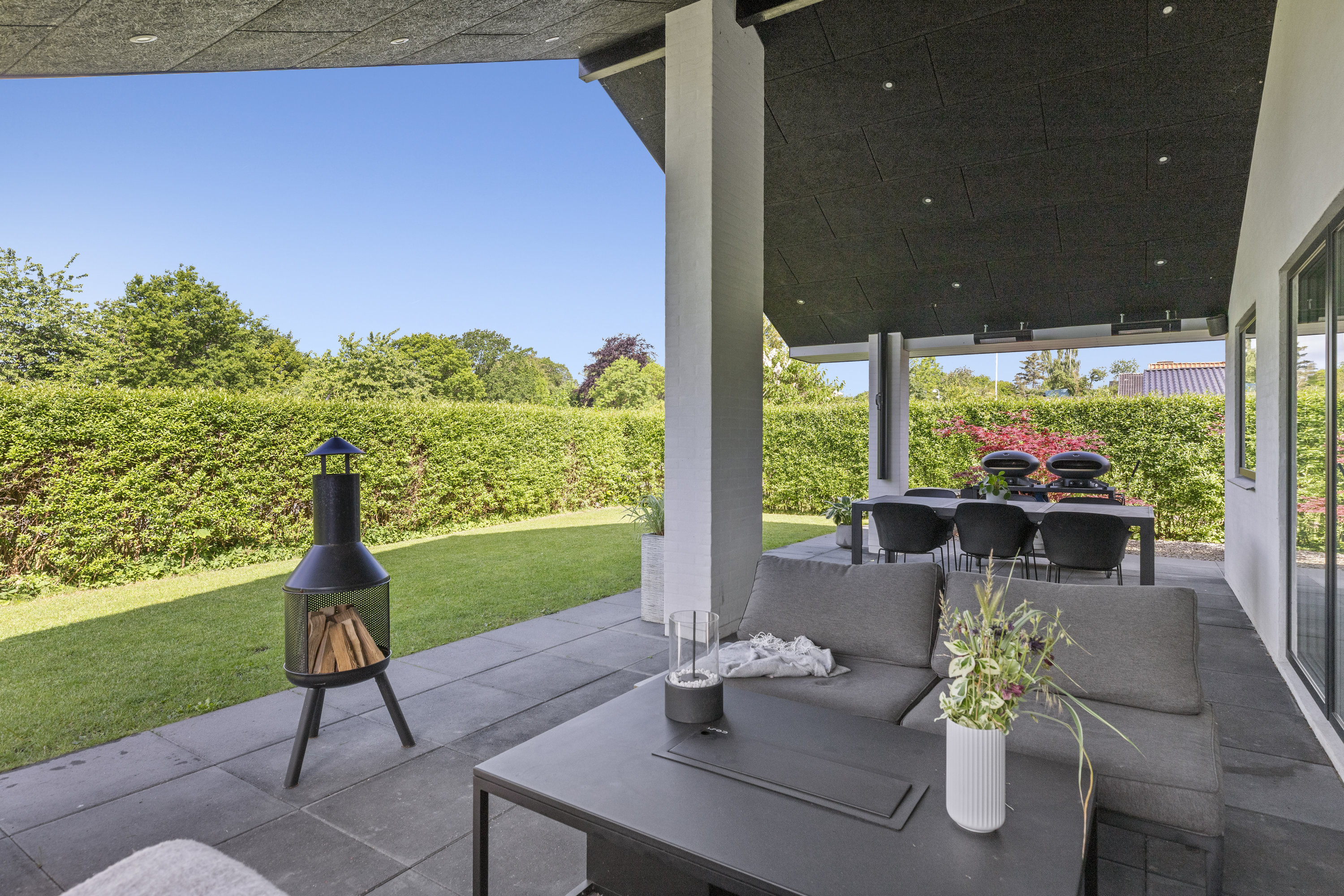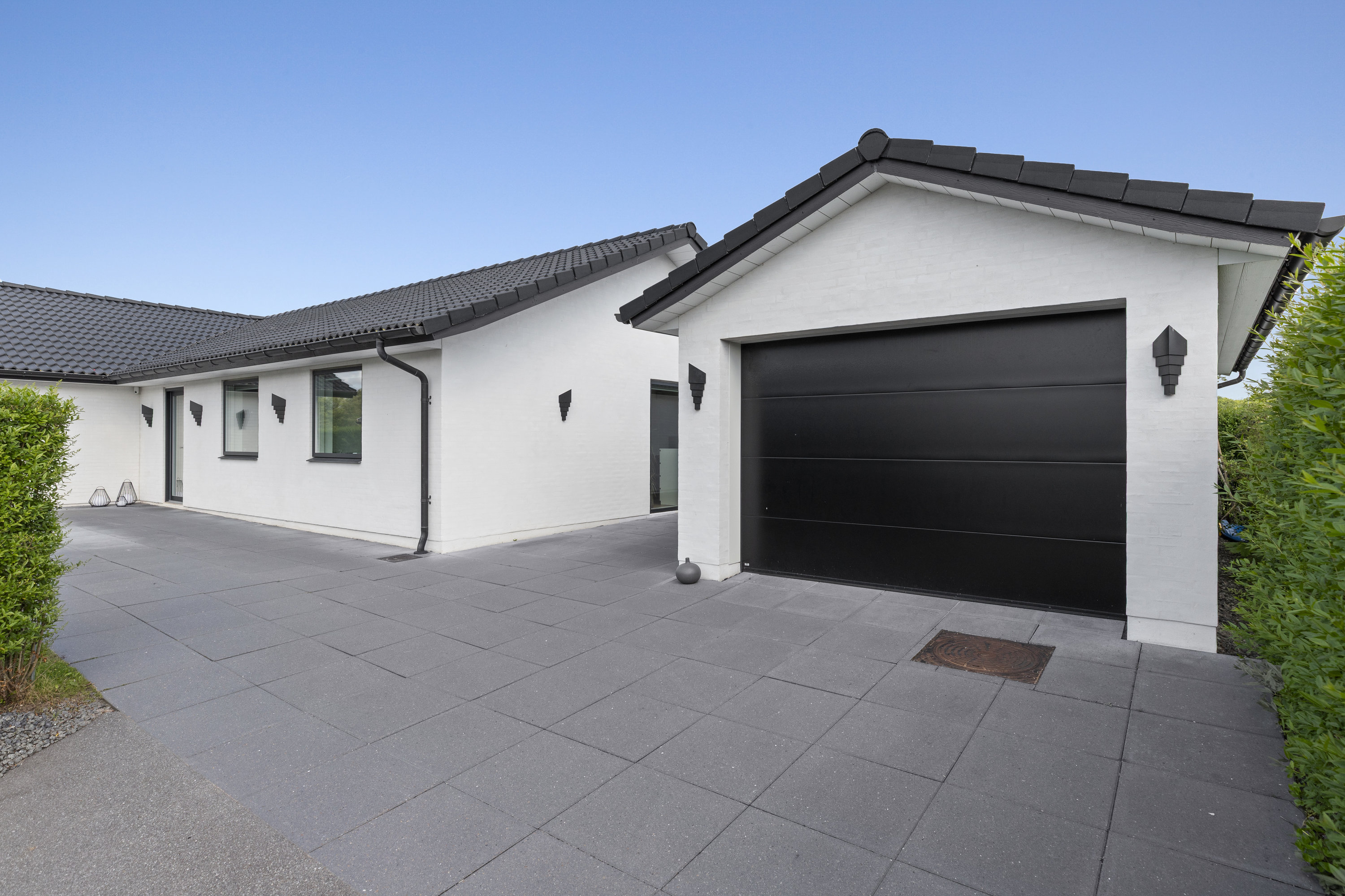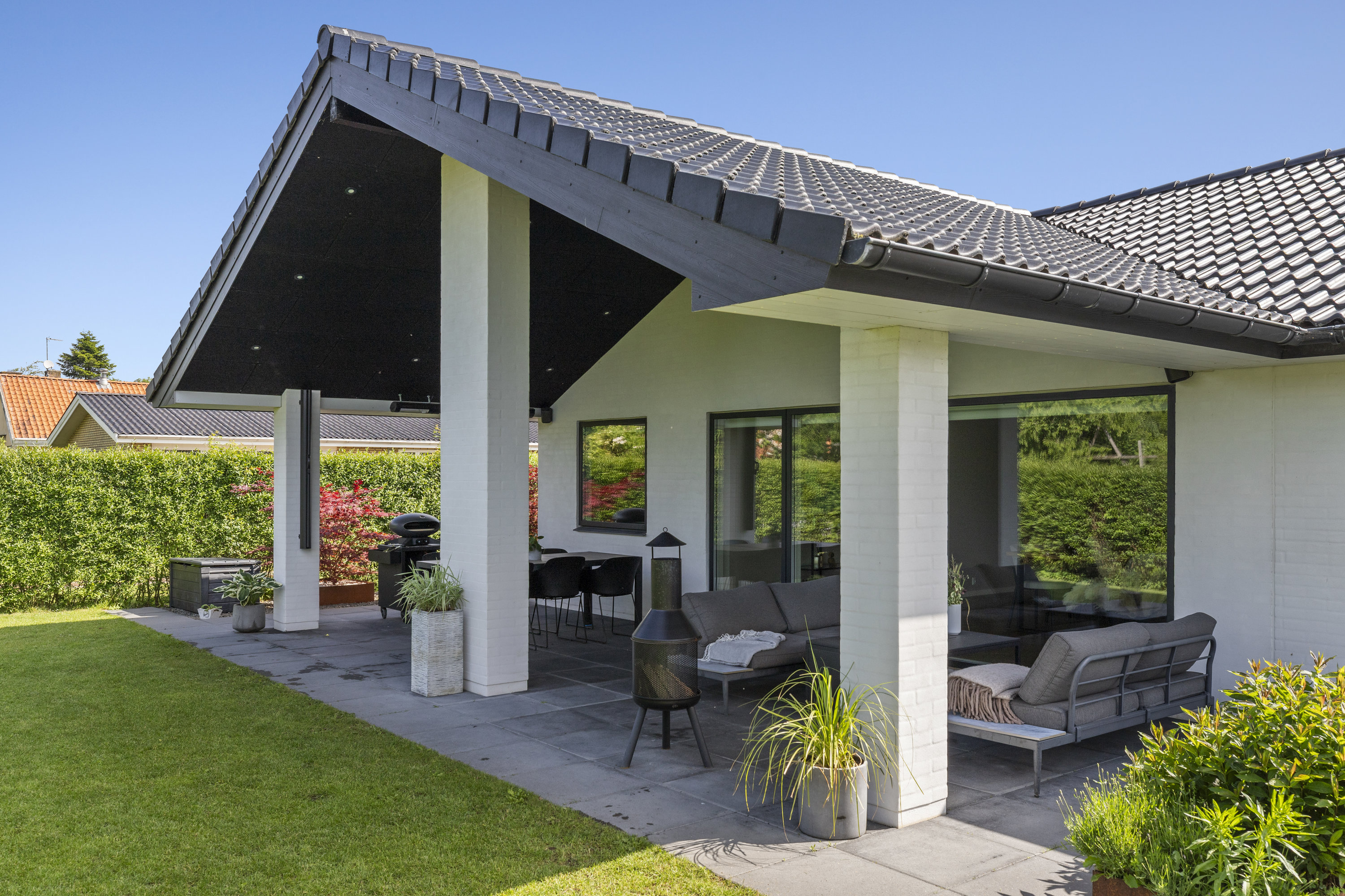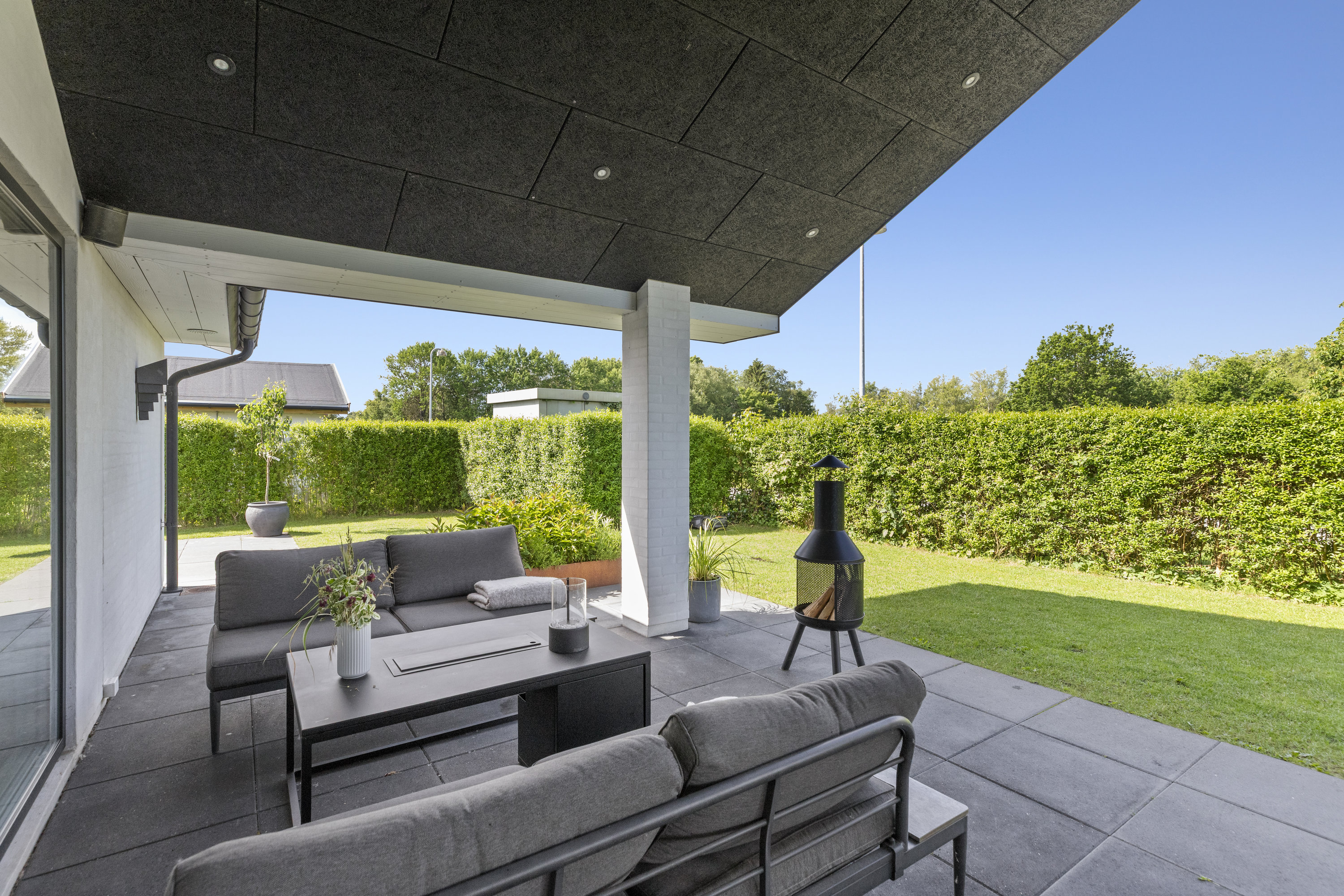 Huset omkranses af et gennemtænkt terrassemiljø med fliser hele vejen rundt og flere solrige kroge. Den overdækkede terrasse med loft til kip og indbyggede spots skaber et stemningsfuldt frirum, hvor loungemøbler, liggestole og grill kan nydes med udsigt til skov og åbne vidder. Garagen matcher husets arkitektur og fuldender den gennemførte stil. Her leves livet i rolige omgivelser, hvor naturens farvespil følger årstiderne, og stisystemerne inviterer til gåture mellem mose og skov. Skole, indkøb og Køge Torv ligger tæt på, og Køge Nord Station giver kun 11 minutter til København.
