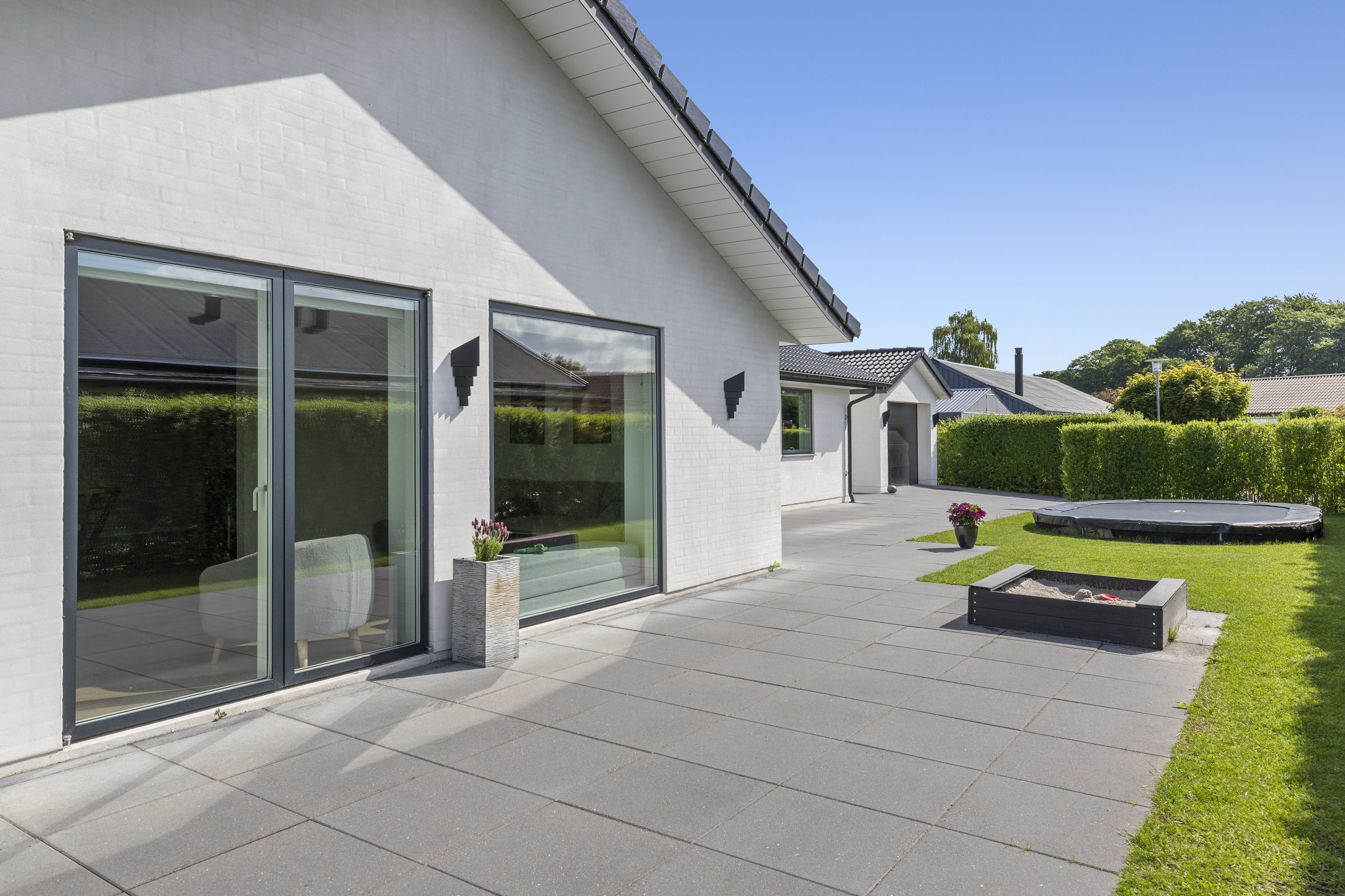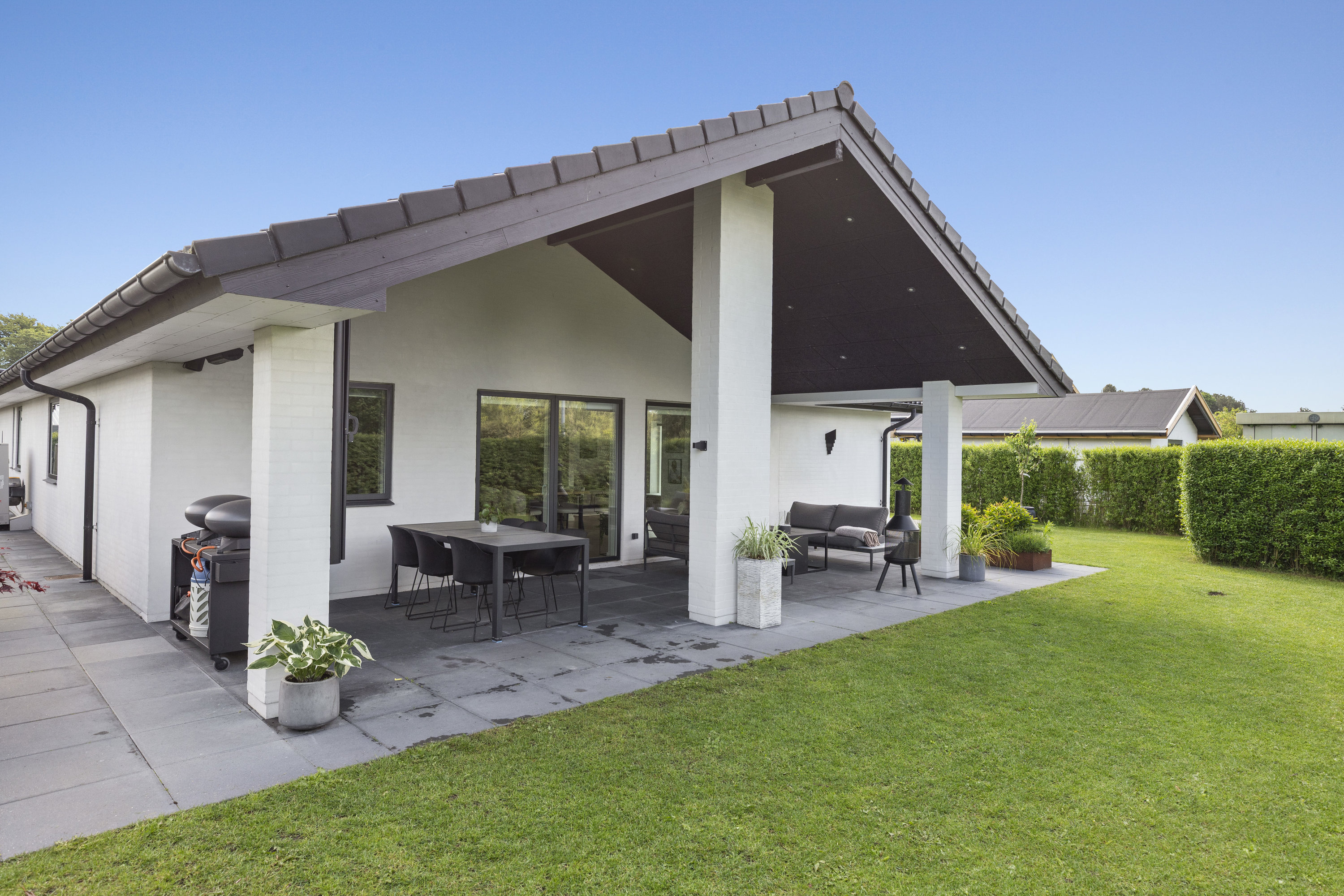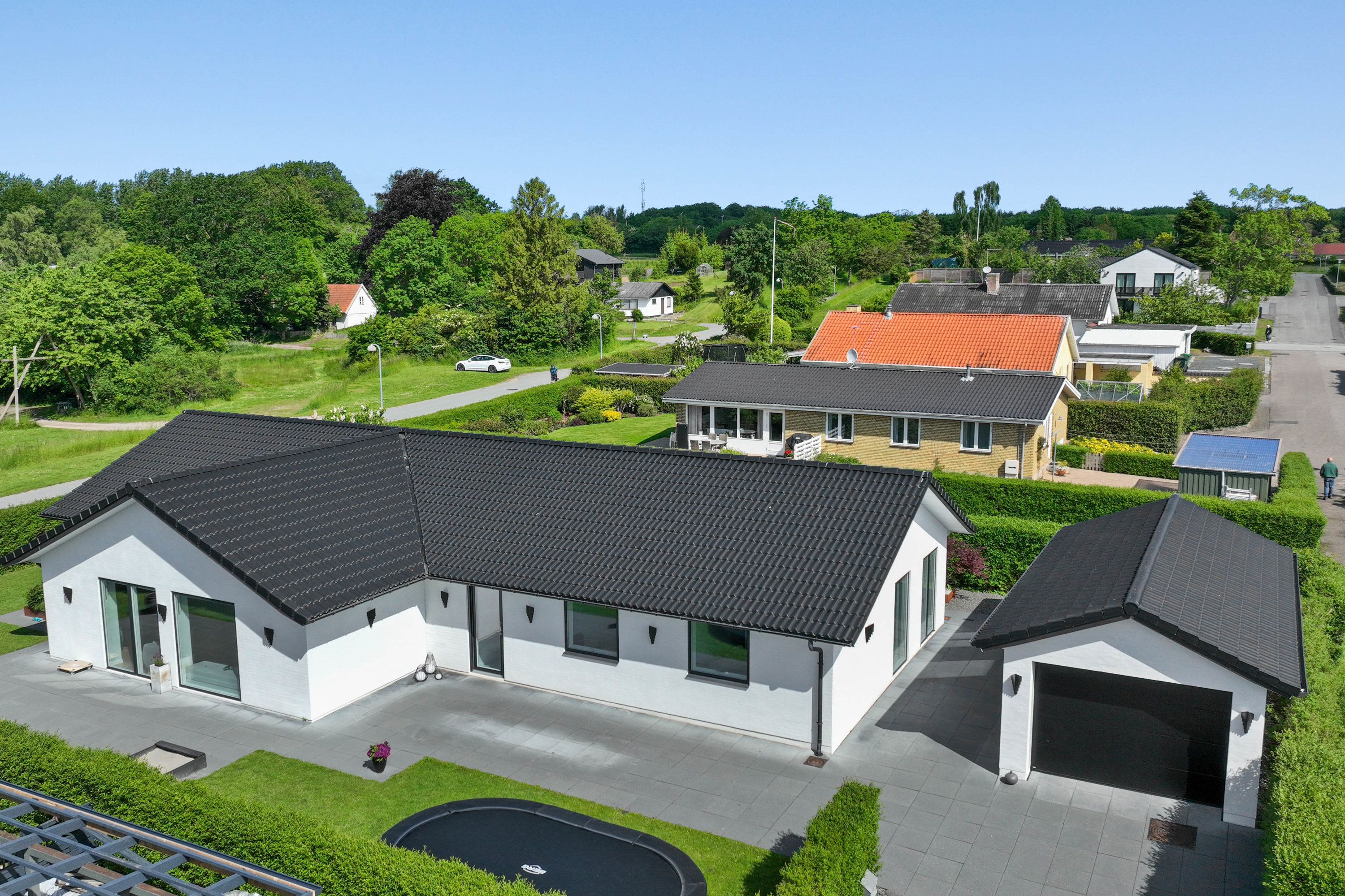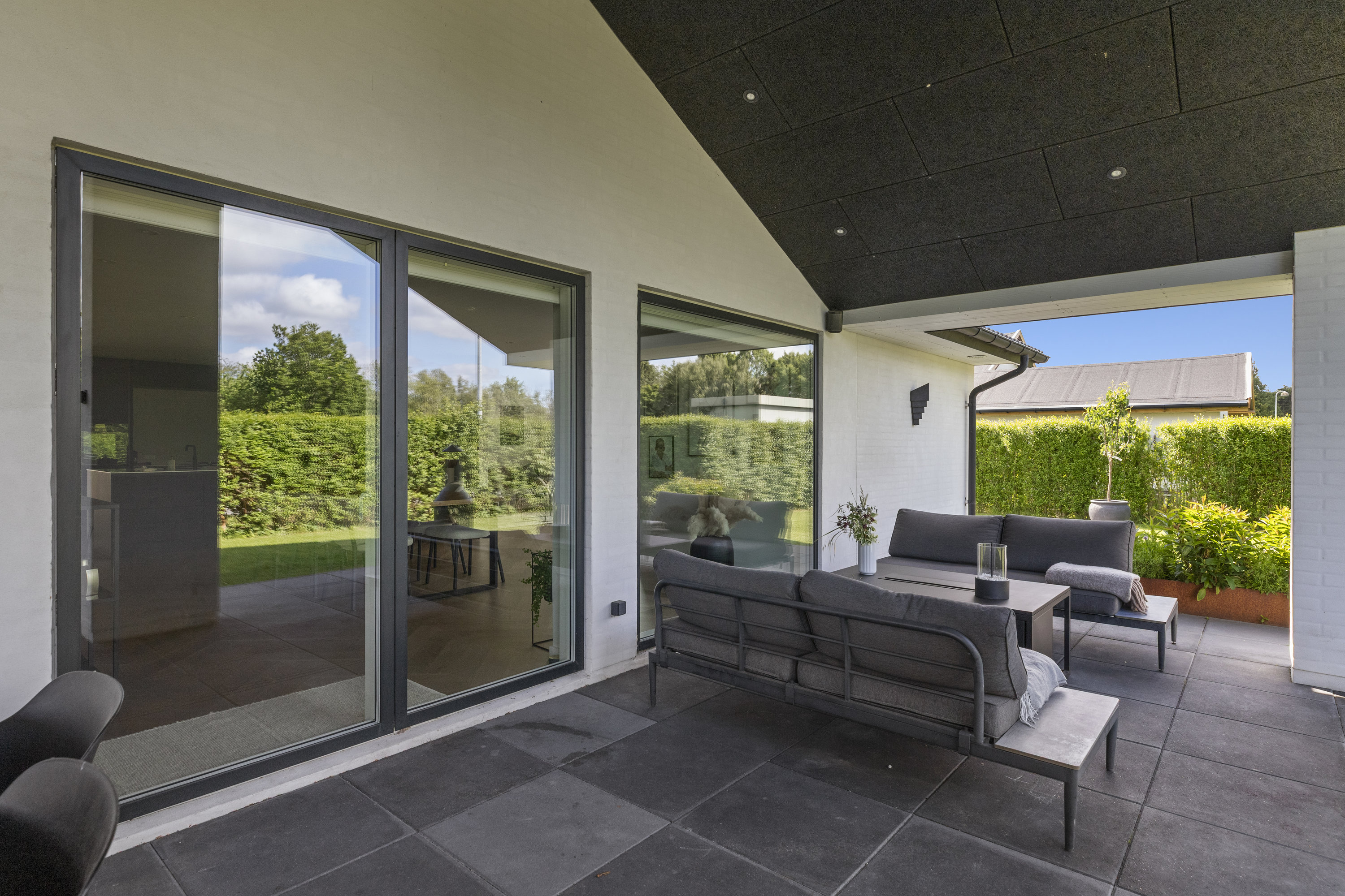 Huset omkranses af et gennemtænkt terrassemiljø med fliser hele vejen rundt og flere solrige kroge. Den overdækkede terrasse med loft til kip og indbyggede spots skaber et stemningsfuldt frirum, hvor loungemøbler, liggestole og grill kan nydes med udsigt til skov og åbne vidder. Garagen matcher husets arkitektur og fuldender den gennemførte stil. Her leves livet i rolige omgivelser, hvor naturens farvespil følger årstiderne, og stisystemerne inviterer til gåture mellem mose og skov. Skole, indkøb og Køge Torv ligger tæt på, og Køge Nord Station giver kun 11 minutter til København.