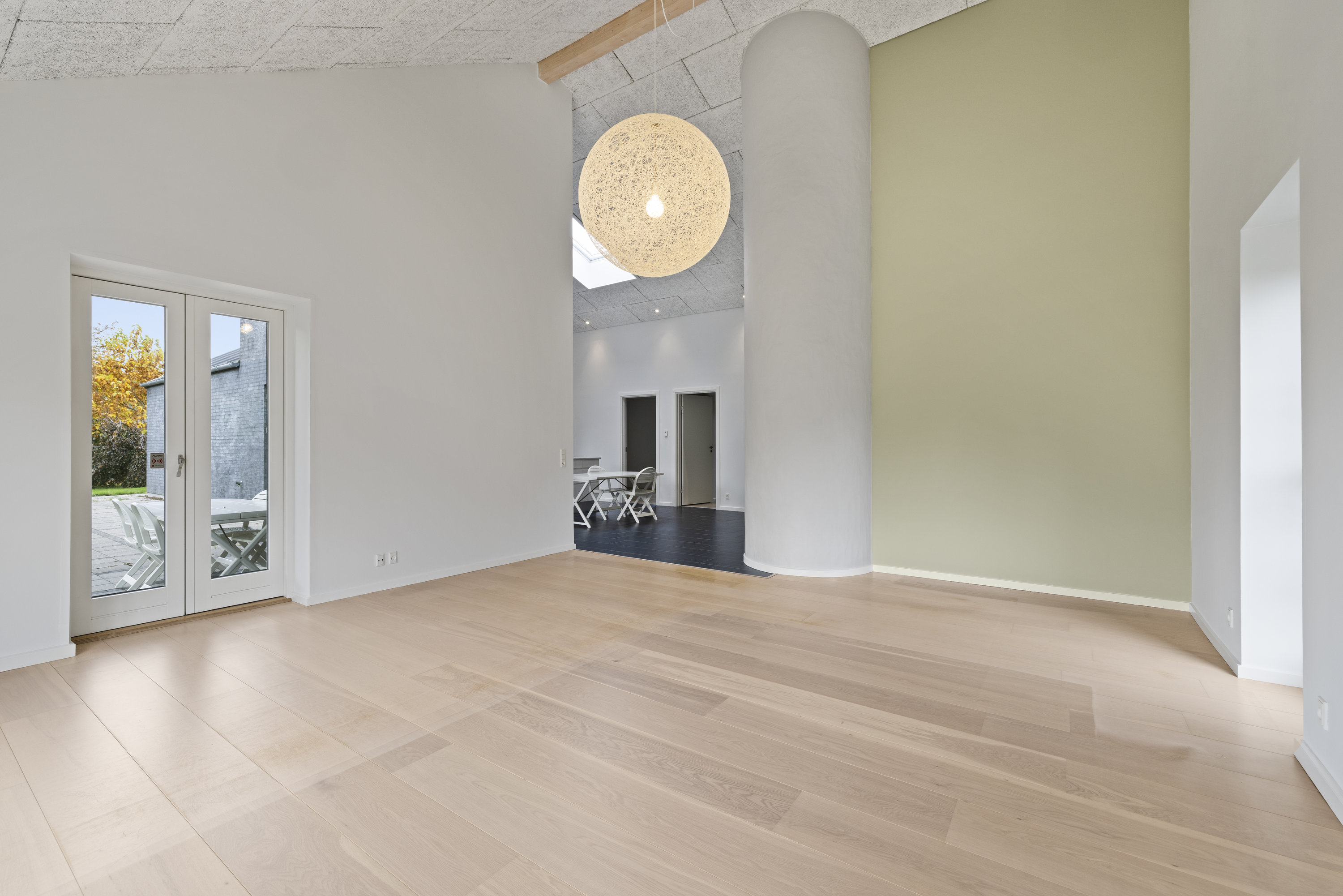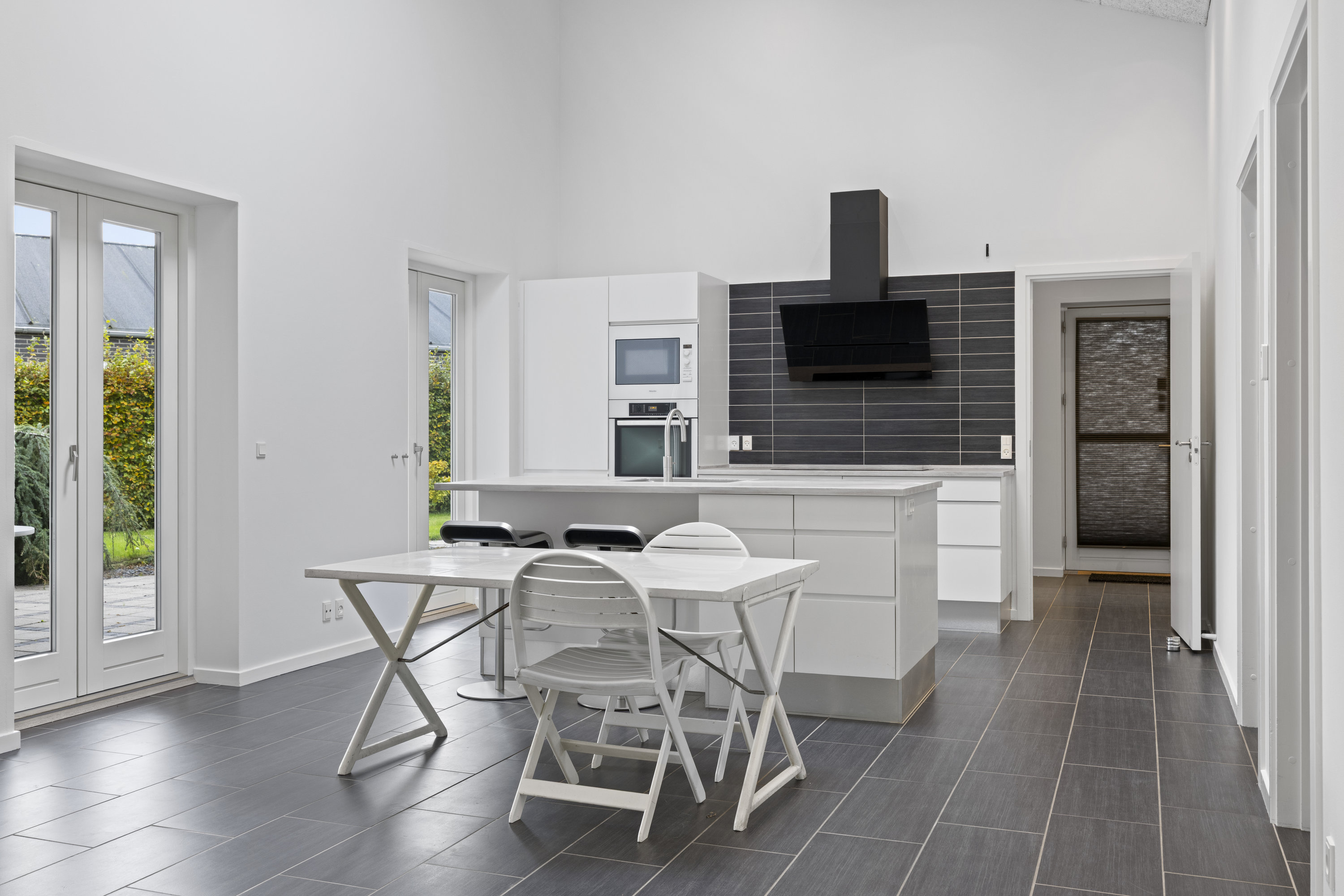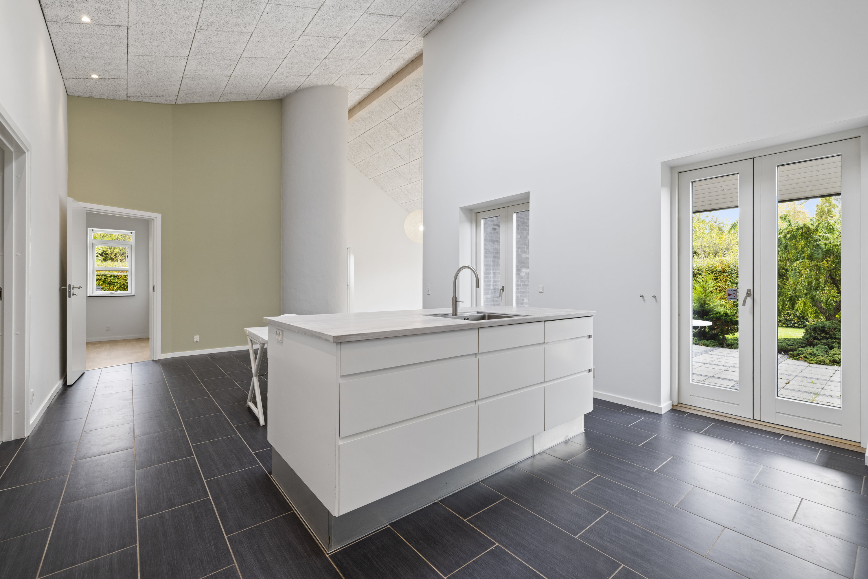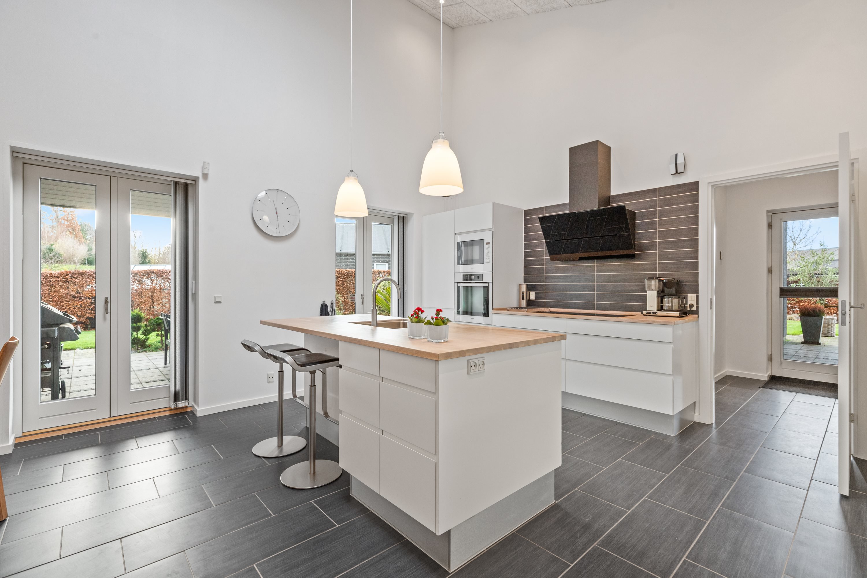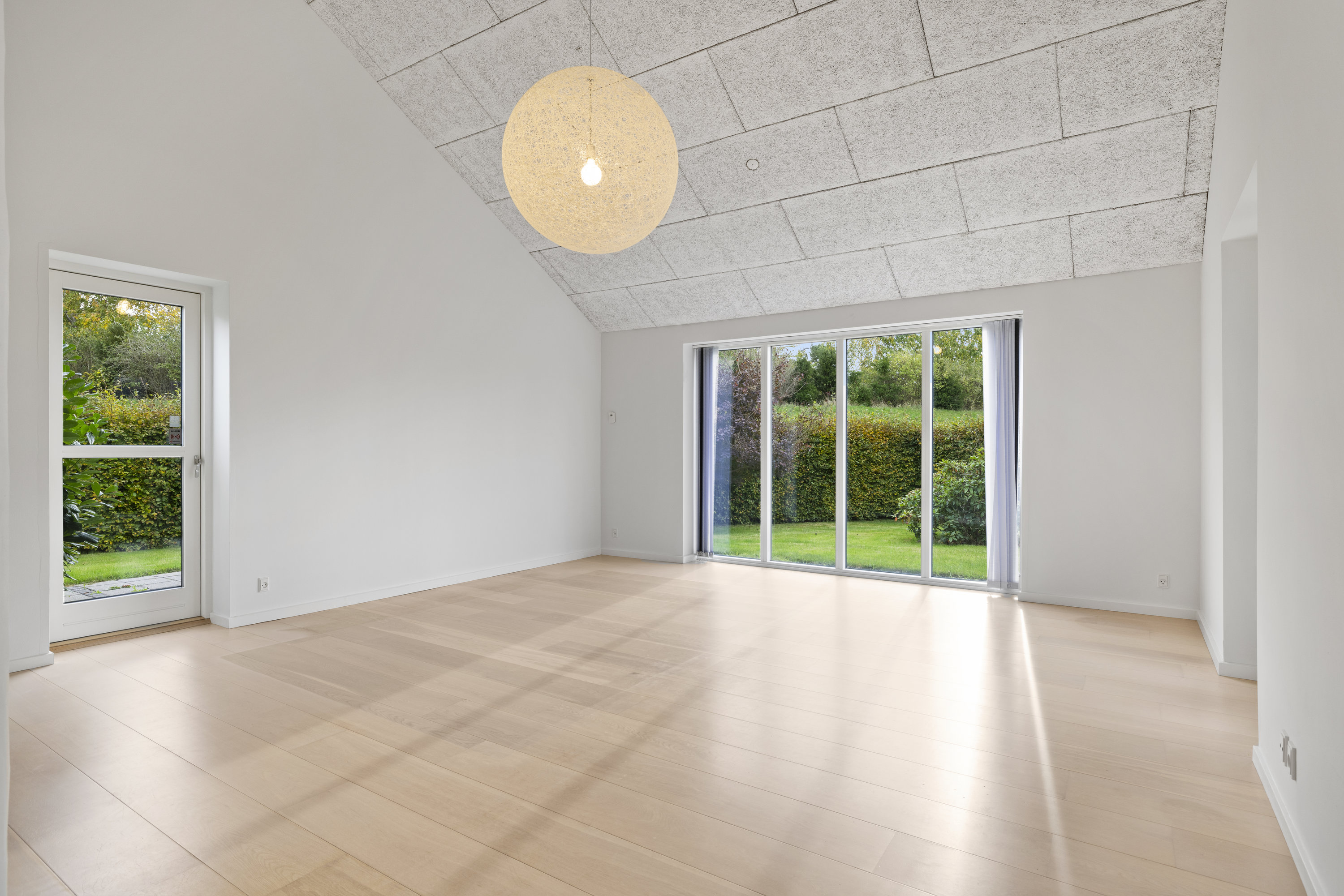 Fornemmelsen af plads og lys rammer dig, så snart du træder indenfor. Lofterne løfter sig til kip, og de store vinduespartier trækker lyset ind fra alle sider. Ovenlysvinduerne lader det glide ned i køkken/alrummet og giver den helt rigtige fornemmelse af luft og åbenhed. Det klassiske Tvis-samtalekøkken med fritstående ø og plads til højstole samler familien om mad, snak og nærvær. Opholdsstuen åbner sig mod haven med store vinduespartier og udgang til terrassen. Her opløses grænsen mellem inde og ude, og dagslyset bliver en del af indretningen. Tre soveværelser giver plads til ro og fordybelse, mens to flotte badeværelser – det ene med en imponerende bruseniche i rør til loft – fuldender helheden. Energirigtig fjernvarme sørger for, at varmen breder sig diskret i alle gulvene og skaber en behagelig atmosfære året rundt.