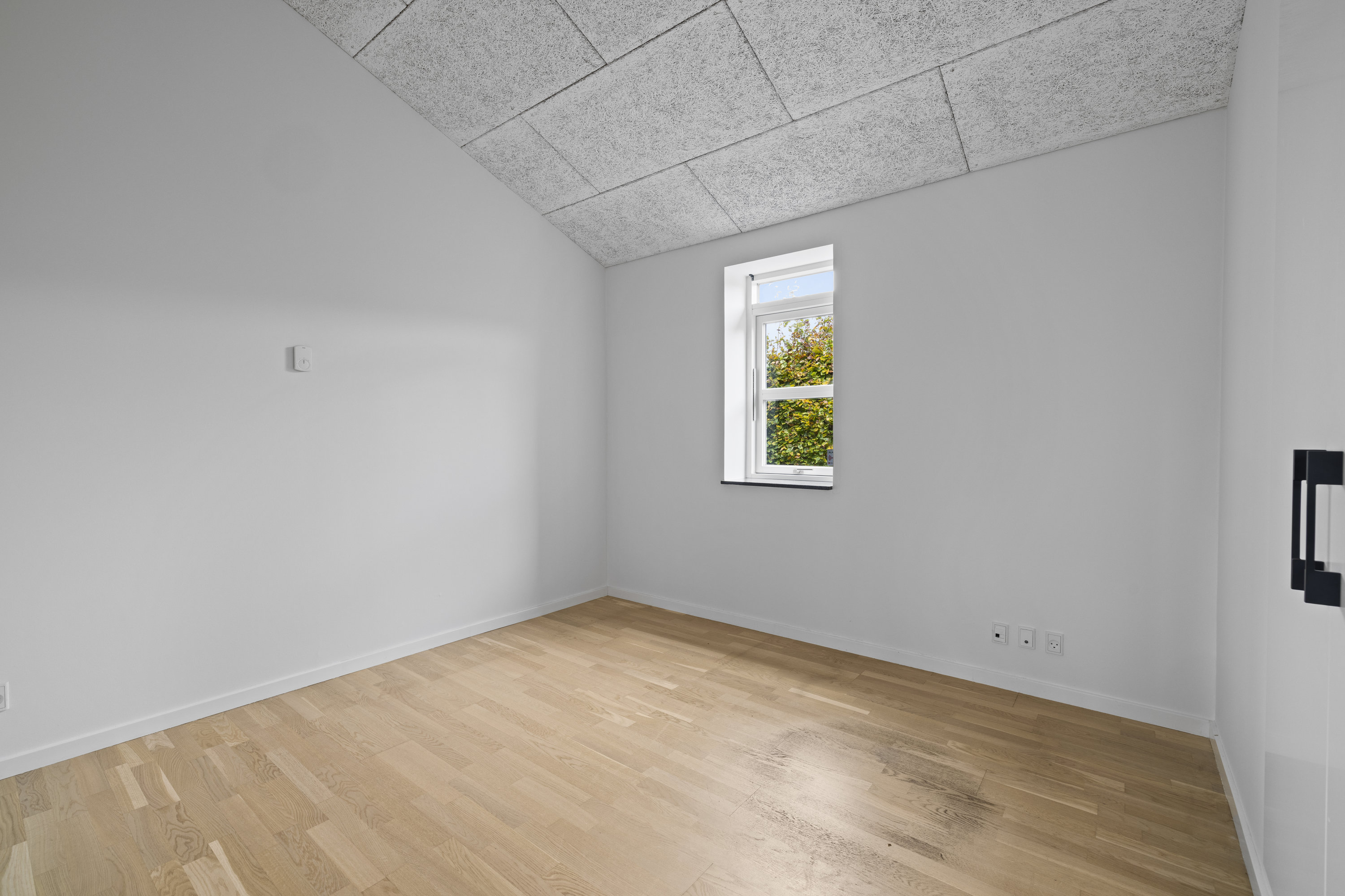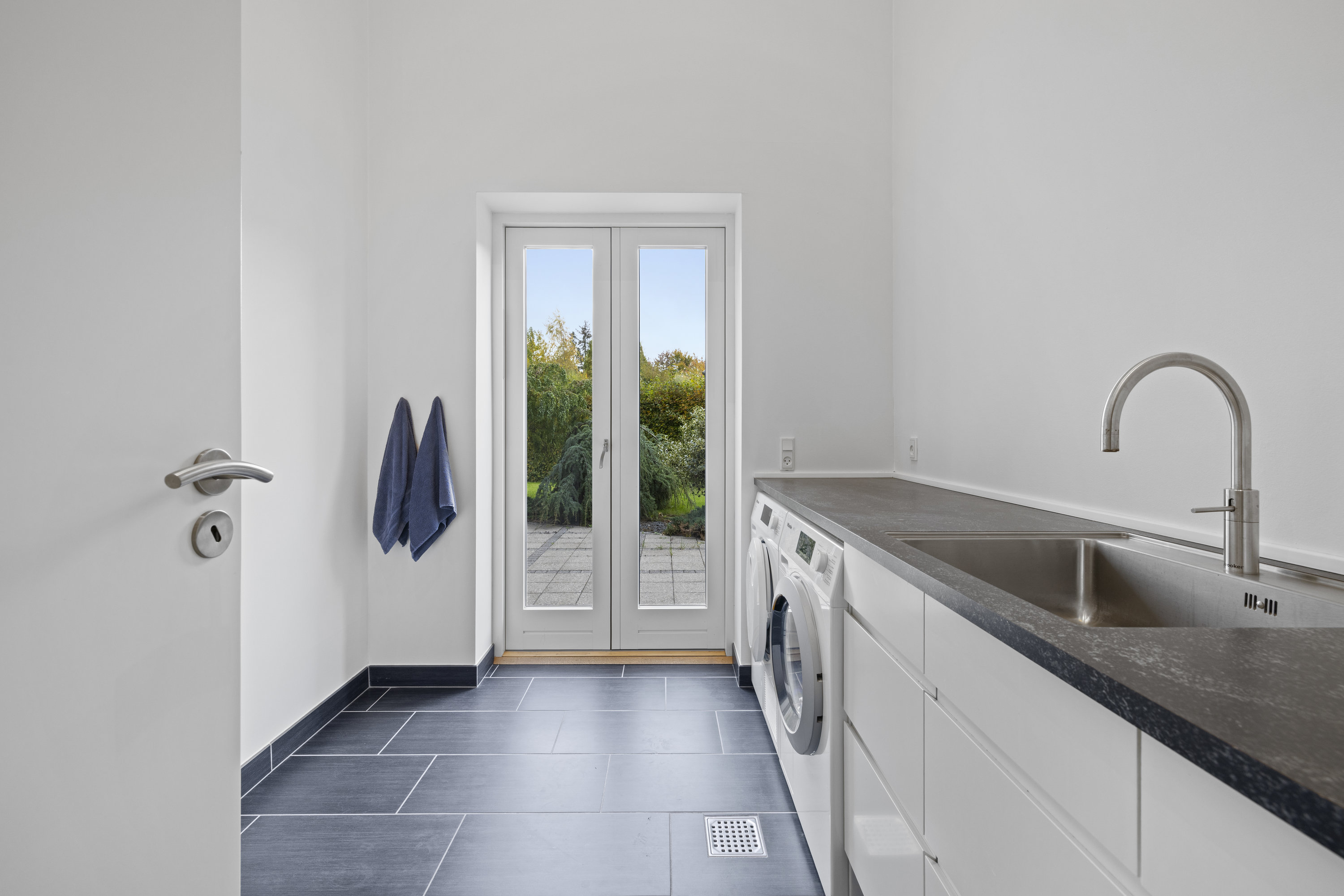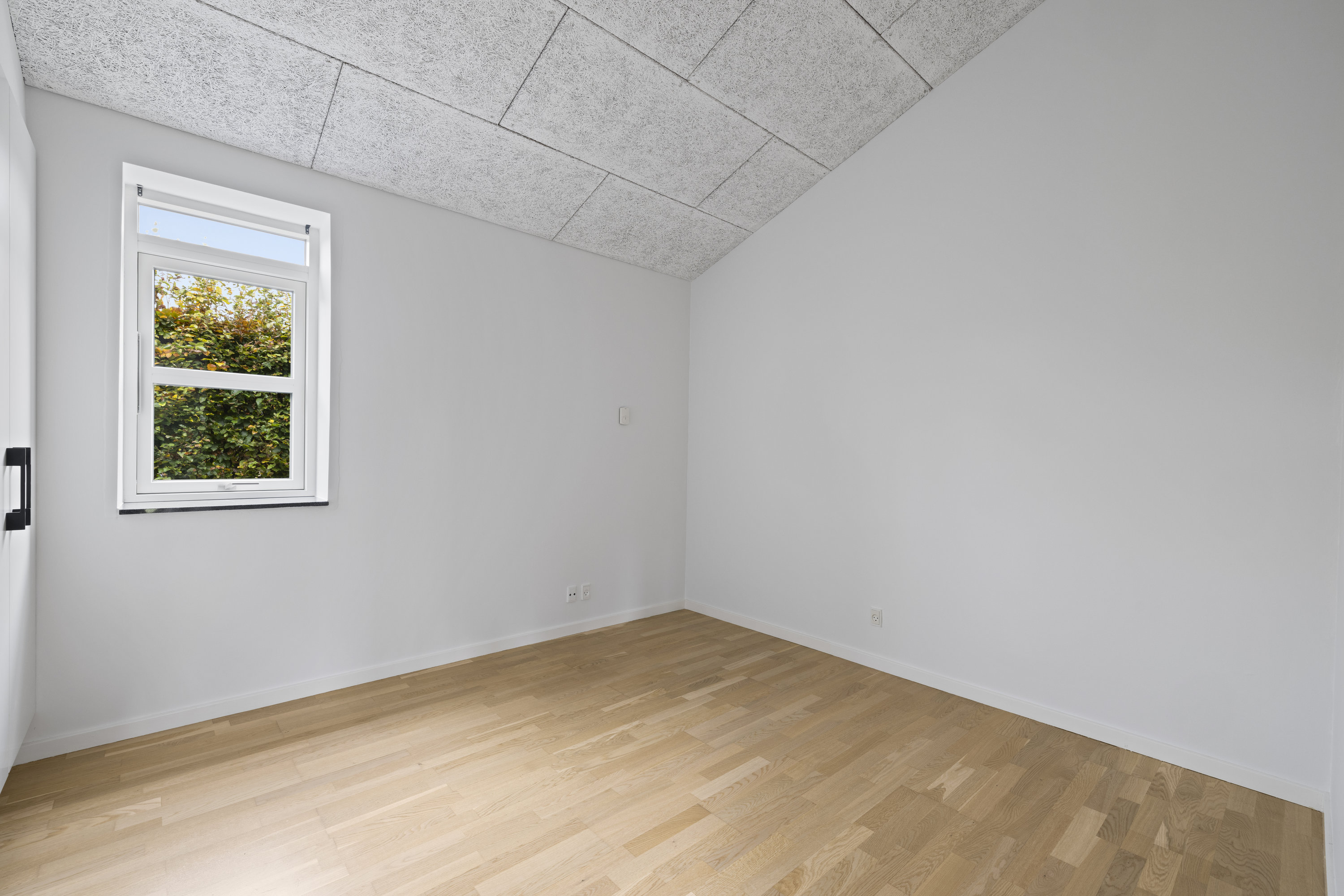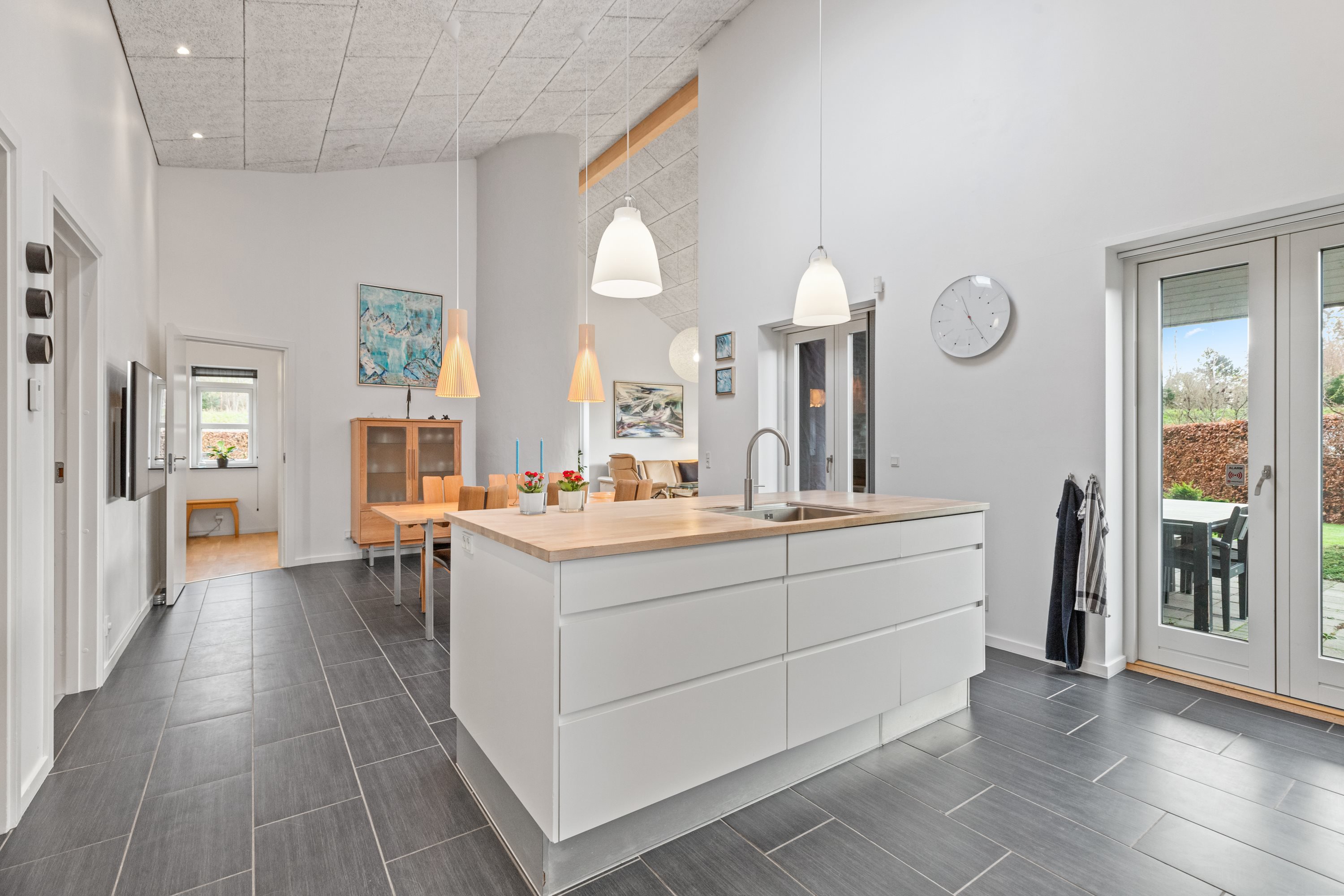 Fornemmelsen af plads og lys rammer dig, så snart du træder indenfor. Lofterne løfter sig til kip, og de store vinduespartier trækker lyset ind fra alle sider. Ovenlysvinduerne lader det glide ned i køkken/alrummet og giver den helt rigtige fornemmelse af luft og åbenhed. Det klassiske Tvis-samtalekøkken med fritstående ø og plads til højstole samler familien om mad, snak og nærvær. Opholdsstuen åbner sig mod haven med store vinduespartier og udgang til terrassen. Her opløses grænsen mellem inde og ude, og dagslyset bliver en del af indretningen. Tre soveværelser giver plads til ro og fordybelse, mens to flotte badeværelser – det ene med en imponerende bruseniche i rør til loft – fuldender helheden. Energirigtig fjernvarme sørger for, at varmen breder sig diskret i alle gulvene og skaber en behagelig atmosfære året rundt.