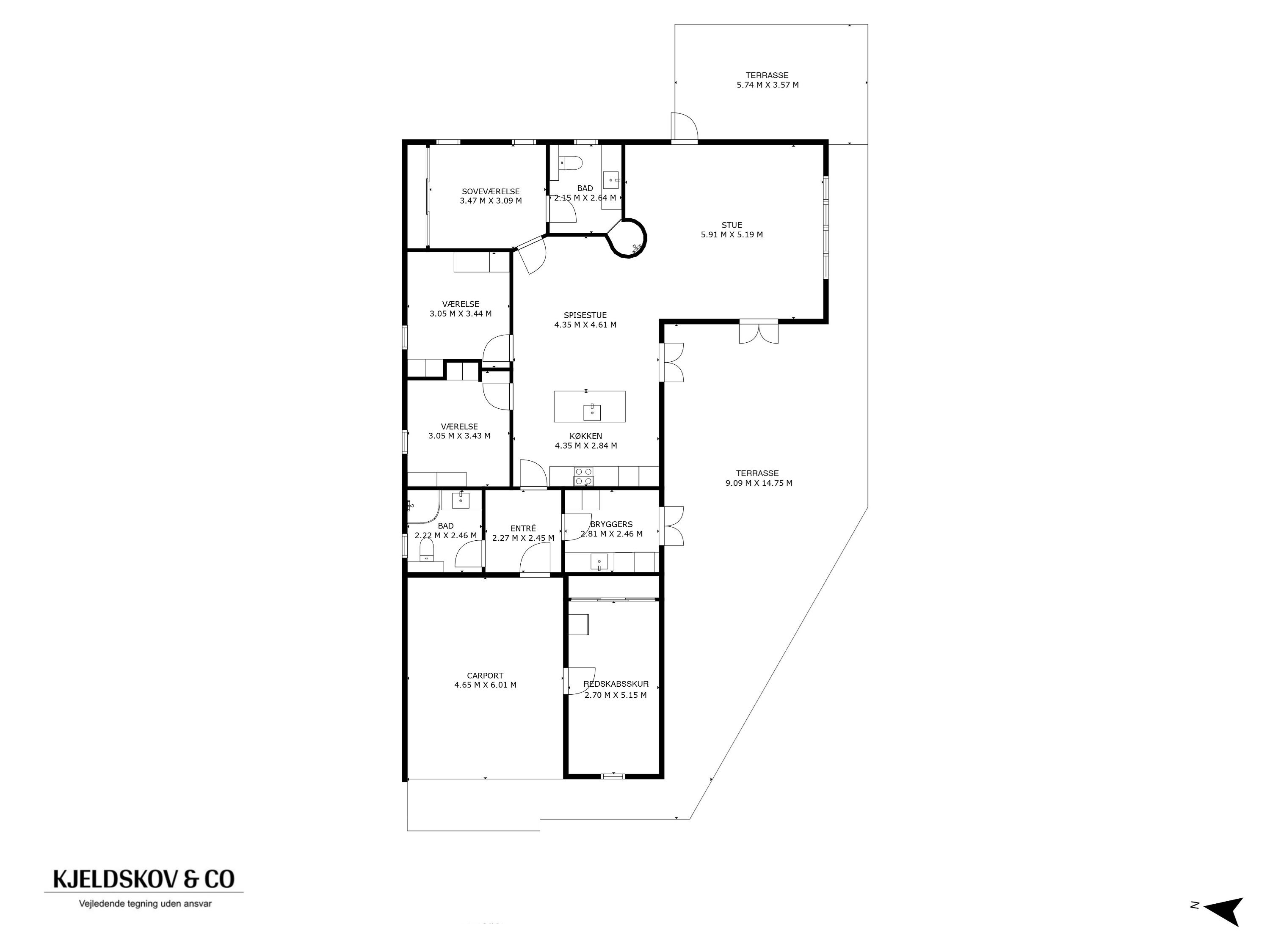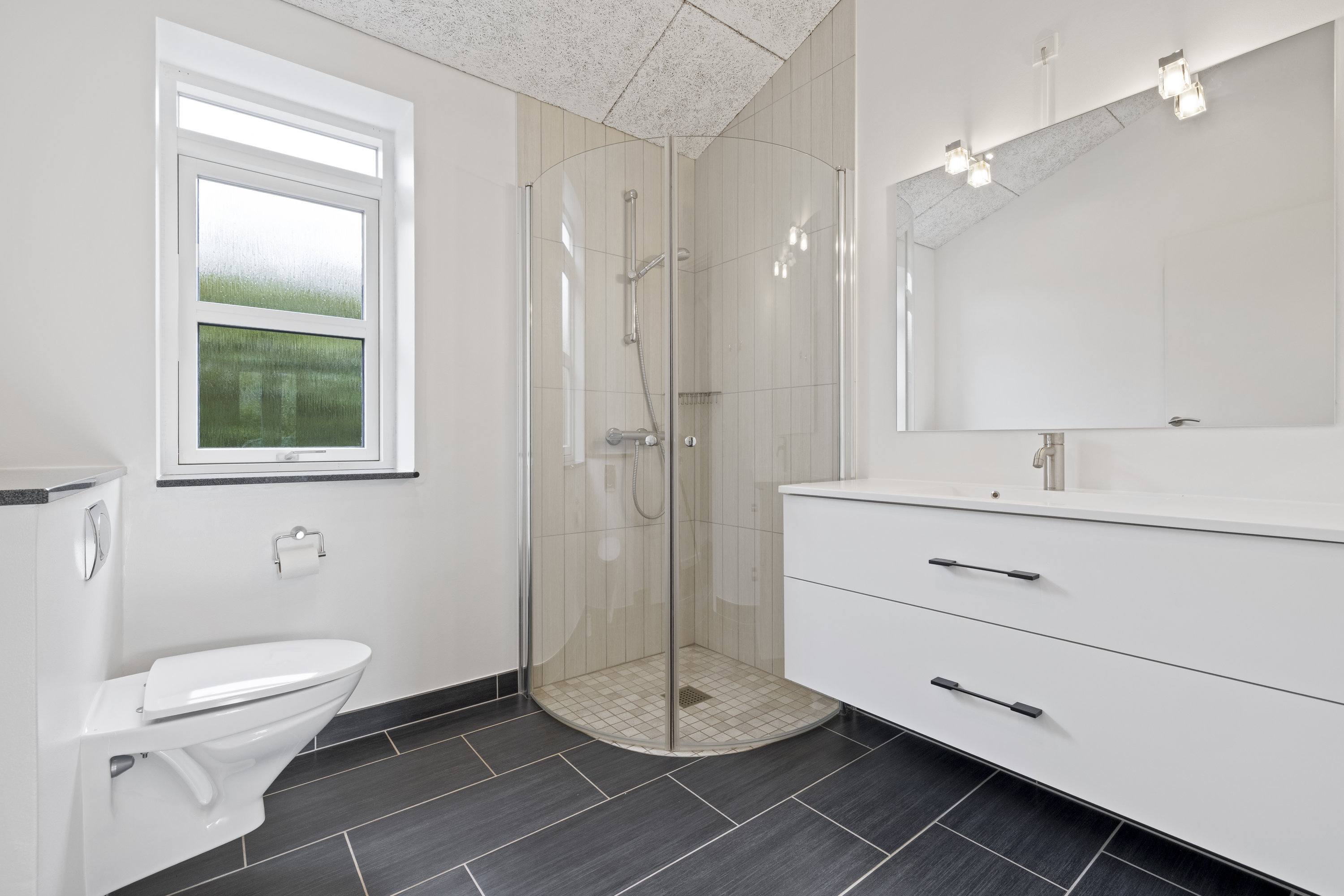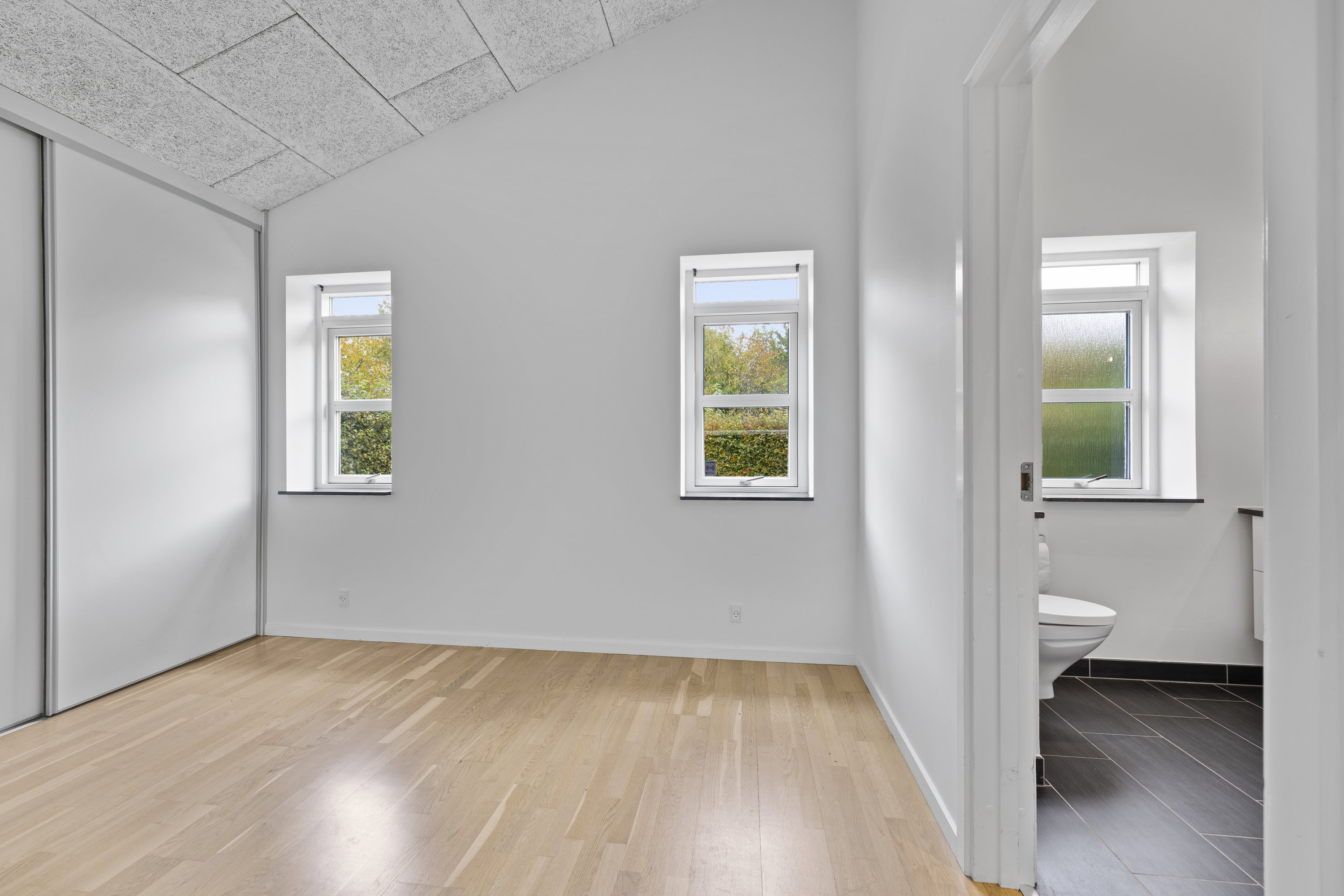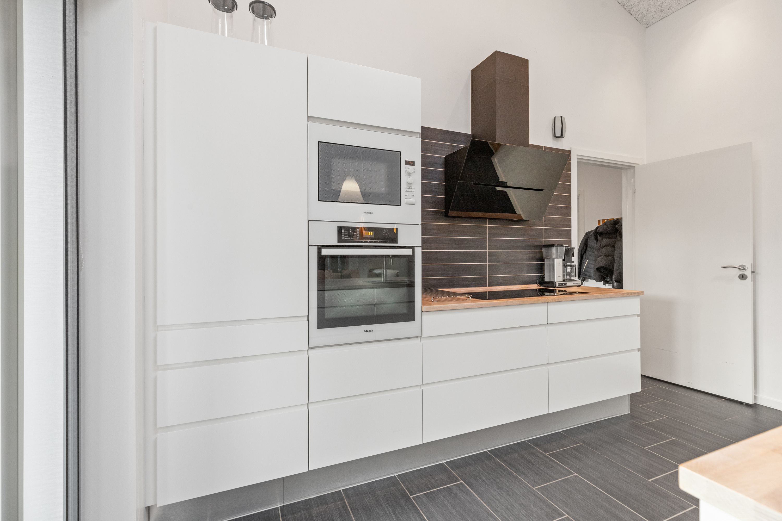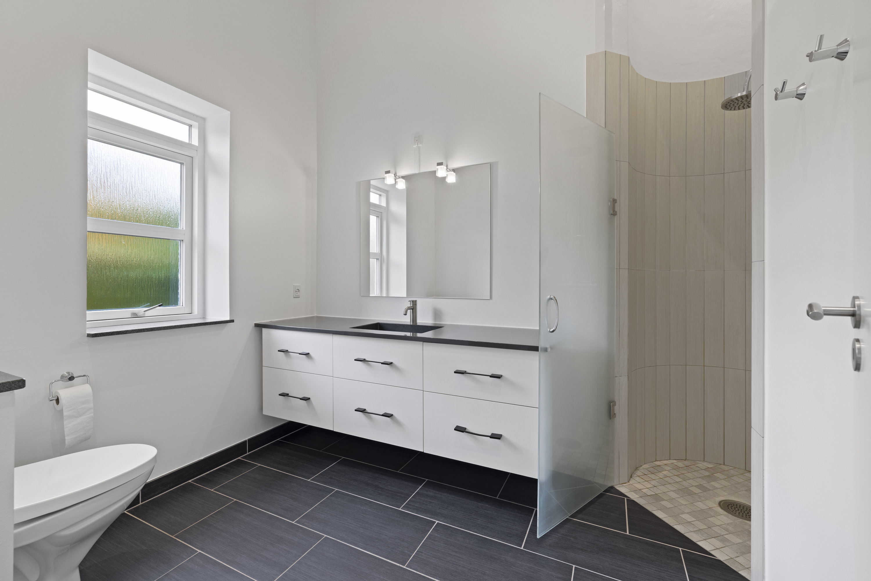 Fornemmelsen af plads og lys rammer dig, så snart du træder indenfor. Lofterne løfter sig til kip, og de store vinduespartier trækker lyset ind fra alle sider. Ovenlysvinduerne lader det glide ned i køkken/alrummet og giver den helt rigtige fornemmelse af luft og åbenhed. Det klassiske Tvis-samtalekøkken med fritstående ø og plads til højstole samler familien om mad, snak og nærvær. Opholdsstuen åbner sig mod haven med store vinduespartier og udgang til terrassen. Her opløses grænsen mellem inde og ude, og dagslyset bliver en del af indretningen. Tre soveværelser giver plads til ro og fordybelse, mens to flotte badeværelser – det ene med en imponerende bruseniche i rør til loft – fuldender helheden. Energirigtig fjernvarme sørger for, at varmen breder sig diskret i alle gulvene og skaber en behagelig atmosfære året rundt.