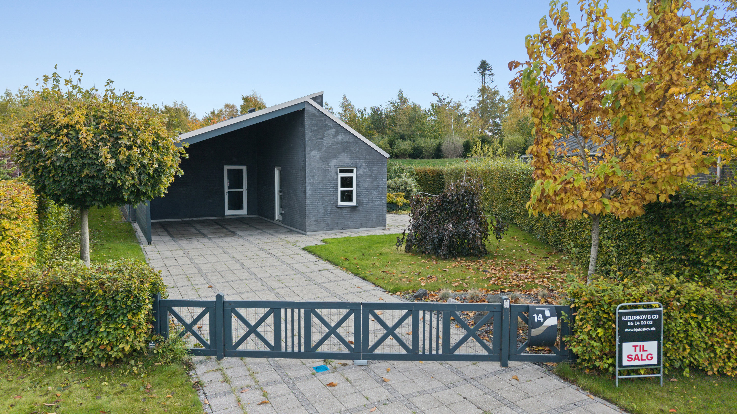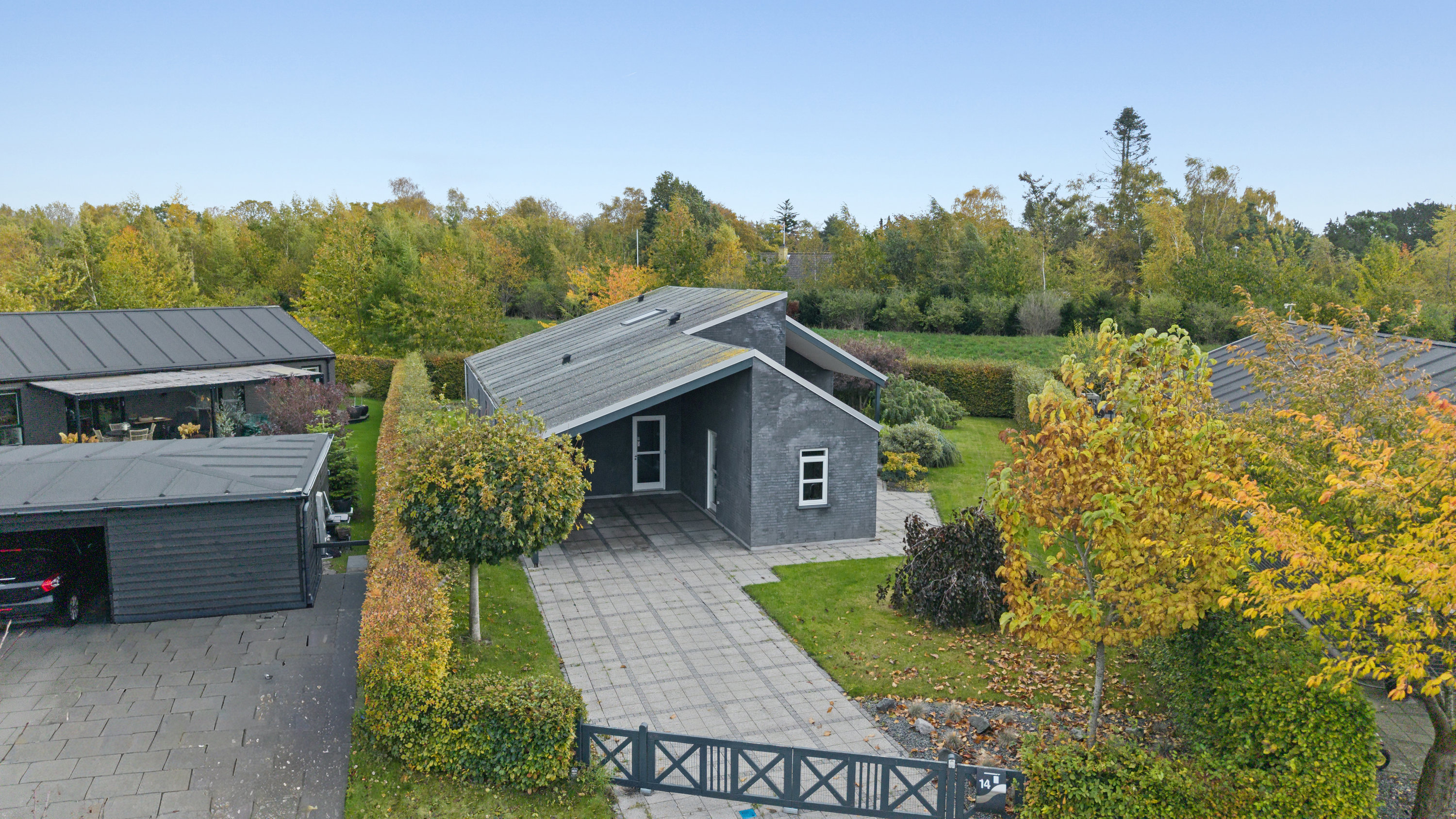 Bag den tætte bøgehæk folder haven sig ud som et roligt, næsten vedligeholdelsesfrit uderum. De store rhododendronbede springer ud i farver, mens vandstenen ved terrassen lader det rislende vand blande sig med fuglenes sang. De solrige terrasser danner rammen om udelivet – kaffen i morgenlyset, middagen i skumringen og de stille timer, når dagen falder til ro. Carporten med el-lader og det isolerede værksted gør hverdagen nem, mens vejen og naboerne giver følelsen af fællesskab og tryghed. Et par skridt herfra ligger Trylleskoven, hvor naturen lukker sig om én i grønne nuancer, og lidt længere nede møder du stranden – med det bløde sand, det klare vand og friheden helt ud til horisonten.