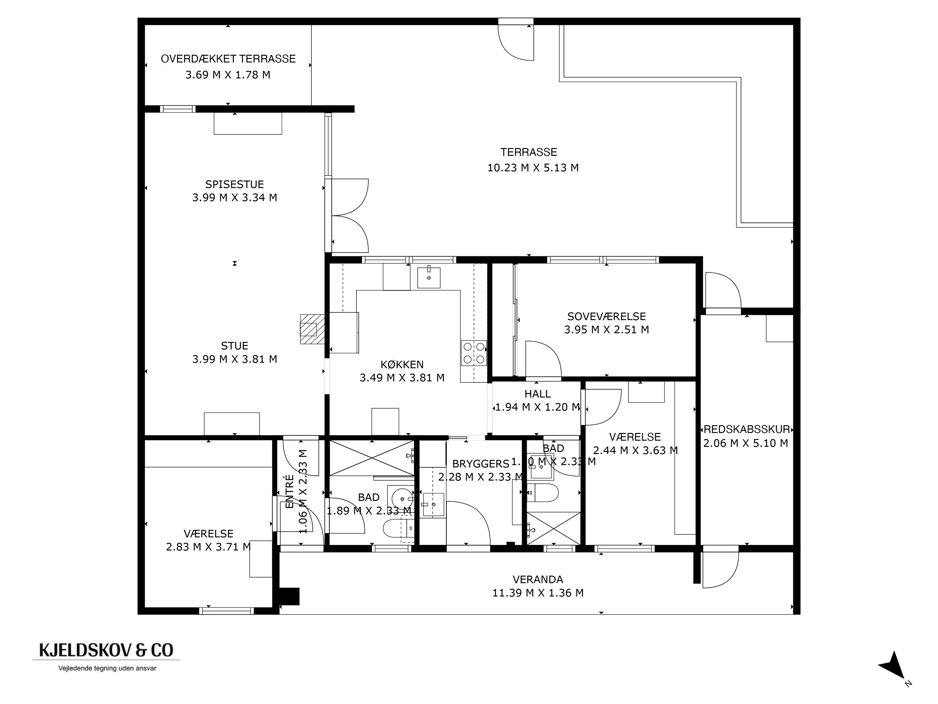 Et lyst og roligt hjem med hvide lofter og døre og store vinduer, der tilsammen skaber en harmonisk atmosfære. Det hvide HTH-køkken, med plads til et lille spisehjørne, åbner sig op mod stuen, hvor brændeovnen knitrer og skaber en varm stemning. Det store vinduesparti inviterer solen indenfor, og der er rig plads til både spisestue og sofahjørne. Forældresoveværelset har en fredelig atmosfære, mens to ekstra værelser er klar til at blive til børneværelser, hjemmekontor eller et kreativt fristed. De to badeværelser er holdt i grå nuancer med hvid sanitet og skabe - gulvvarmen giver en behagelig komfort på de kølige dage. En praktisk varmepumpe sørger for energieffektiv opvarmning, mens et blødgøringsanlæg sikrer blødere vand i hjemmet, og loftet giver plads til alt det, du ønsker at gemme væk, men stadig have lige ved hånden.