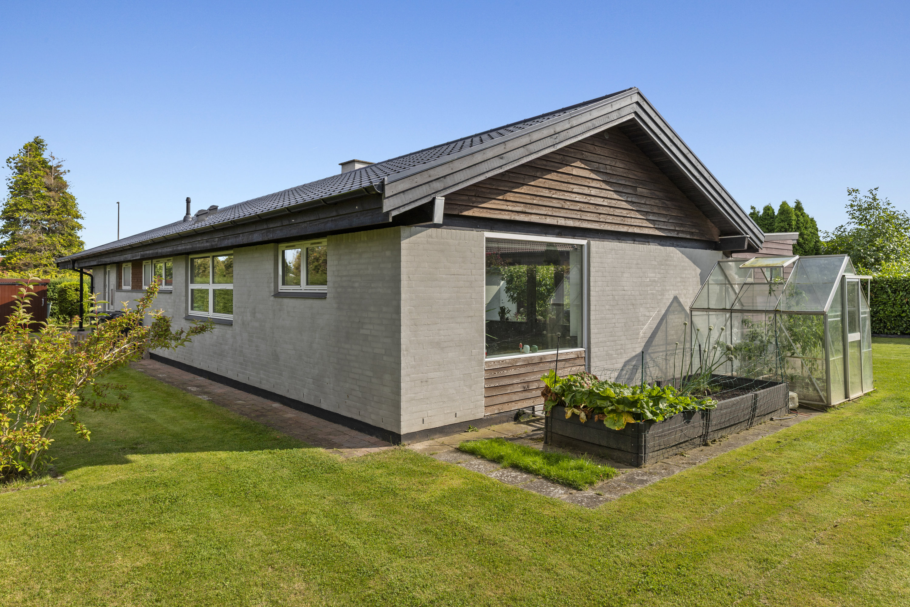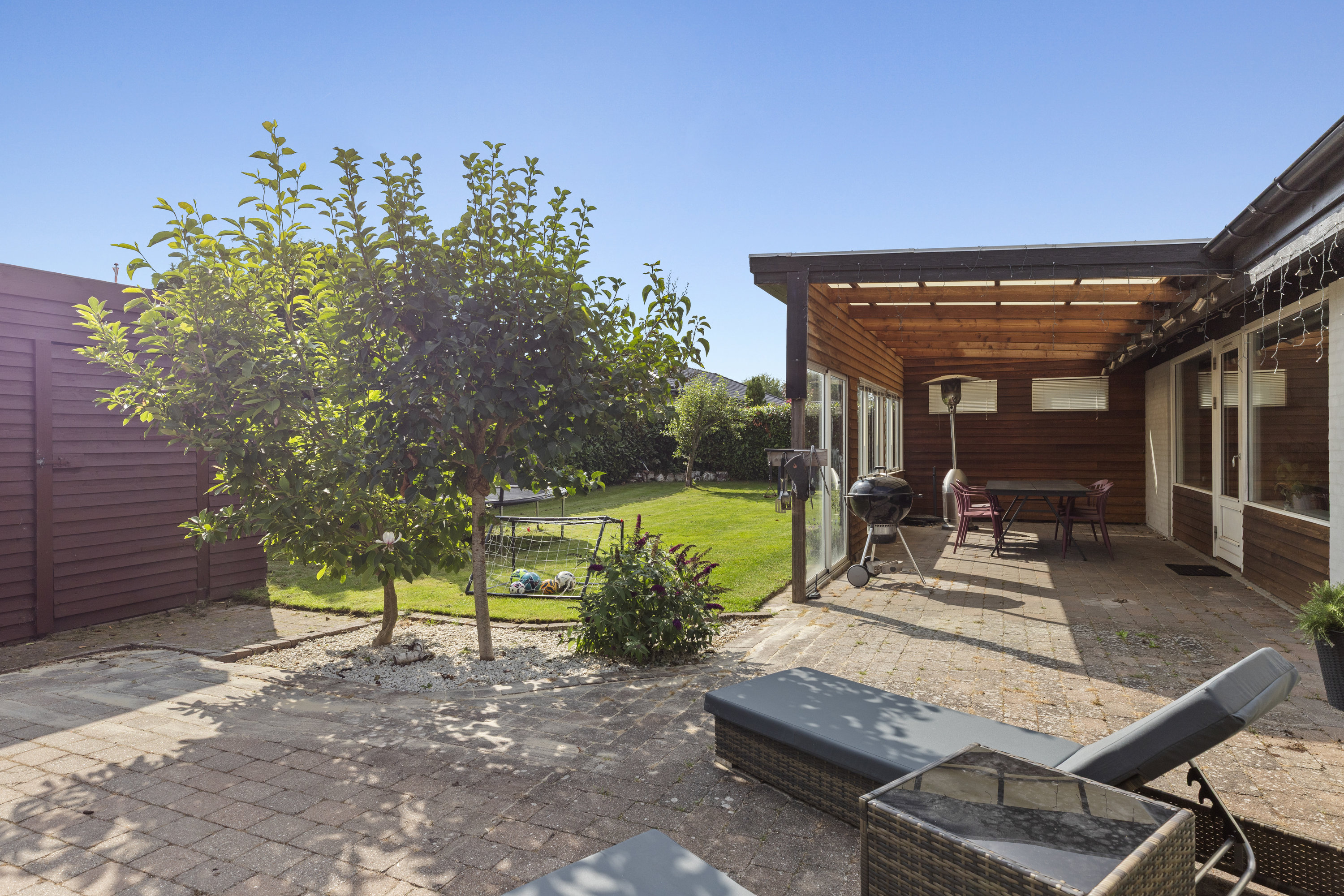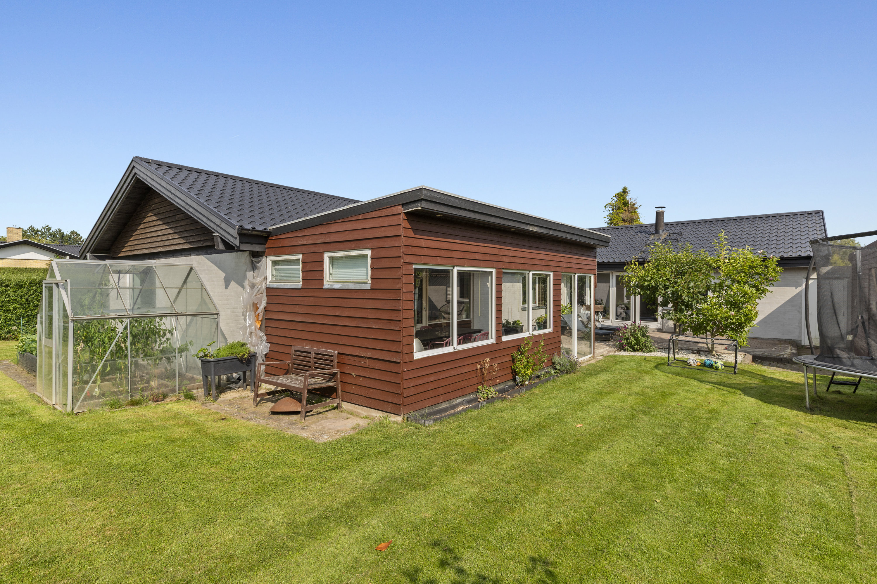 Haven er ugeneret og skabt til livet udenfor. Den sydvendte terrasse – delvist overdækket – indbyder til lange måltider i skyggen, stille stunder i liggestolen og varme sommeraftener med grill og latter. Et magnoliatræ blomstrer mod himlen, sommerfuglebusken lokker liv til, og i drivhuset modnes tomater og drømme side om side. Højbede bugner af grønt, og ved indgangspartiet skaber en overdækket krog læ for vind og hverdag – det perfekte sted til morgenkaffe med udsigt til dagen, der gryr. Her er plads til både leg og fordybelse, hverdag og fridage. Nabolaget er fredeligt og familievenligt – et sted hvor både små og store fødder trygt kan finde vej ad stierne til skole, institutioner og fritidsaktiviteter. Karlslunde Hallen ligger i nærheden, og når dagen kalder på havluft og sand mellem tæerne, er stranden aldrig langt væk.