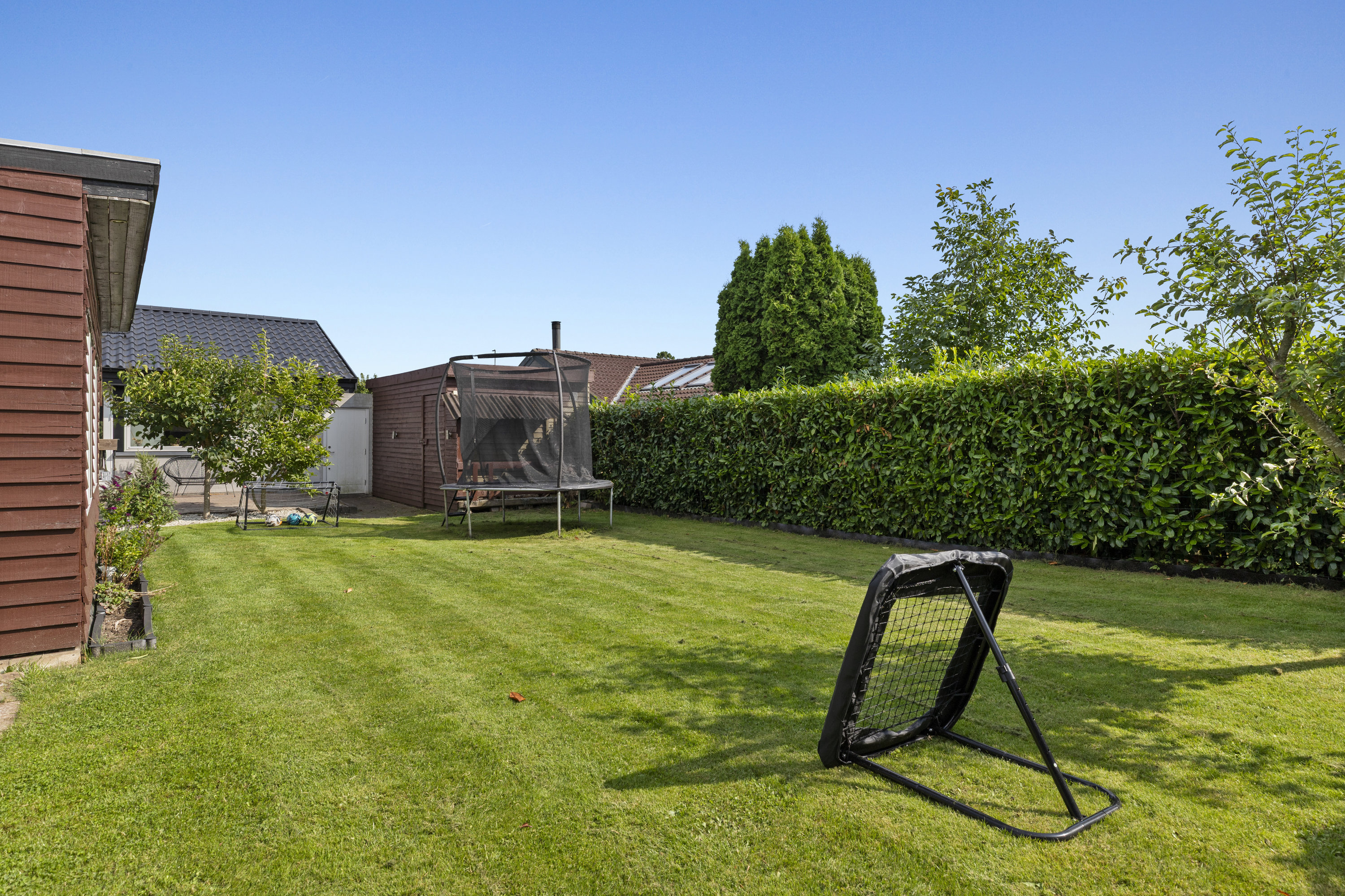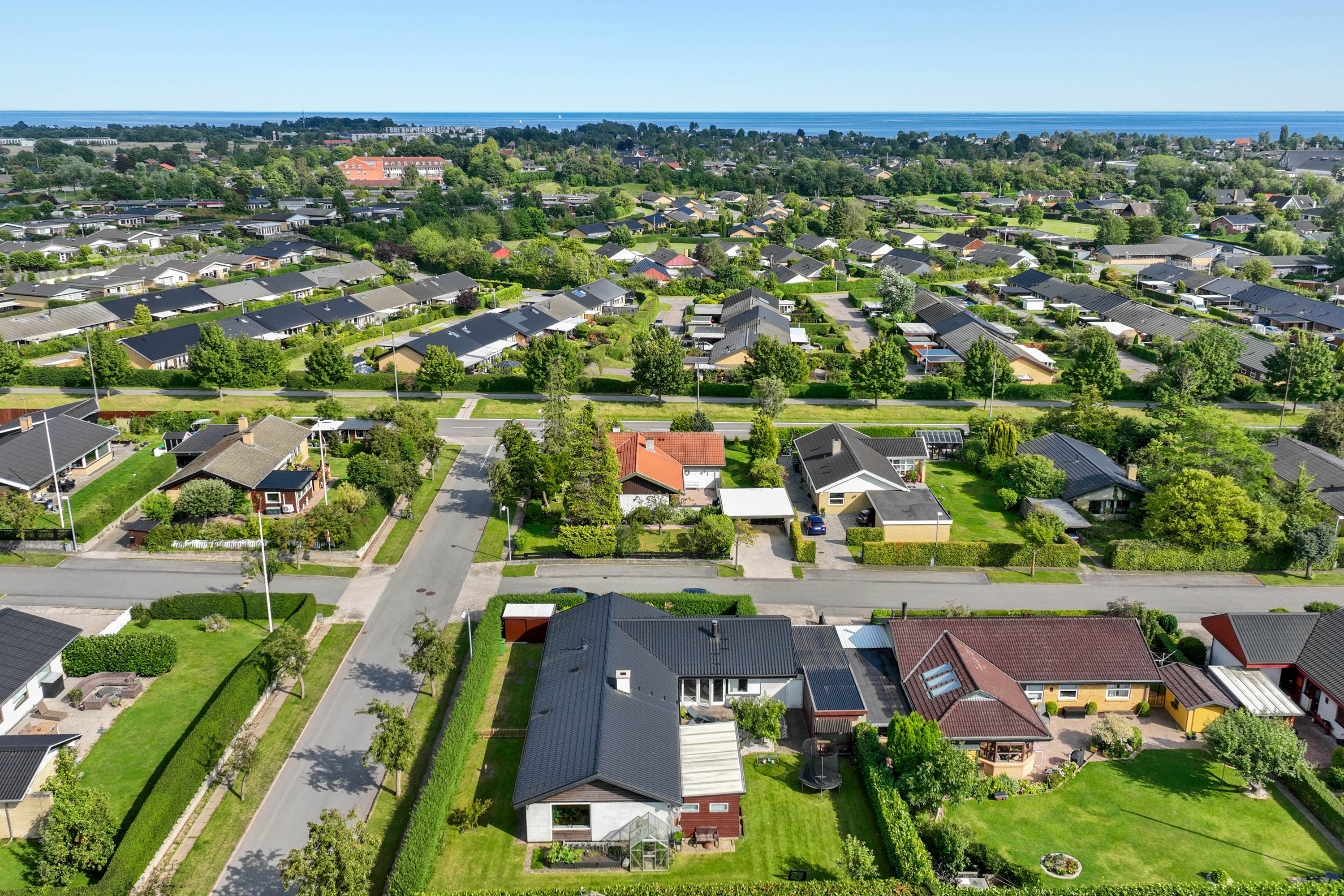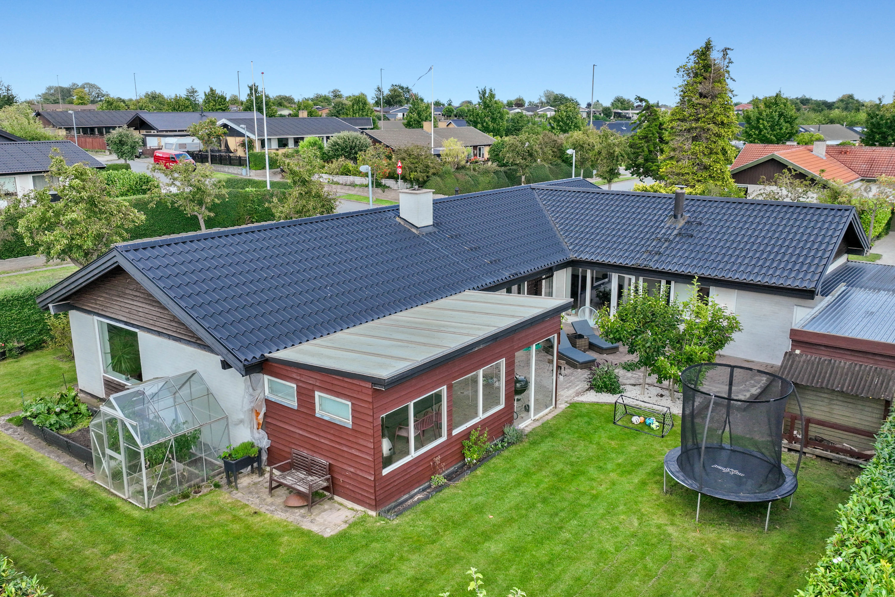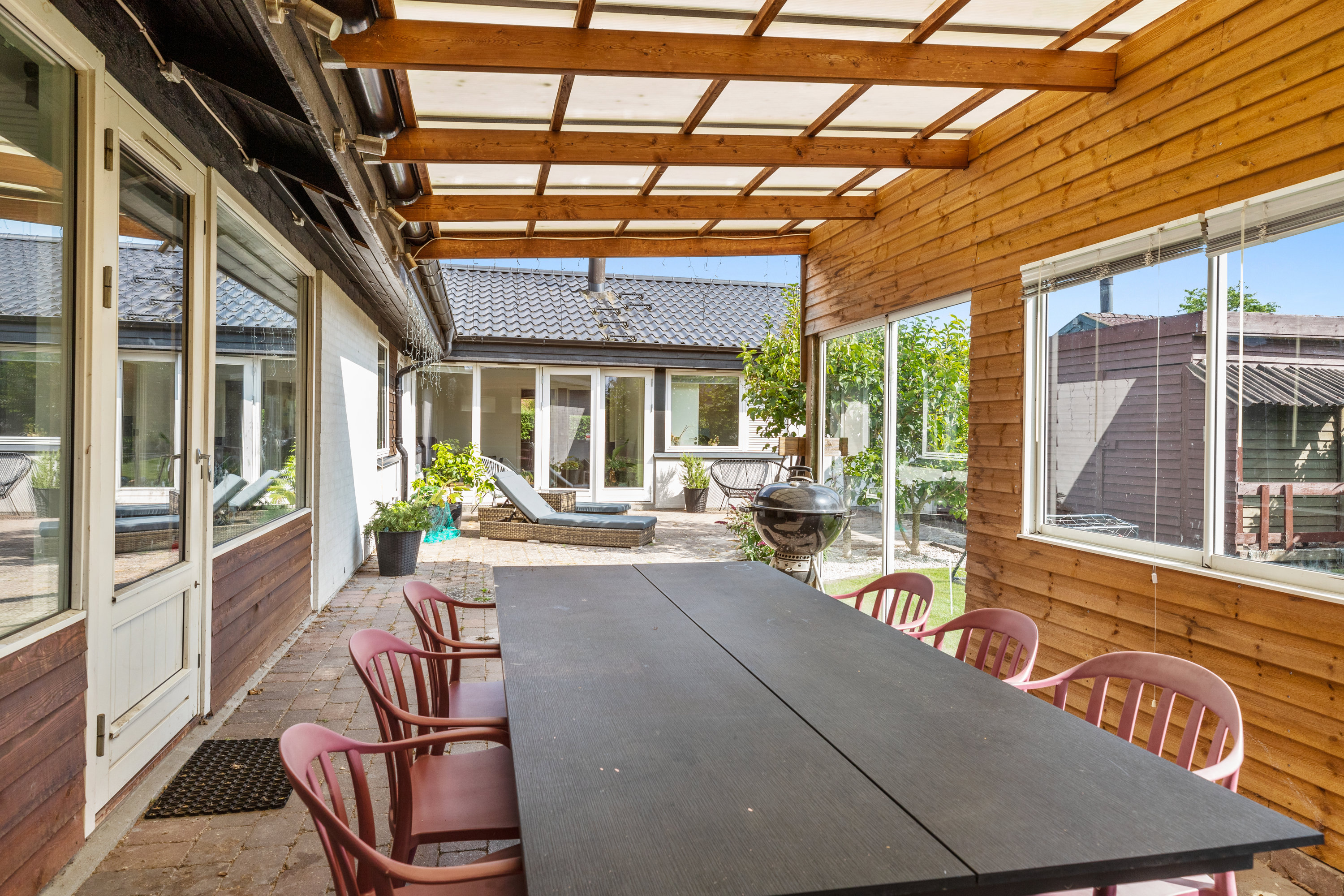 Haven er ugeneret og skabt til livet udenfor. Den sydvendte terrasse – delvist overdækket – indbyder til lange måltider i skyggen, stille stunder i liggestolen og varme sommeraftener med grill og latter. Et magnoliatræ blomstrer mod himlen, sommerfuglebusken lokker liv til, og i drivhuset modnes tomater og drømme side om side. Højbede bugner af grønt, og ved indgangspartiet skaber en overdækket krog læ for vind og hverdag – det perfekte sted til morgenkaffe med udsigt til dagen, der gryr. Her er plads til både leg og fordybelse, hverdag og fridage. Nabolaget er fredeligt og familievenligt – et sted hvor både små og store fødder trygt kan finde vej ad stierne til skole, institutioner og fritidsaktiviteter. Karlslunde Hallen ligger i nærheden, og når dagen kalder på havluft og sand mellem tæerne, er stranden aldrig langt væk.
