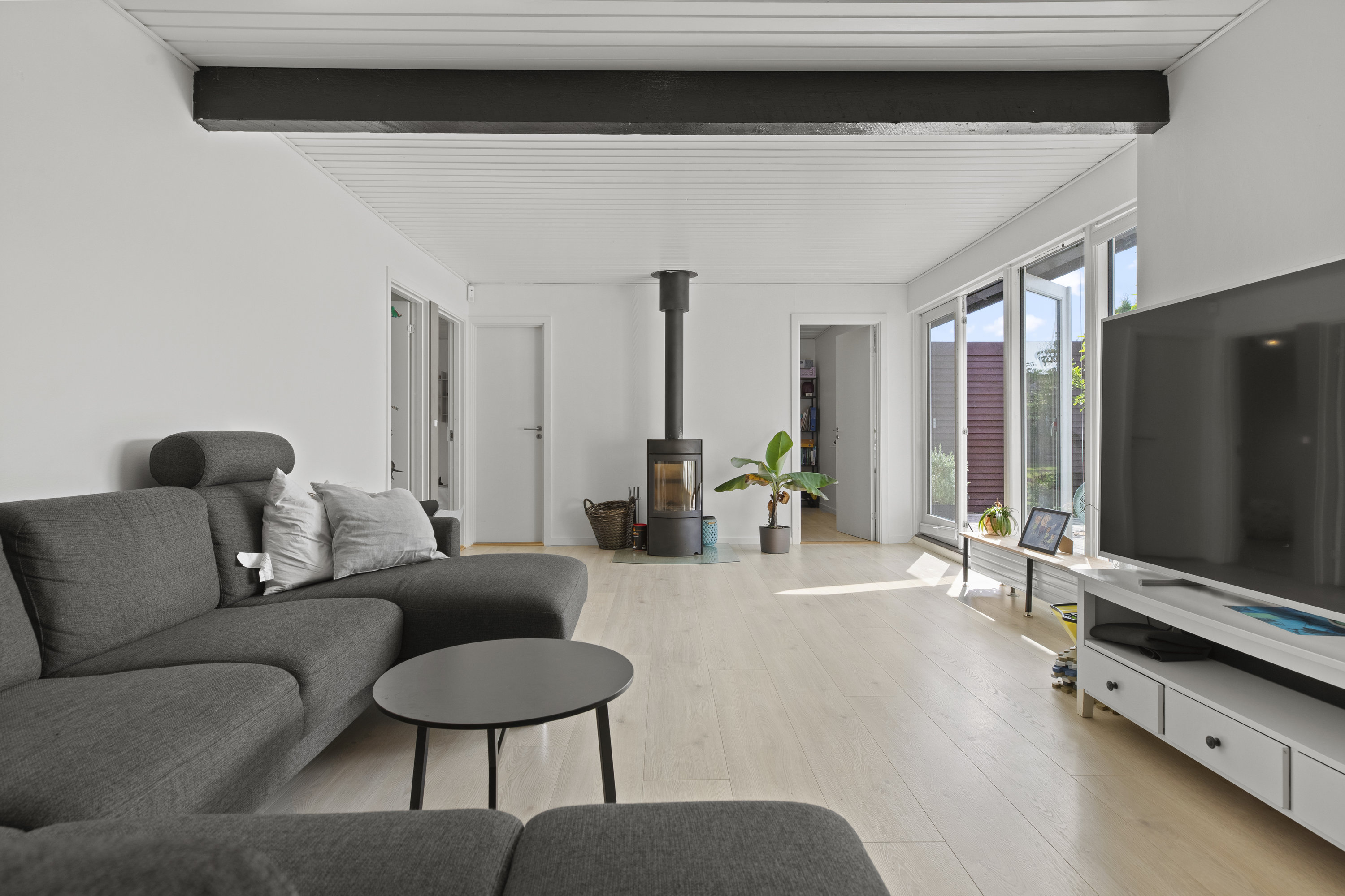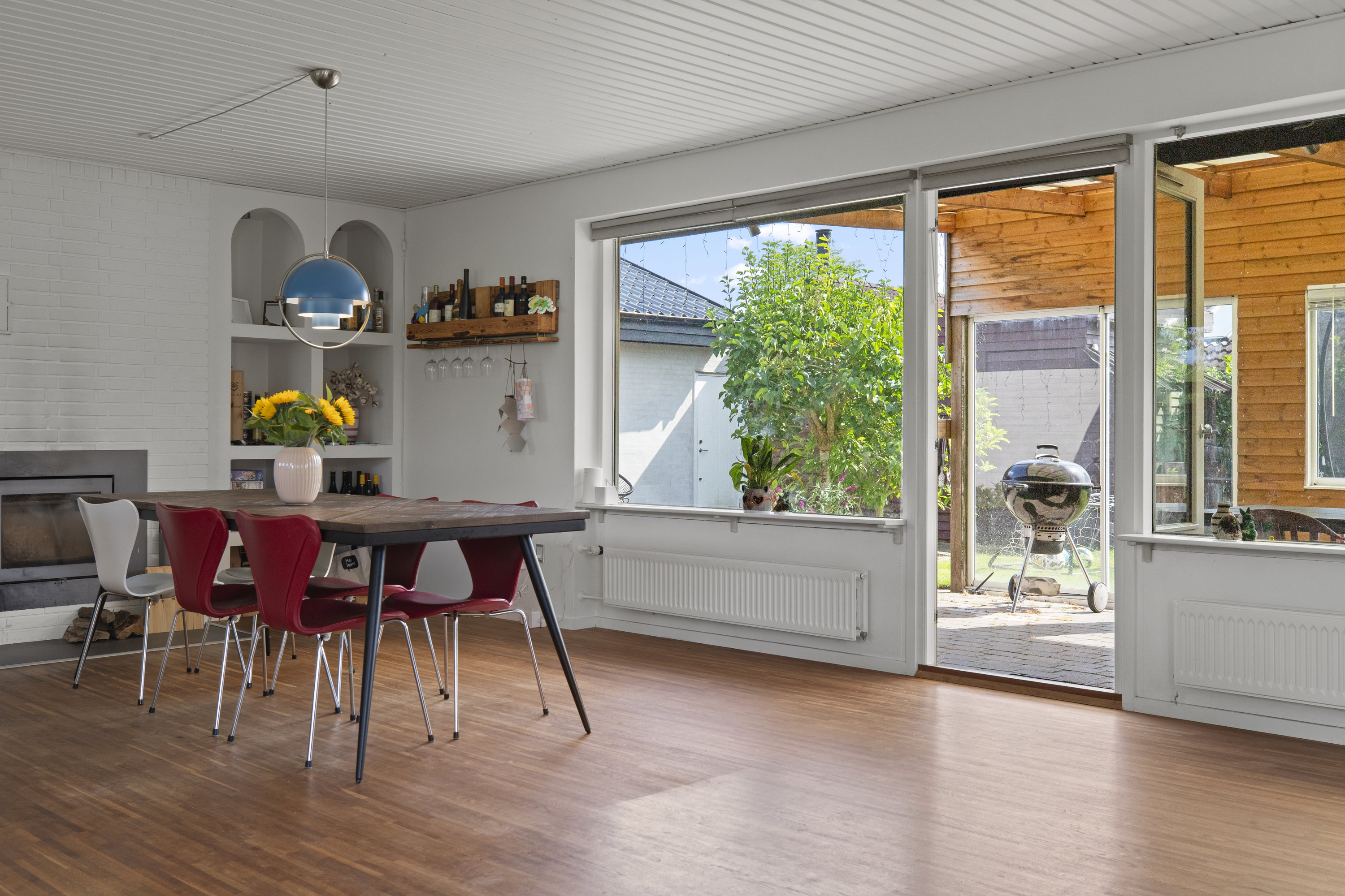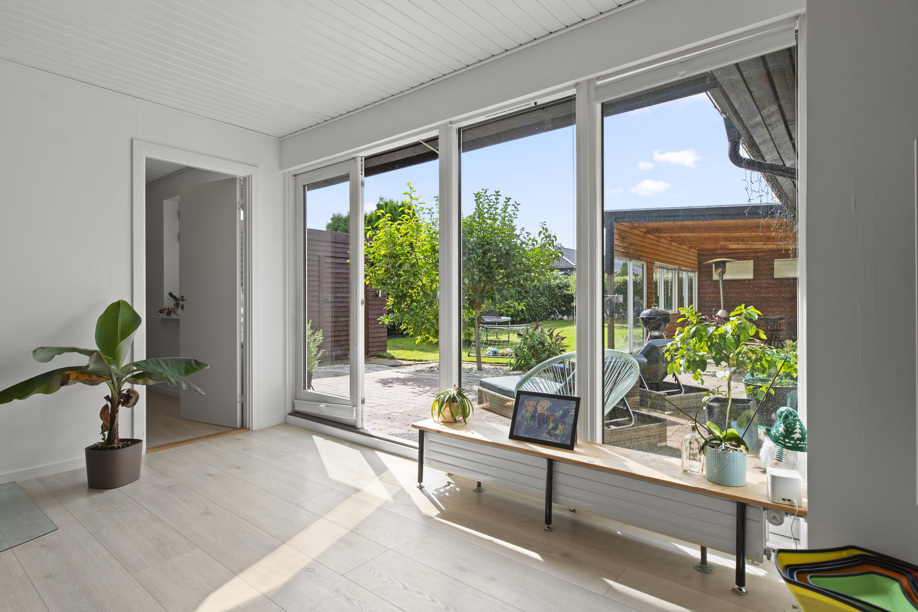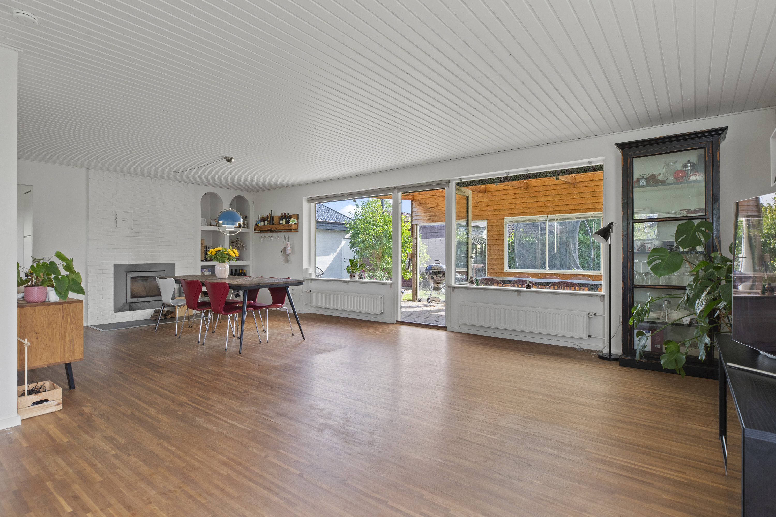 Lyset finder vej gennem de store vinduespartier og tegner skiftende mønstre hen over gulvene. Dejligt, hvidt køkken med grebsfrie elementer – stilrent og moderne med alt i integrerede hvidevarer – og med åbning til den store vinkelstue, hvor rummet indrettes naturligt i zoner: spisebordet her, sofa og bløde puder der. Den murede væg skaber karakter, og pejsen med brændeovnsindsats spreder varme og ro, mens nichen til brænde og nips sætter prikken over i’et. Der er fire værelser – tre samlet med et ekstra stueområde med brændeovn og udgang til haven. Et oplagt rum alrum, legerum, kreaplads eller hjemmekontor. Forældresoveværelset ligger mere uforstyrret med egen udgang til terrassen. Her kan døren stå på klem, mens fuglene hilser dagen velkommen og morgensolen falder ind. Gæstetoilet og to nyere badeværelser fuldender komforten – alle holdt i en lys og klassisk stil, der matcher husets gennemgående lethed.