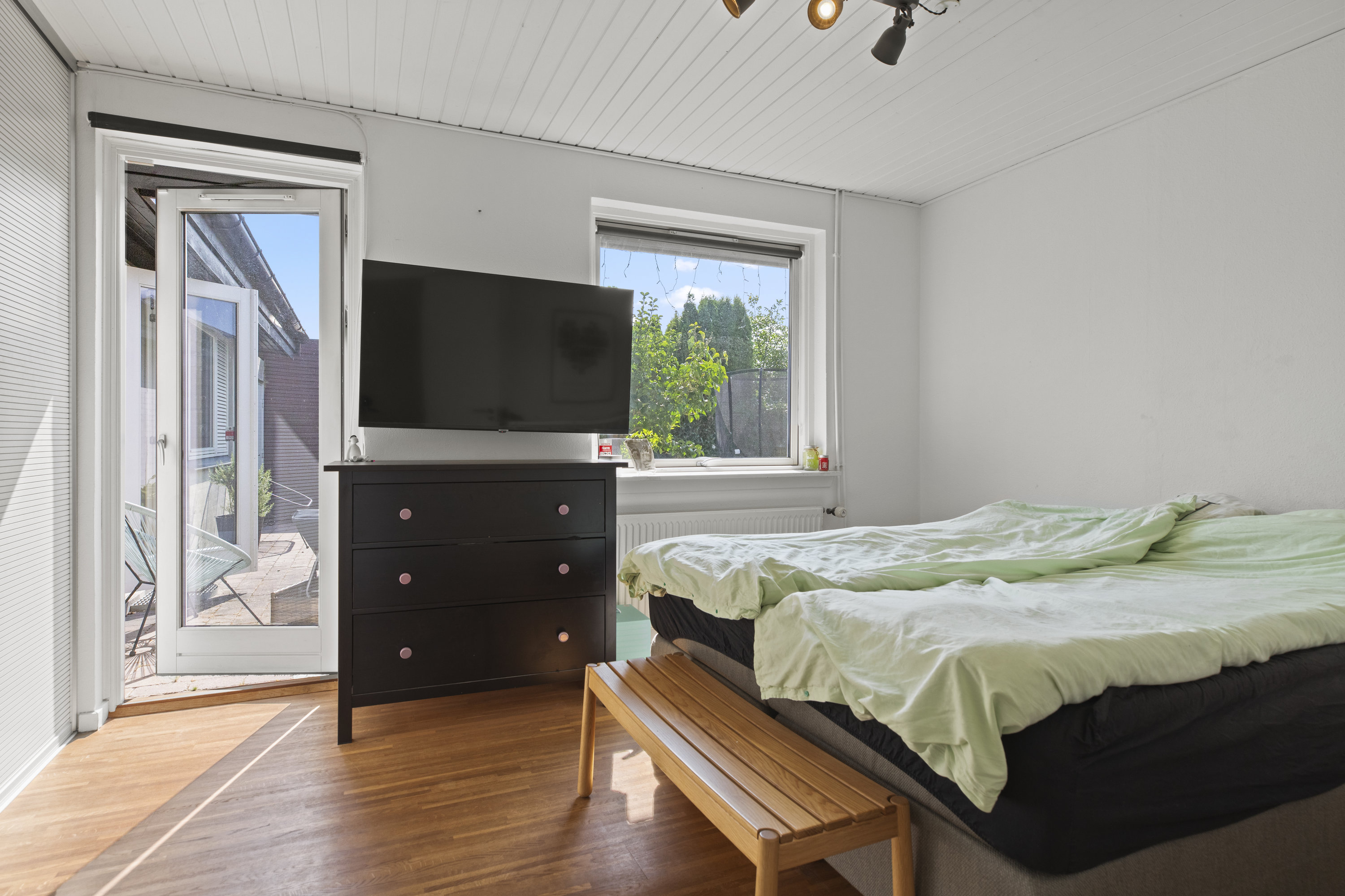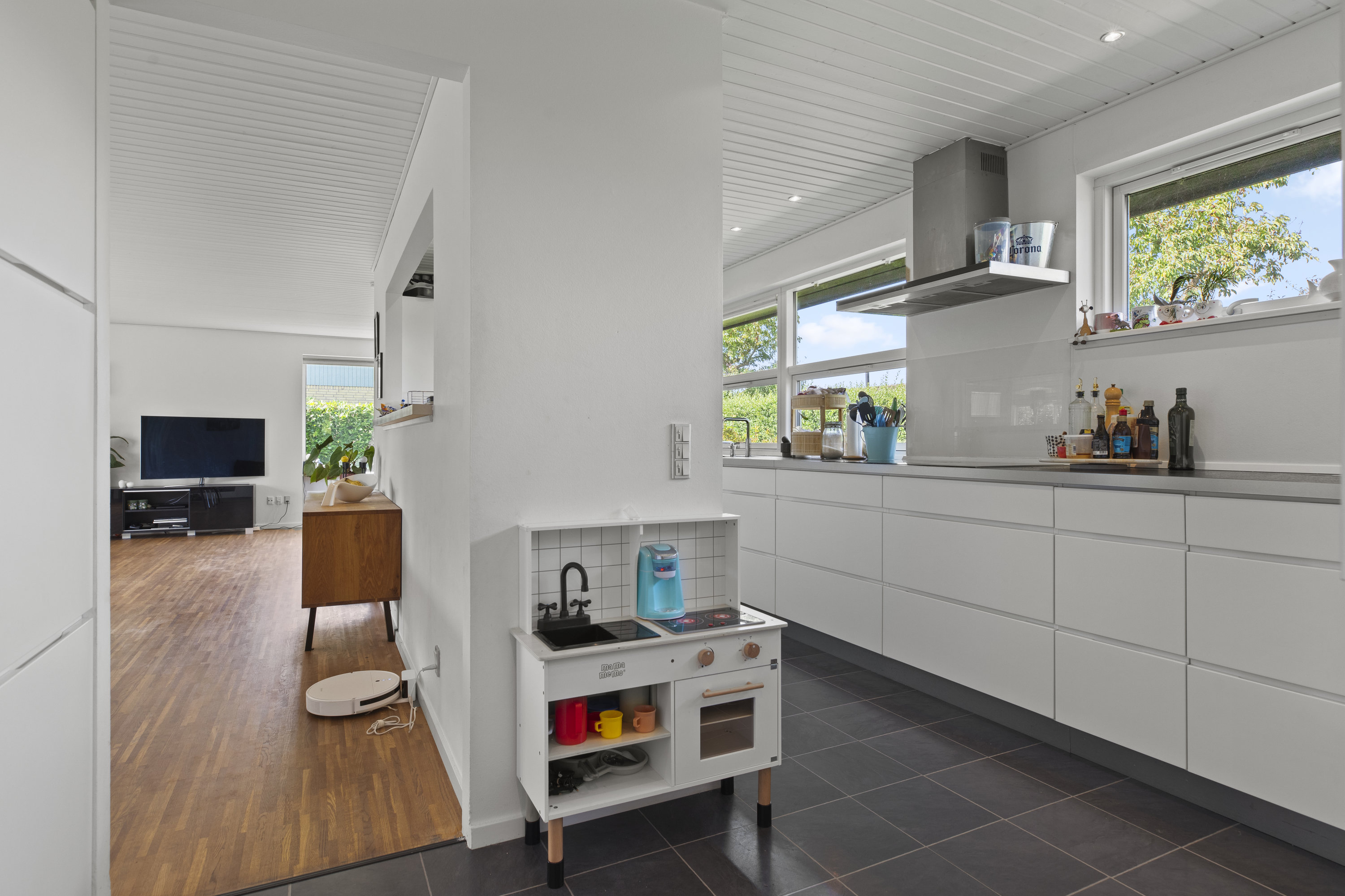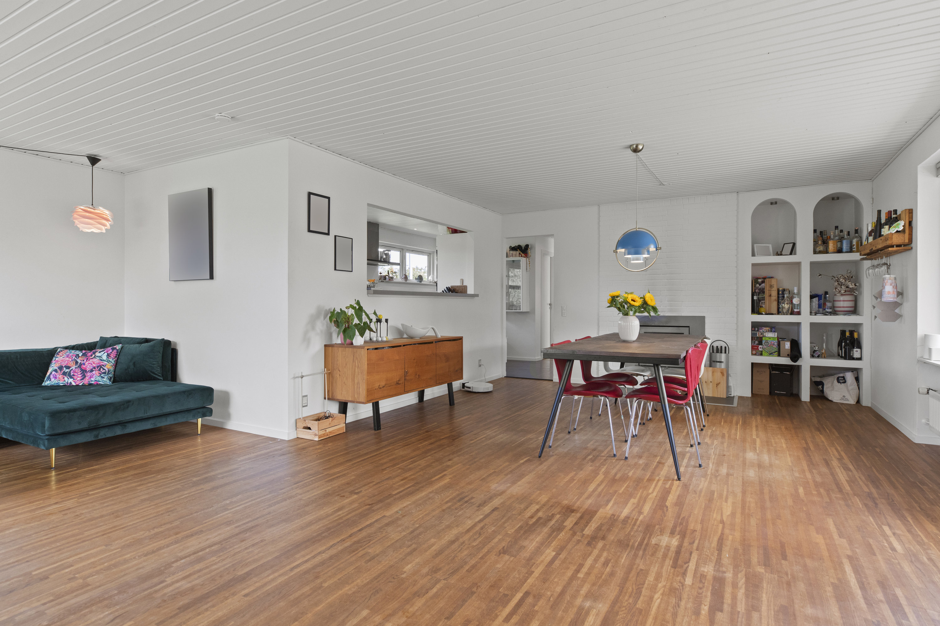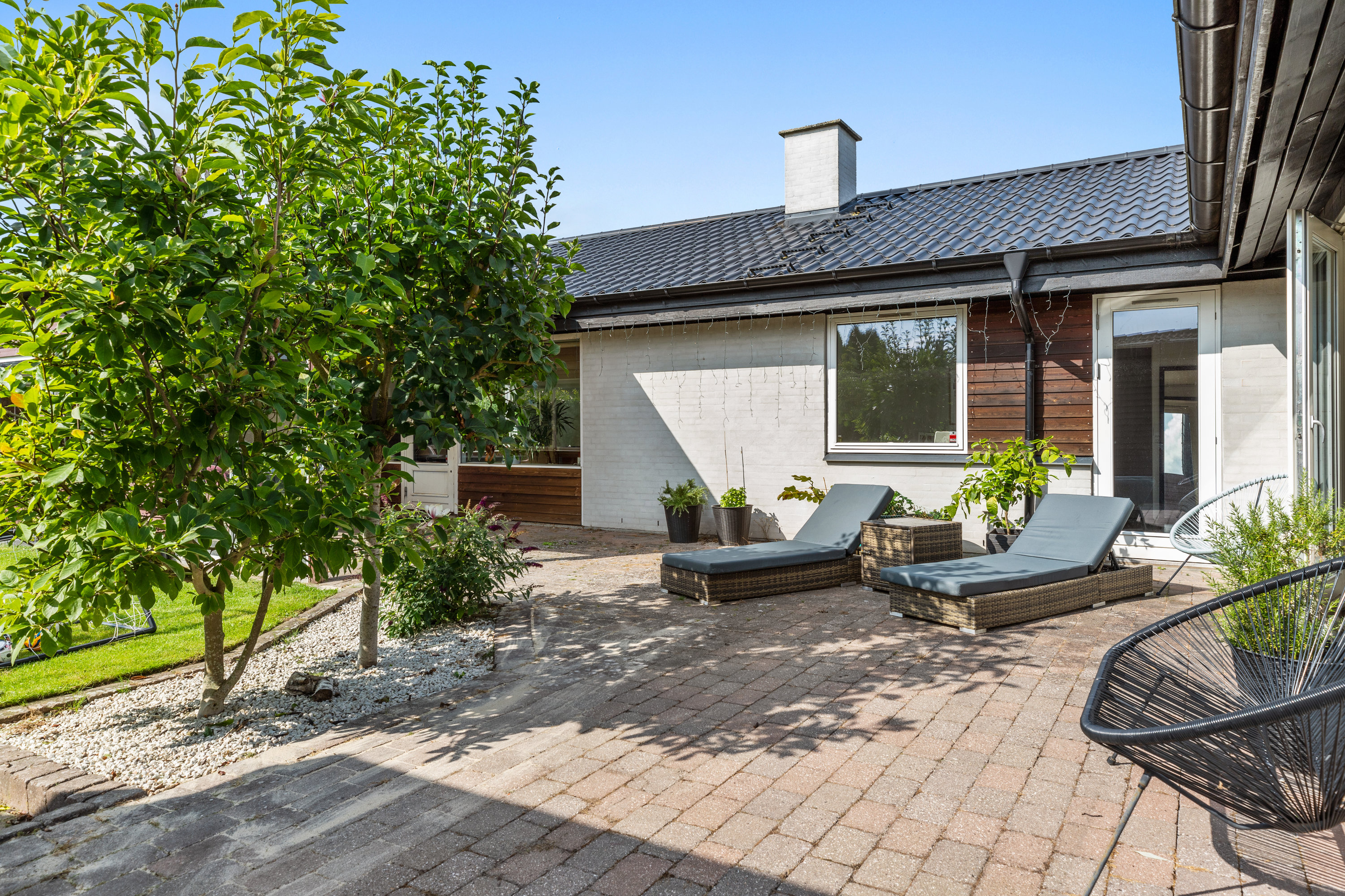 Lyset finder vej gennem de store vinduespartier og tegner skiftende mønstre hen over gulvene. Dejligt, hvidt køkken med grebsfrie elementer – stilrent og moderne med alt i integrerede hvidevarer – og med åbning til den store vinkelstue, hvor rummet indrettes naturligt i zoner: spisebordet her, sofa og bløde puder der. Den murede væg skaber karakter, og pejsen med brændeovnsindsats spreder varme og ro, mens nichen til brænde og nips sætter prikken over i’et. Der er fire værelser – tre samlet med et ekstra stueområde med brændeovn og udgang til haven. Et oplagt rum alrum, legerum, kreaplads eller hjemmekontor. Forældresoveværelset ligger mere uforstyrret med egen udgang til terrassen. Her kan døren stå på klem, mens fuglene hilser dagen velkommen og morgensolen falder ind. Gæstetoilet og to nyere badeværelser fuldender komforten – alle holdt i en lys og klassisk stil, der matcher husets gennemgående lethed.