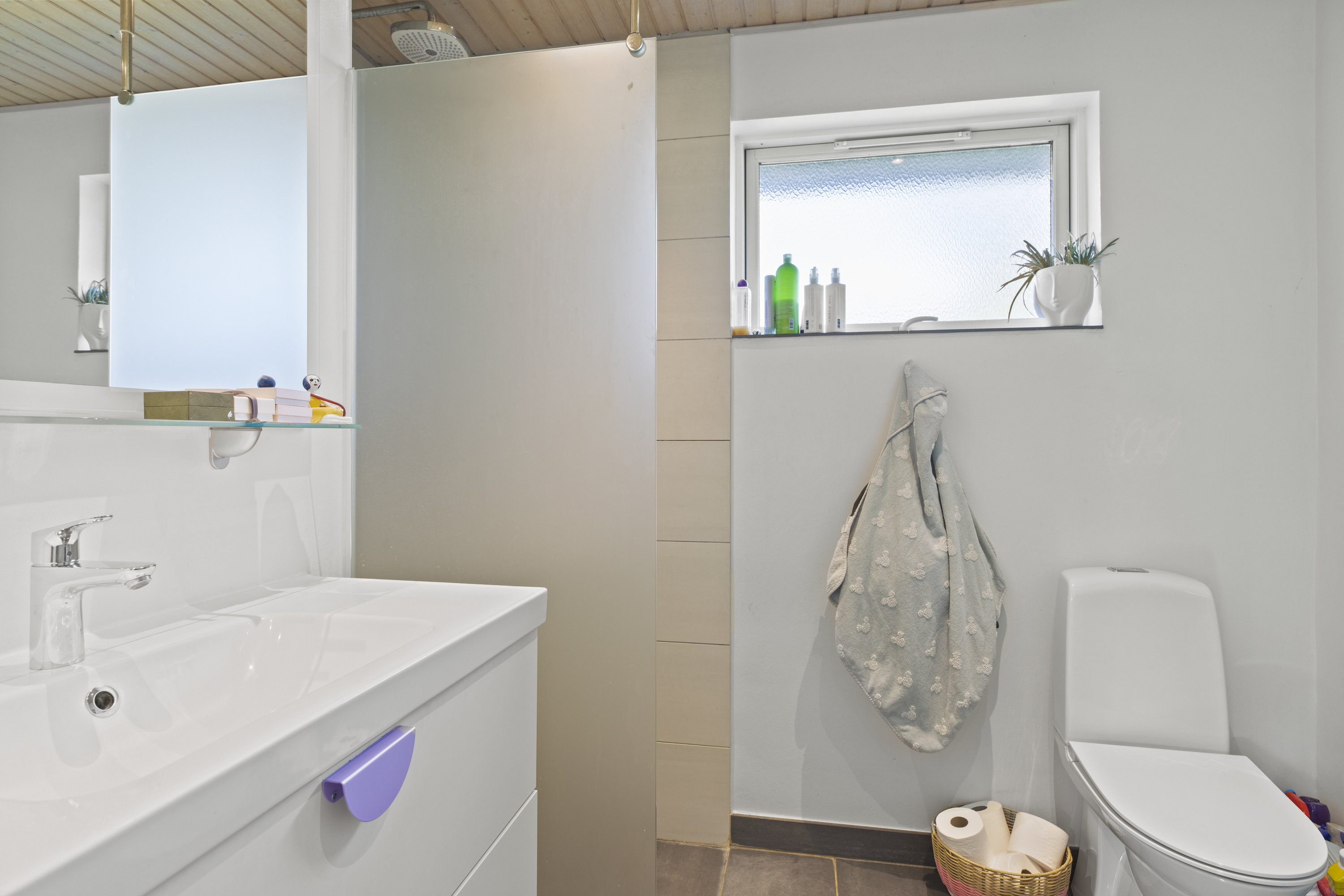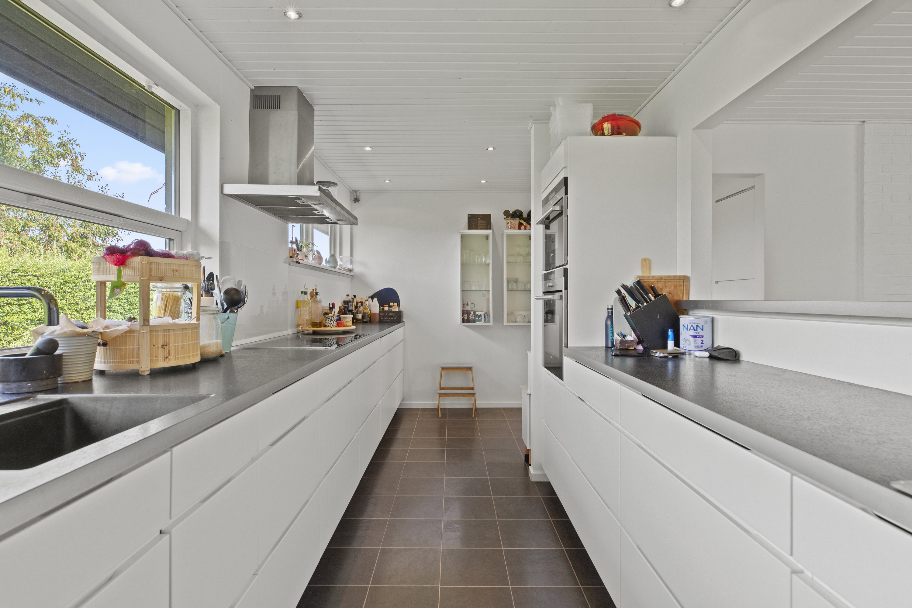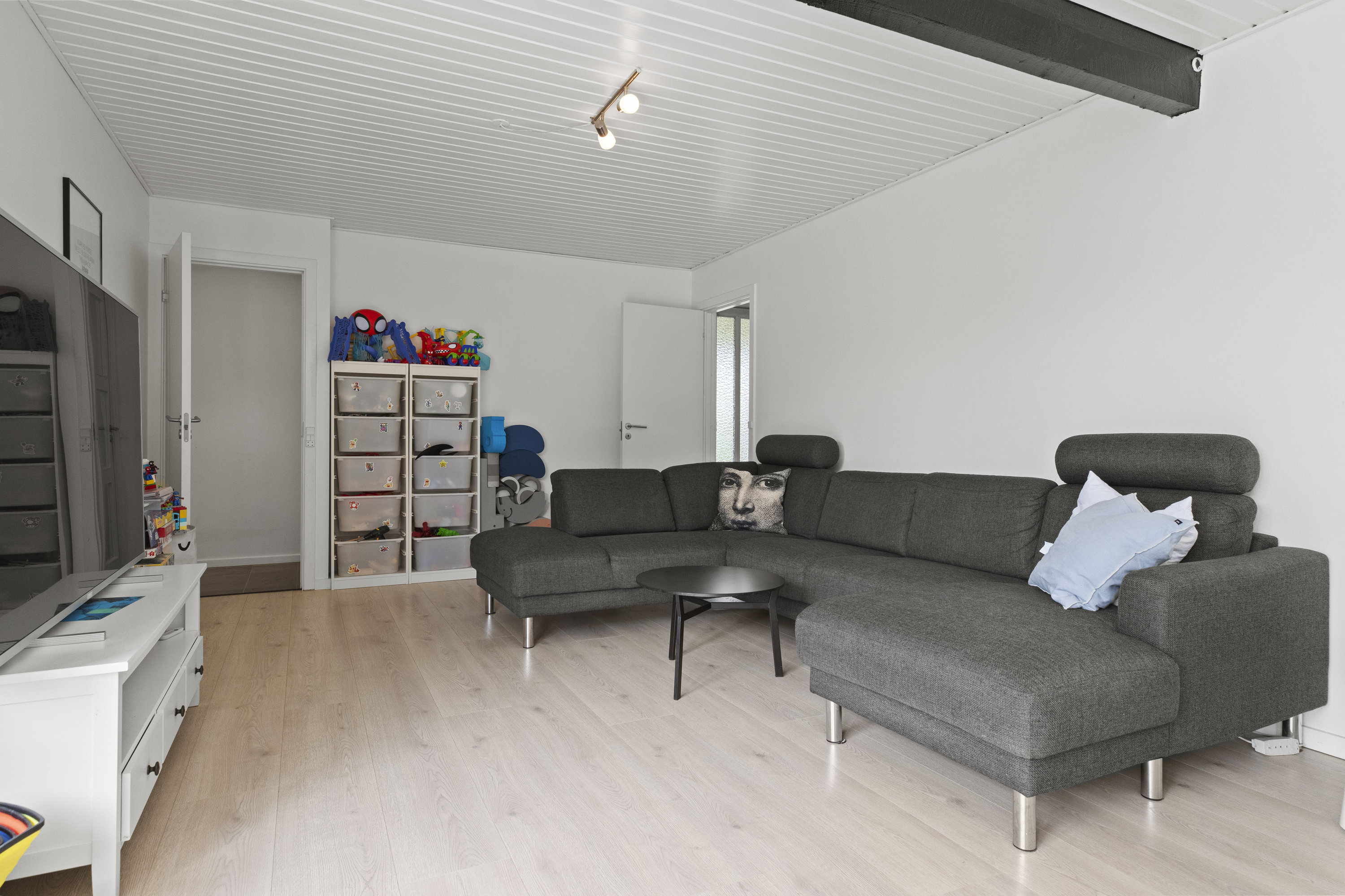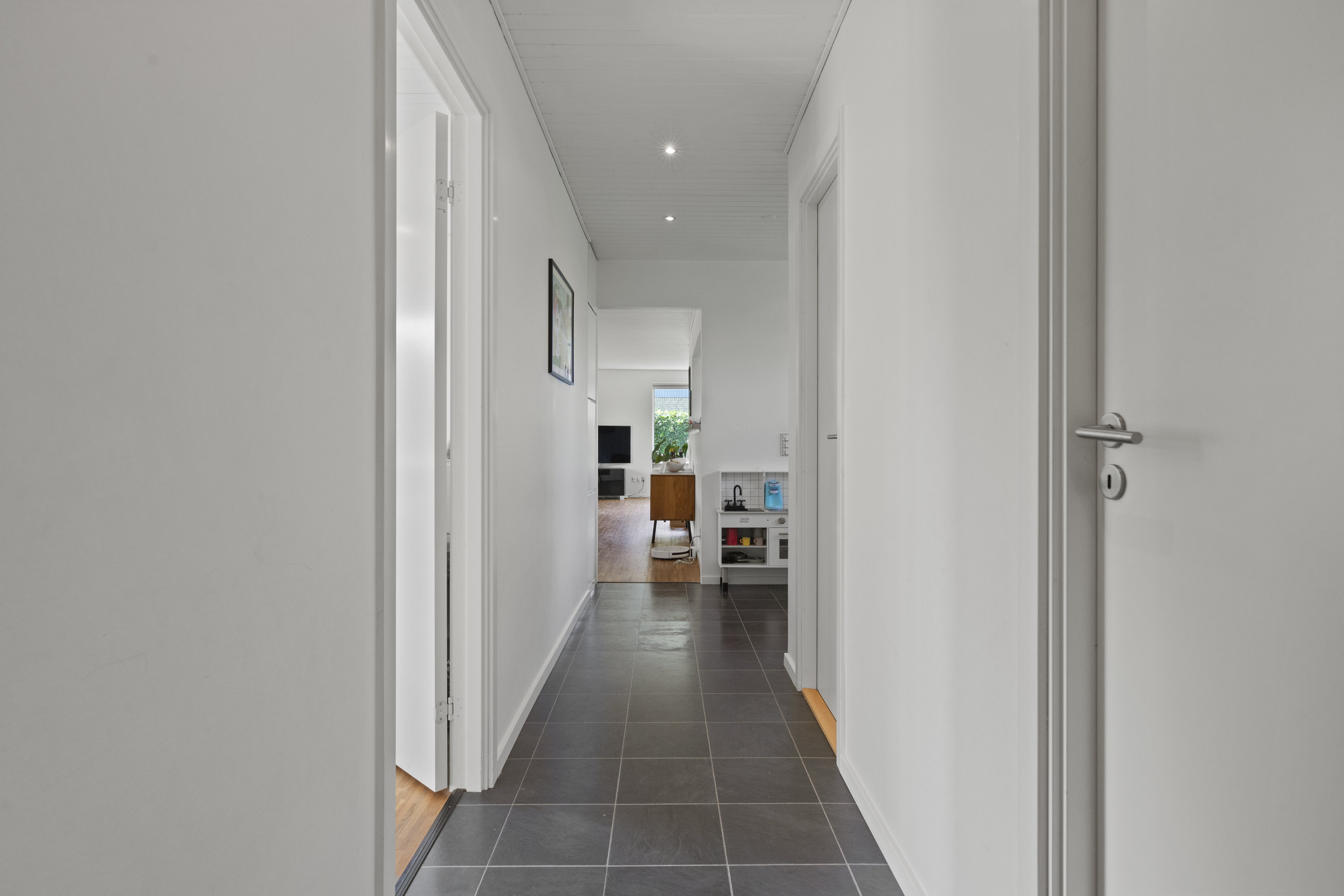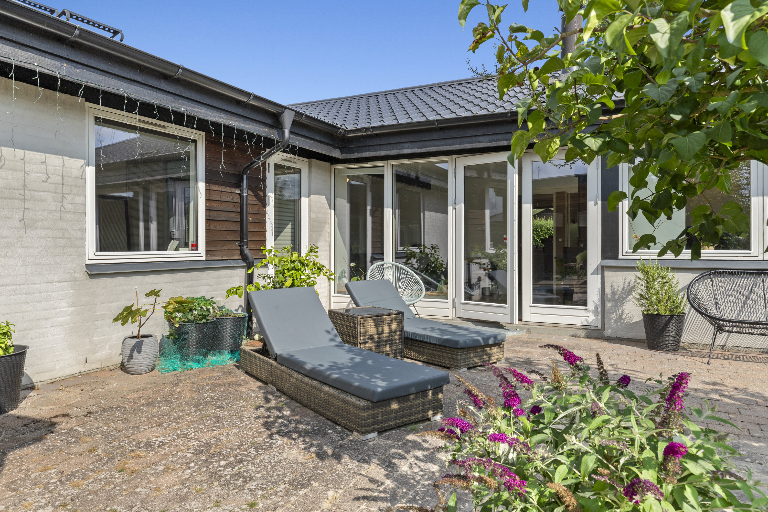 Lyset finder vej gennem de store vinduespartier og tegner skiftende mønstre hen over gulvene. Dejligt, hvidt køkken med grebsfrie elementer – stilrent og moderne med alt i integrerede hvidevarer – og med åbning til den store vinkelstue, hvor rummet indrettes naturligt i zoner: spisebordet her, sofa og bløde puder der. Den murede væg skaber karakter, og pejsen med brændeovnsindsats spreder varme og ro, mens nichen til brænde og nips sætter prikken over i’et. Der er fire værelser – tre samlet med et ekstra stueområde med brændeovn og udgang til haven. Et oplagt rum alrum, legerum, kreaplads eller hjemmekontor. Forældresoveværelset ligger mere uforstyrret med egen udgang til terrassen. Her kan døren stå på klem, mens fuglene hilser dagen velkommen og morgensolen falder ind. Gæstetoilet og to nyere badeværelser fuldender komforten – alle holdt i en lys og klassisk stil, der matcher husets gennemgående lethed.