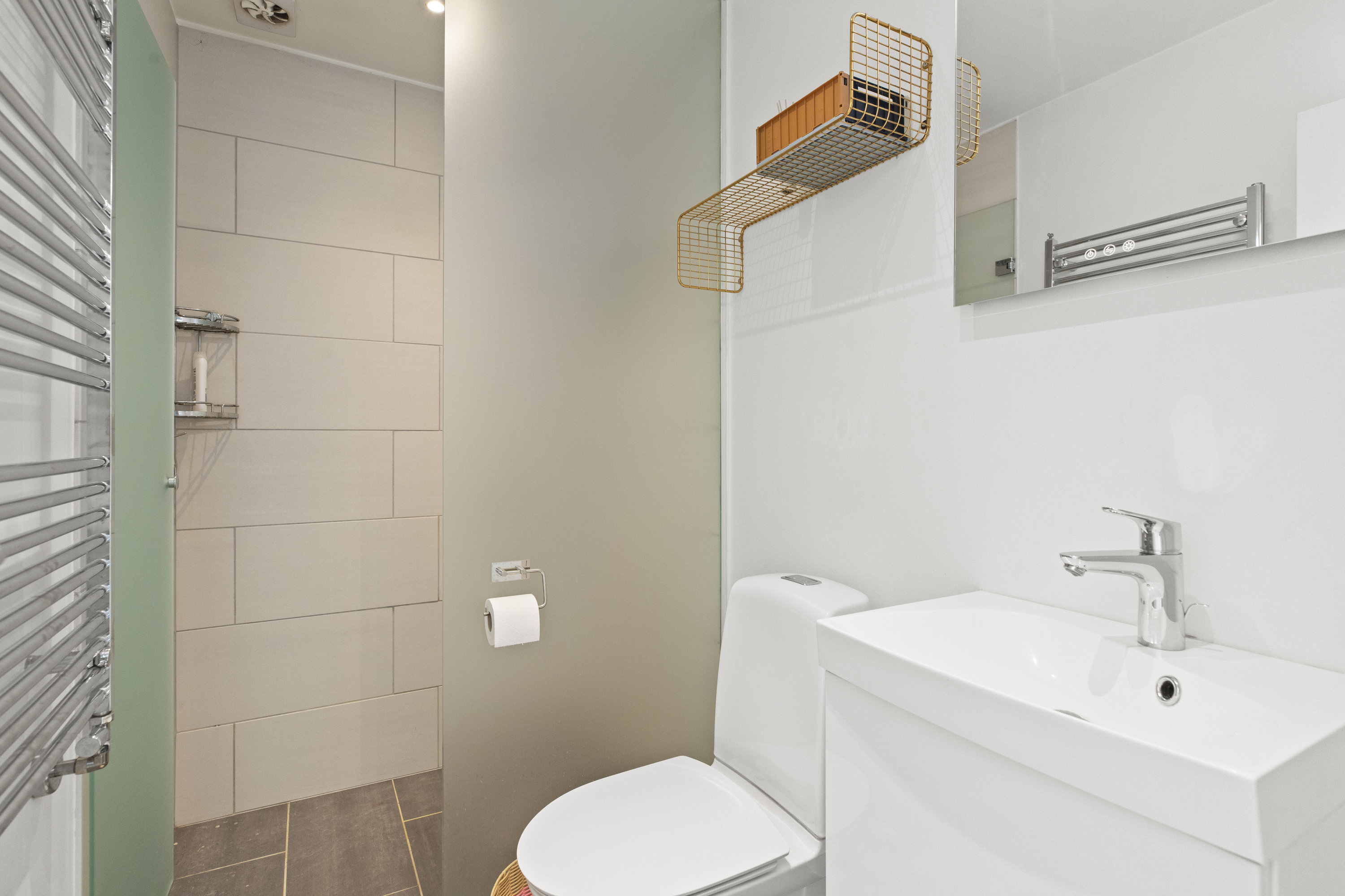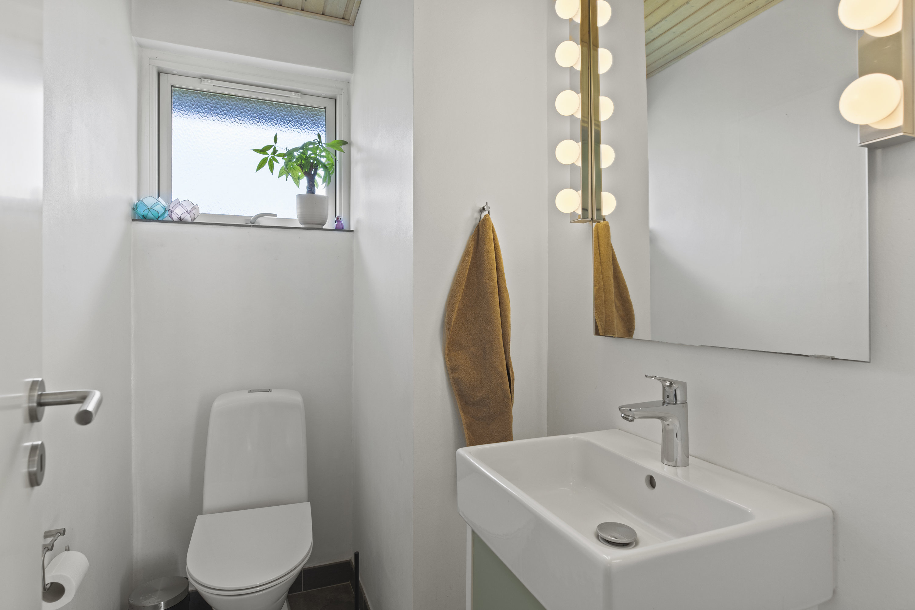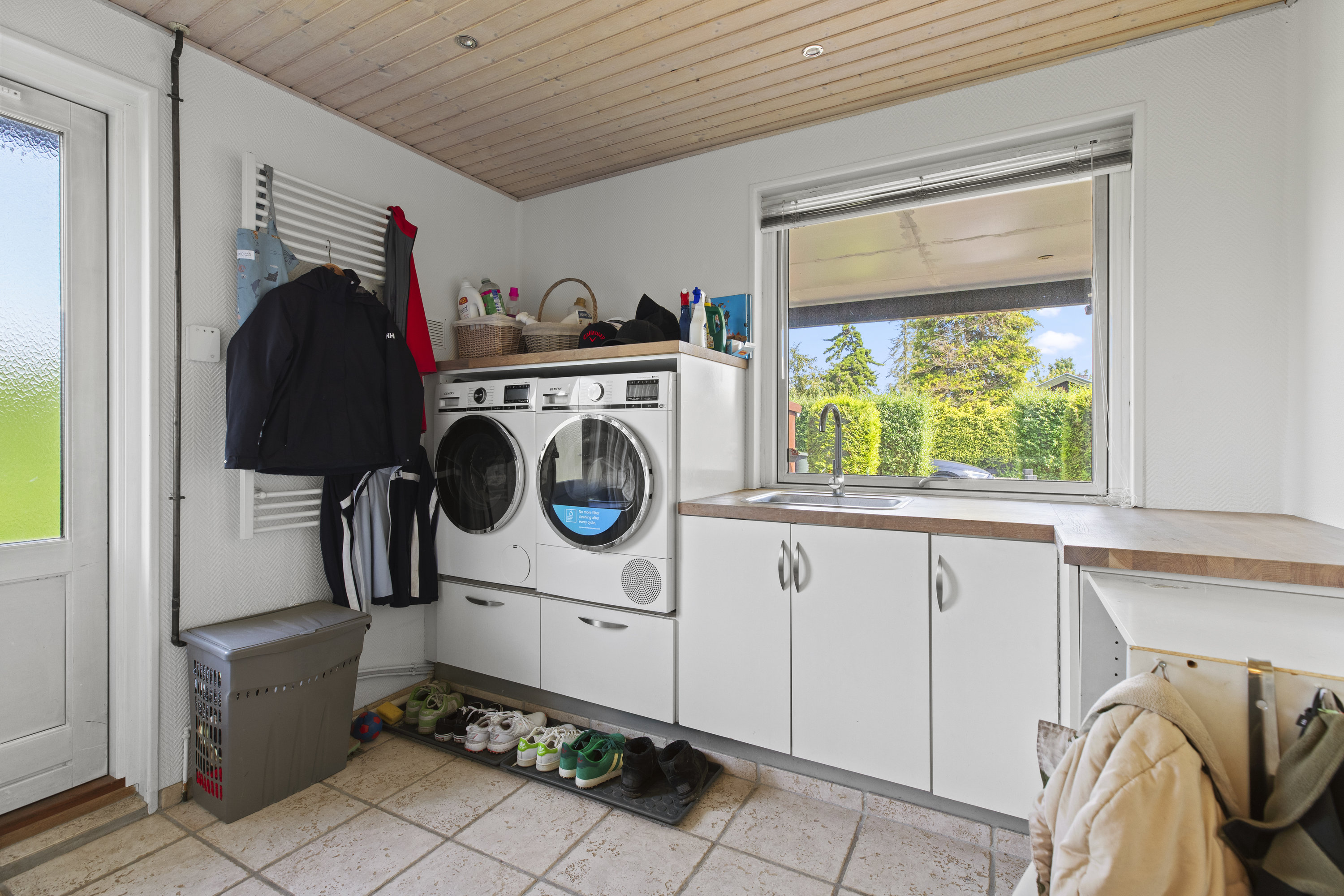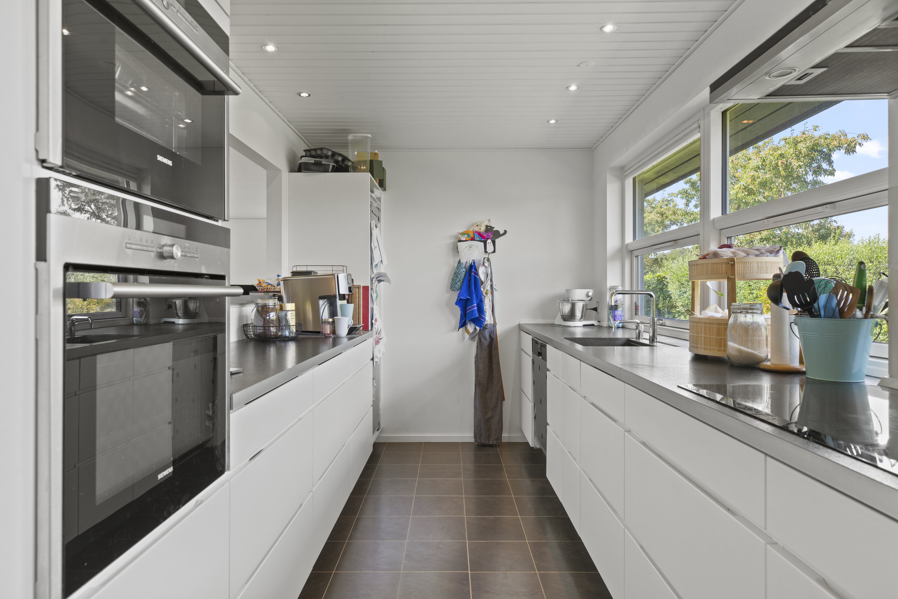 Lyset finder vej gennem de store vinduespartier og tegner skiftende mønstre hen over gulvene. Dejligt, hvidt køkken med grebsfrie elementer – stilrent og moderne med alt i integrerede hvidevarer – og med åbning til den store vinkelstue, hvor rummet indrettes naturligt i zoner: spisebordet her, sofa og bløde puder der. Den murede væg skaber karakter, og pejsen med brændeovnsindsats spreder varme og ro, mens nichen til brænde og nips sætter prikken over i’et. Der er fire værelser – tre samlet med et ekstra stueområde med brændeovn og udgang til haven. Et oplagt rum alrum, legerum, kreaplads eller hjemmekontor. Forældresoveværelset ligger mere uforstyrret med egen udgang til terrassen. Her kan døren stå på klem, mens fuglene hilser dagen velkommen og morgensolen falder ind. Gæstetoilet og to nyere badeværelser fuldender komforten – alle holdt i en lys og klassisk stil, der matcher husets gennemgående lethed.