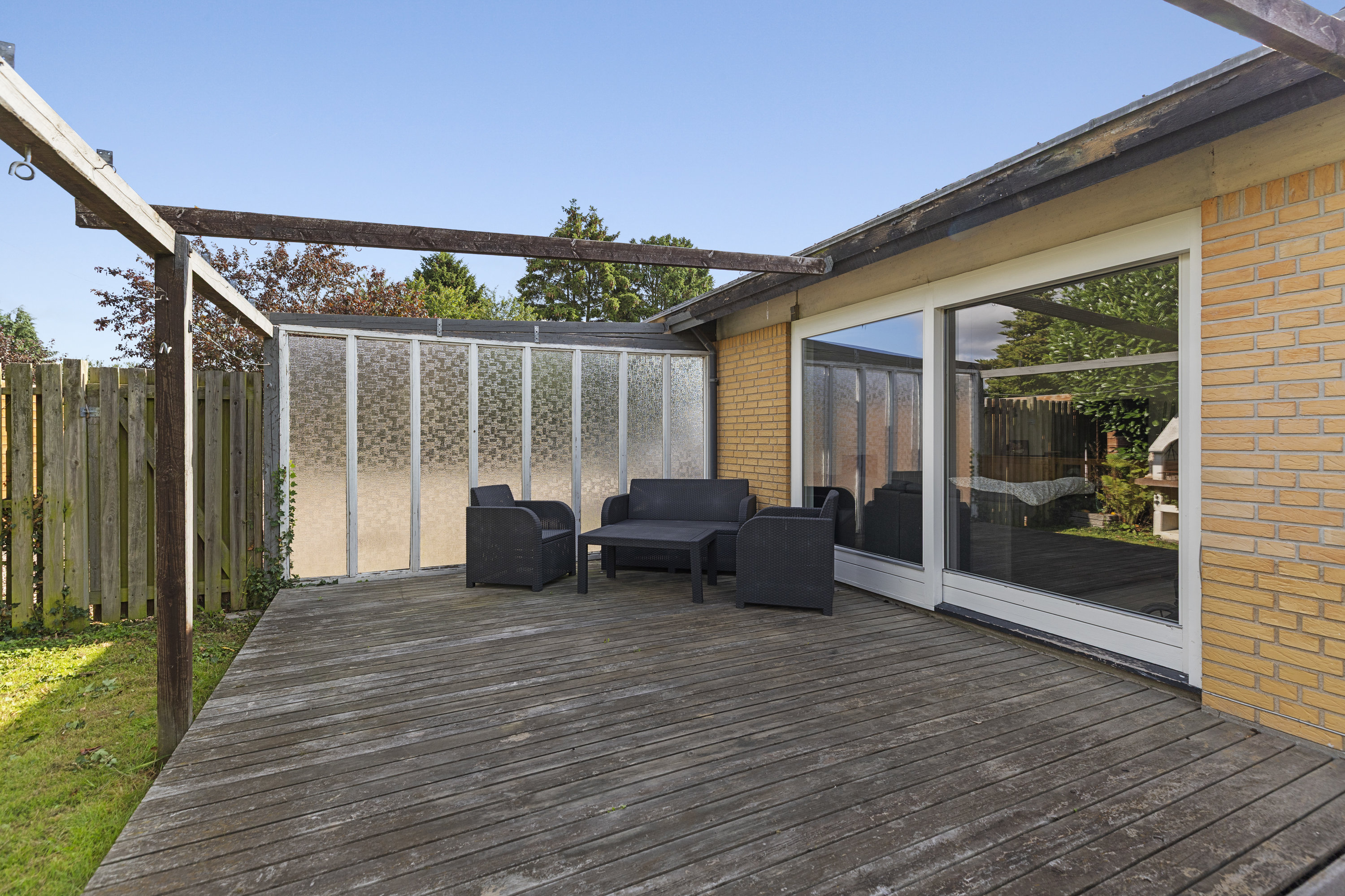 Boligen er både velholdt og velindrettet – et hjem, hvor rummene føles naturlige at bevæge sig i. Stuen rummer både plads til sofaens ro og spisestuens samvær, og de store vinduespartier trækker lyset ind fra haven. På den brede vindueskarm står blomster og bøger side om side og minder om, at her leves livet i små, rolige rytmer. En skydedør åbner mod terrassen, så dagen let flytter sig mellem ude og inde. Køkkenet ligger i naturlig forlængelse og giver plads til både madlavning og samtale. Her mødes familie og venner omkring bordet, mens lyset falder ind fra haven – og døren til fliseterrassen venter blot på, at du tager kaffen med ud. De tre værelser byder på både ro og fleksibilitet; to af dem med trappe til hems – små frirum under loftet til leg, læsning eller tanker i fred. Badeværelset er tidløst og gennemført med hvide fliser og muret bruseniche – enkelt, funktionelt og med en ro, der klæder hjemmet.