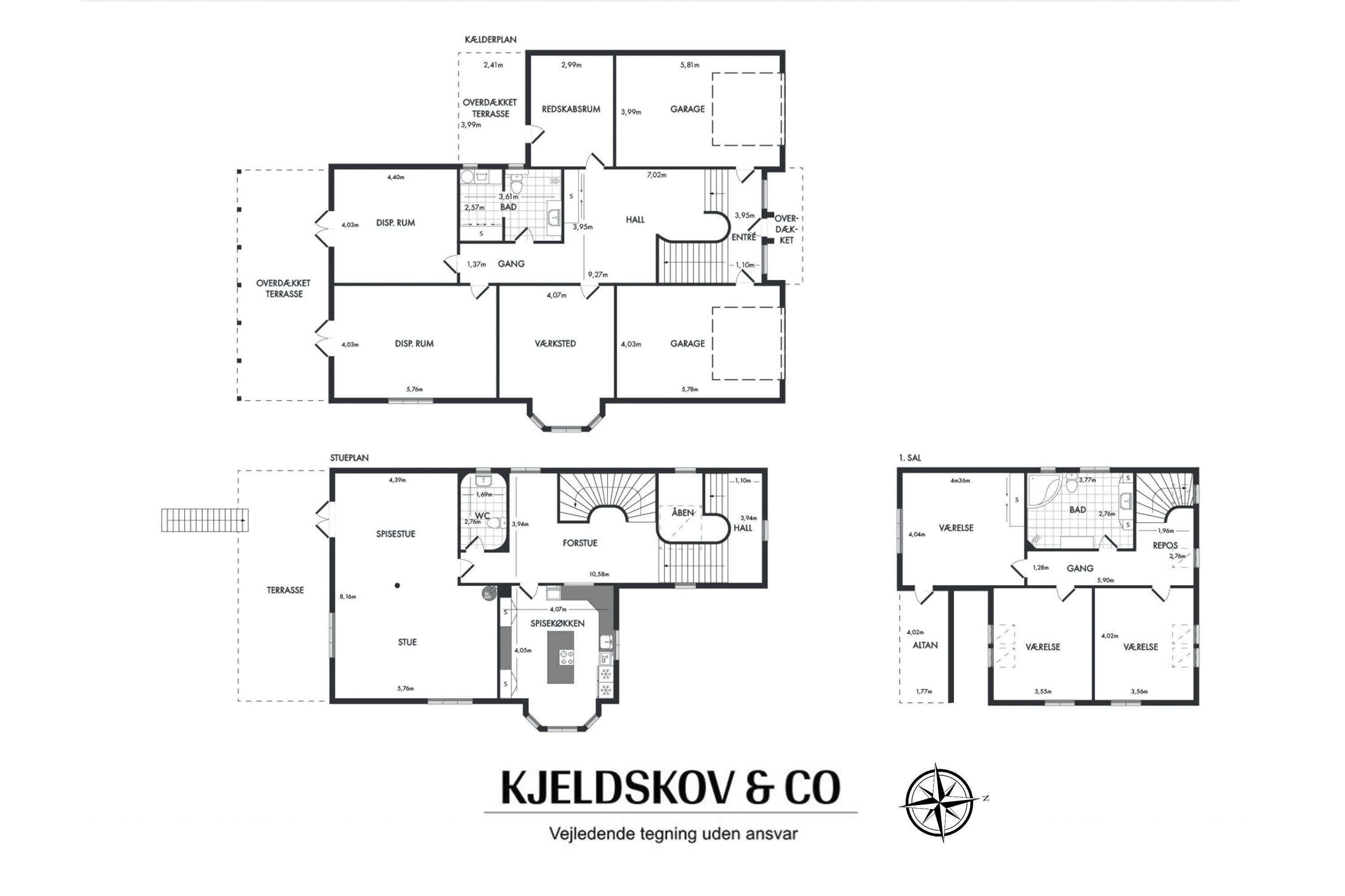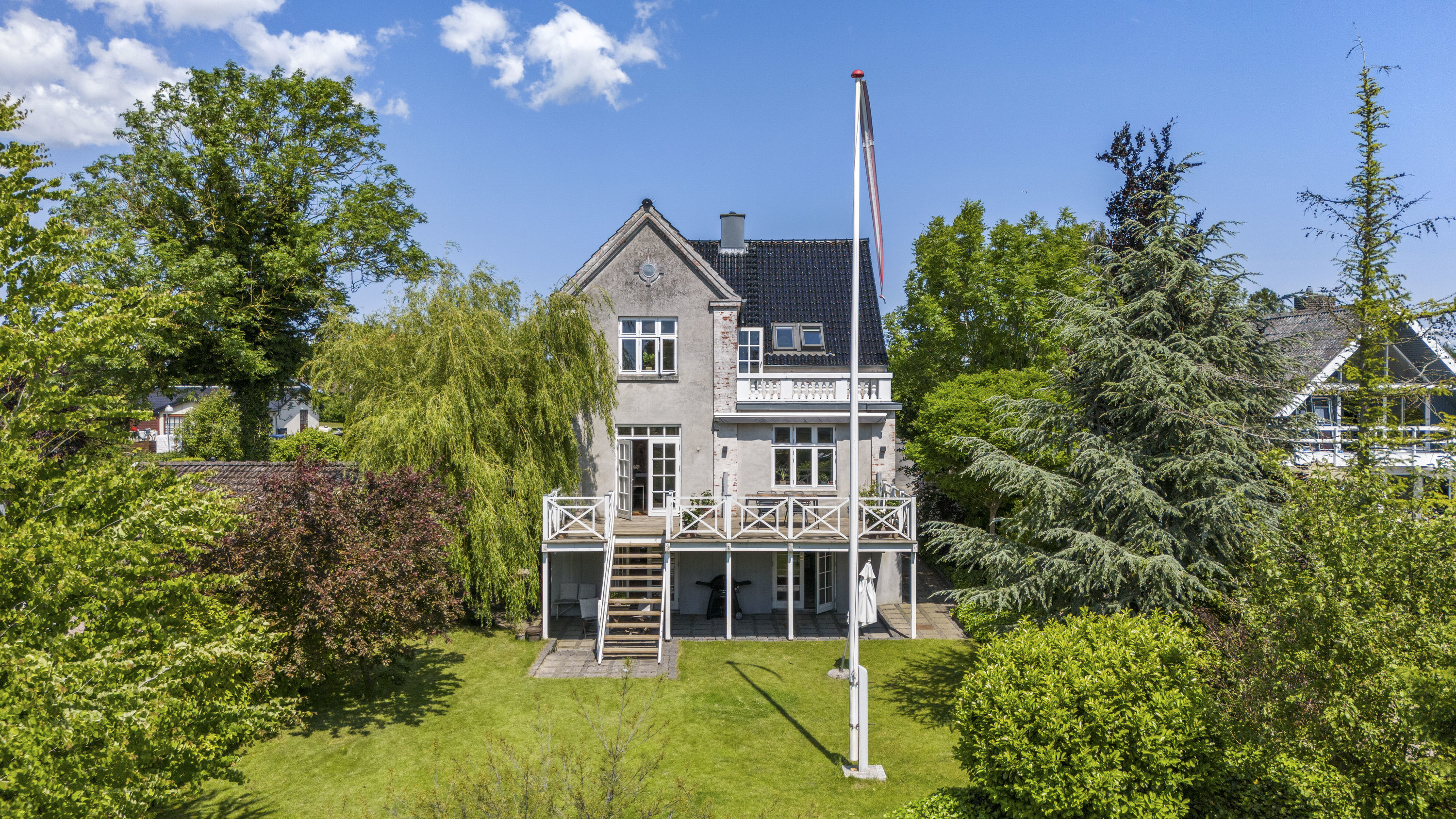 Hallen er et kapitel for sig – et stort, åbent rum med monumental trappe, der snor sig op omkring en stenskulptur og lader lyset falde ned fra det pyramideformede ovenlys. Et rum, man husker – næsten som en indendørs atriumgård. Træder du op, åbner stueplanet sig med varme og overskud. Her er brændeovn, udgang til terrassen og plads til både langbord og loungemøbler. I det vanillahvide højglans køkken fra Invita står en fritstående køkkenø og samler rummet. I karnappen kan morgenmaden nydes med kig til haven, og når isterningerne falder i glasset, er det bare at skåle med solen. Et gæstetoilet med rundbuet afslutning giver et lille, arkitektonisk nik til husets detaljerigdom. Den lyse underetage er mere end bare ekstra kvadratmeter – med egen udgang til haven og plads til alt fra teenageafdeling til hjemmekontor, vinrum eller kreative projekter. Badeværelset ligger her, praktisk og diskret. På førstesalen finder du tre værelser: to med kig til stjernehimlen og ét – forældresoveværelset – med en særlig altan. Her kan døren stå åben, når natten er lun, og dagen begynde med morgenkaffe i det fri og nyde kigget til vandet. Og bag det hele ligger teknikken solidt og moderne: luft-til-vand-varmepumpe, Genvex, IHC-styring, centralstøvsuger, hulmursisolering og praktisk vasketøjsskakt direkte til sorteringsskab i vaskerummet.